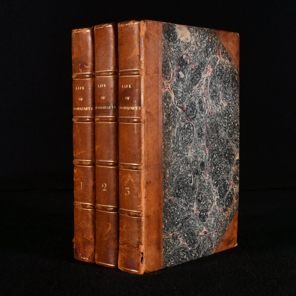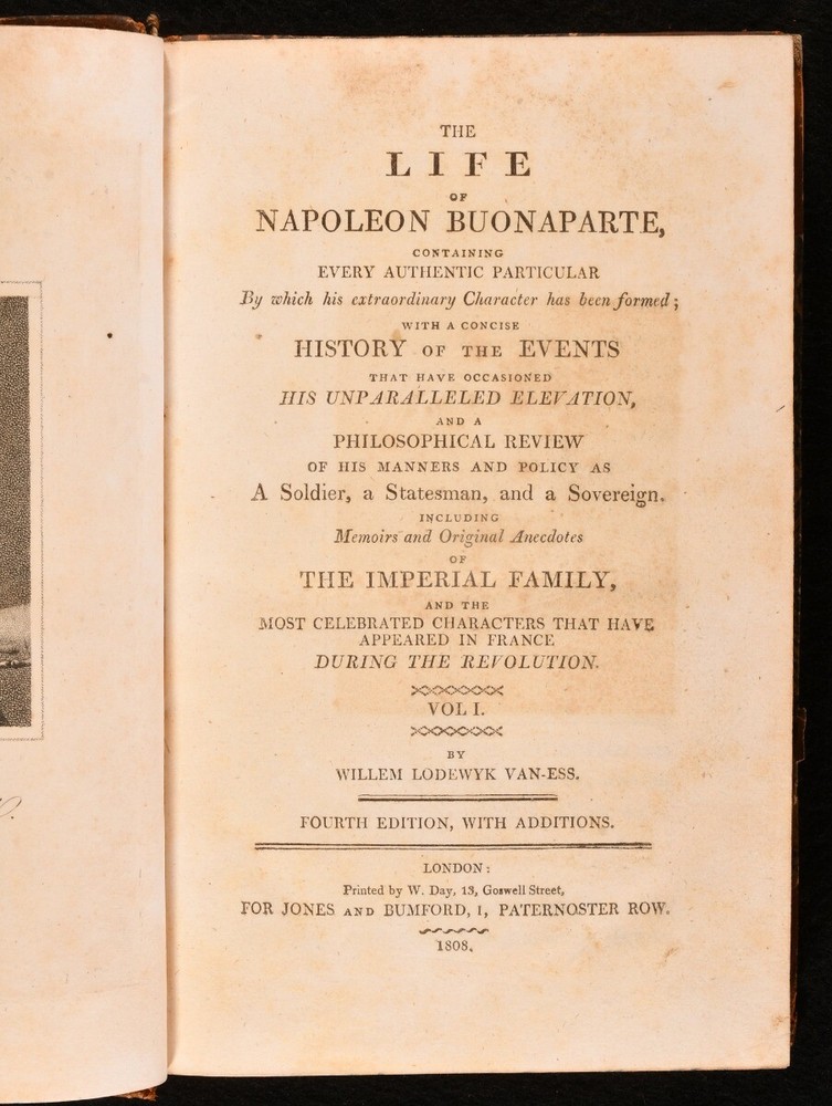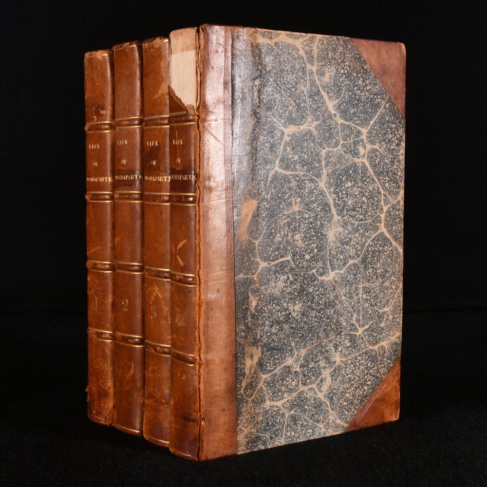 Click here to see our other books! The Life of Napoleon Buonaparte Willem Lodewyk Van-ess 1808-10 W. Day for Jones and Bumford : London 9" by 5.5" 452; 470; 467; 467pp SUMMARY A fourth edition of this scarce biographical work on Napoleon Bonaparte, illustrated with portraits and bound in contemporary leather. Illustrated,Leather Binding,Scarce Overall Condition: Good This book weighs 3 KG when packed UK Postage: £ 3.99 US Postage: £ 36.99 EU Postage : £ 25.99 European Postage: £ 27.99 Asia Postage: £ 47.99 Worldwide Postage: £ 69.99 DESCRIPTION A scarce biographical account of one of the most important military leaders in French history. Detailing his character, a philosophical examination of his manners and policies, and a concise history of his rise to power. Including anecdotes from the memoirs of the Imperial Royal Family as well as prominent figures of the French Revolution. In four volumes, which tell of events up until 1802; this work was later added to, with five more volumes published later. The fourth edition of this work, with additions. Each volume is illustrated with a frontispiece portrait, as well as numerous portraits bound to the rear of the work: I with fourteen, II with twelve, III with ten and IV with ten. Collated, complete. A scarce work, which first appeared in 1806. CONDITION In a half calf binding. Externally a trifle worn; loss to the head of the spine of volume four, and some rubbing to the heads and tails of the spines and extremities. Internally, generally firmly bound, with hinges just a touch tender. Pages are a little spotted, particularly plates. Overall Condition: Good GLOSSARY OF TERMS Overall Condition (Dustwrapper condition rating is shown after that for the book itself, where a dustwrapper is present) Fine - Very well preserved copy showing very little wear Very Good Indeed - Only one or two minor faults, really a very attractive copy Very Good - Quite a wide term meaning no major faults but probably several smaller ones often expected given the age of the book, but still a respectable copy Good - Meaning not very good. Some more serious faults as will be described in the condition report under 'condition' Good Only - Meaning one or more faults that could really do with repair Fair - As with good only above but with other faults leaving a compromised copy even after repair Poor - Really bad and possibly seriously incomplete. We only sell books in this condition where their rarity or value makes them attractive none the less. Major defects will be described. GUARANTEE We offer a full money back guarantee on our descriptions. Please ask for details and conditions. We prefer PAYPAL. If you pay via PAYPAL we will post the item off the same or the next working day with the postage you have selected. Please note we cannot accept USD cheques