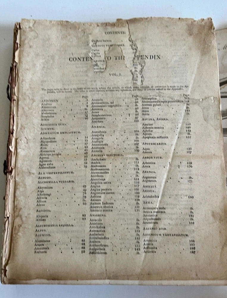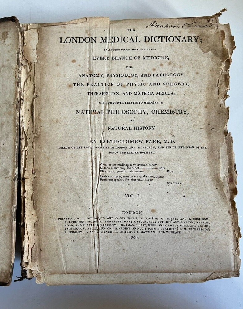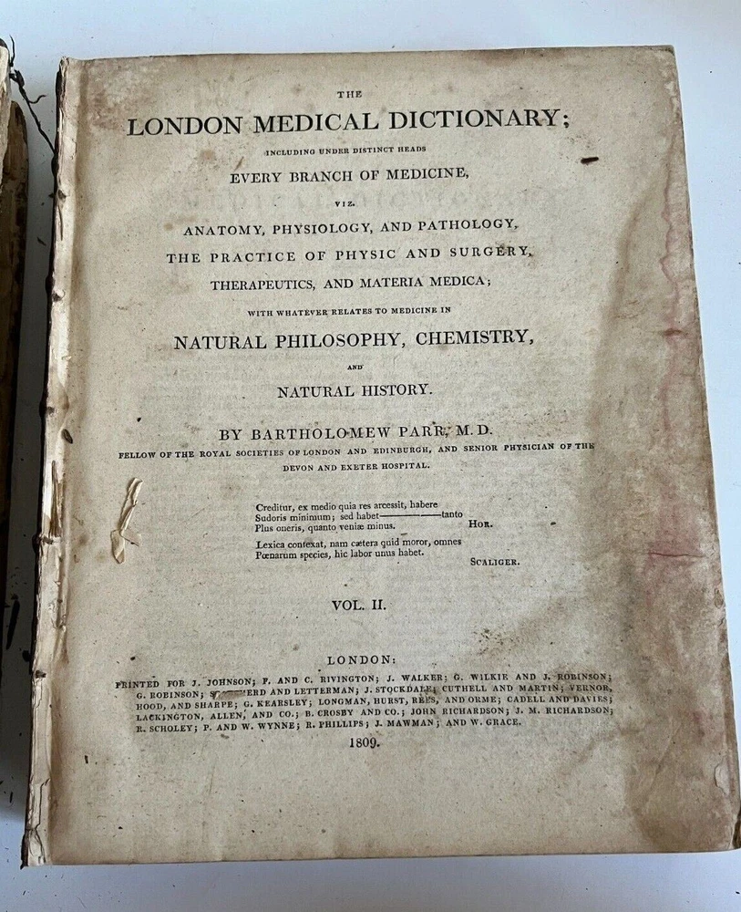 Author: Bartholomew Parr, MD Title: London Medical Dictionary - Vol I, 2 and Appendix Publisher : Printed For J. Johnson, St. Paul's Church Yard (1809) Description: Leather Hardcover. Appendix contains fold outs and 48 plates. I n poor antique condition. The pages are yellowed, discolored, brittle, water stained and water damage with loss along the edges. The spine in all three books and the pages are loose. None are missing. Appendix missing boards. Copyright 1809 Measures approximately 10 1/2" x 8 1/2" Please see photos. FAQs All items are examined and every attempt is made to describe them completely and accurately. However, most items are antique/vintage, and by virtue of their age will not be perfect. They are previously owned and may show very fine handling marks and shelf wear and will not be perfect. Upon receipt if you have any concerns please contact me! If for any reason you are inclined to rate your experience less than five stars contact me first - lets discuss. Customer support is important to me as is your satisfaction! Combined Shipping? Yes, we do, and you will save $$ when you buy more than 1 item from us. Will my item be insured in transit? Yes, automatically by ShipSaver, the Post Office or Self Insurance. How will it be packed? Professionally! In bubble wrap with plenty of clean, recycled products and packaging tape for security. How can I pay? PayPal or other- Contact us if you need other payment method. Sorry, but after 7 days' of non-payment, eBay gets involved. Any issue, please talk to us! THANK YOU for shopping with P-B-Antiques inkfrog terapeak Listing and template services provided by inkFrog
