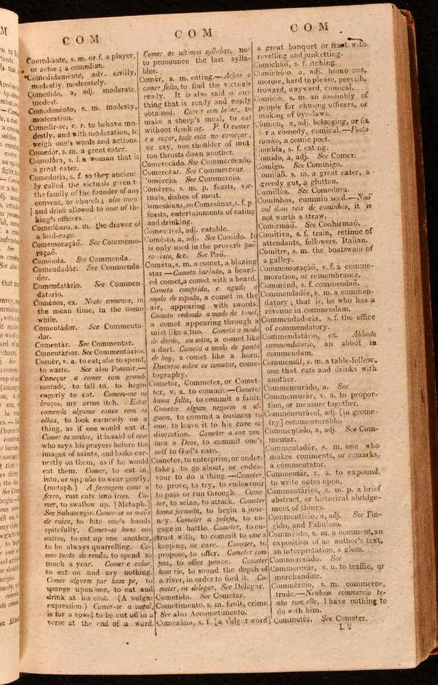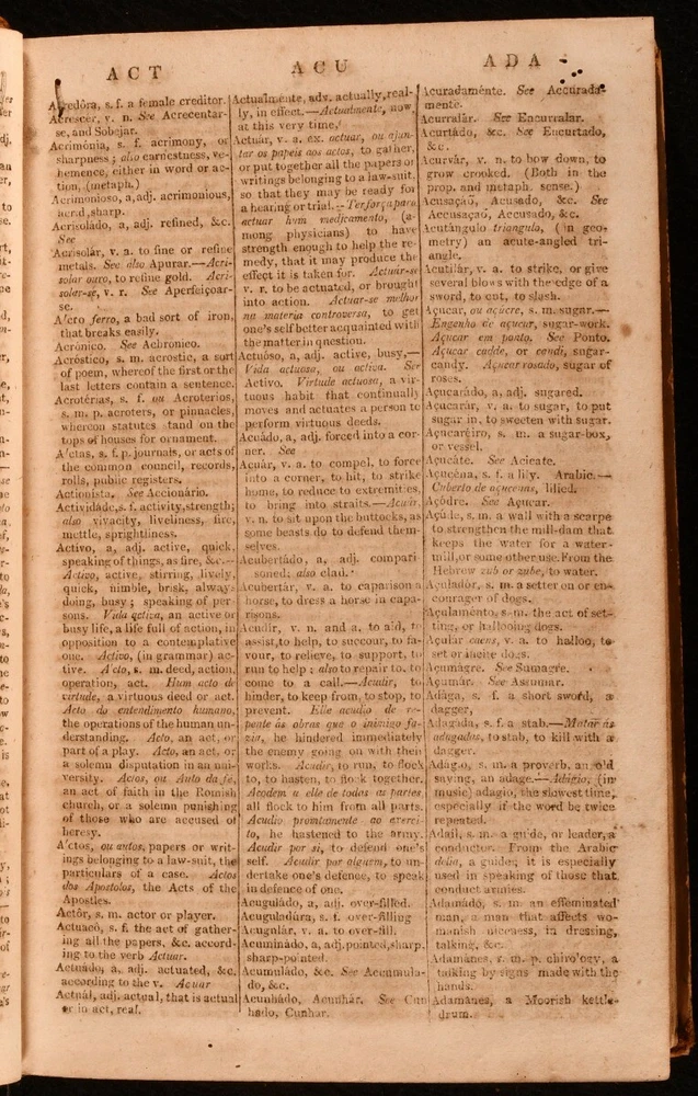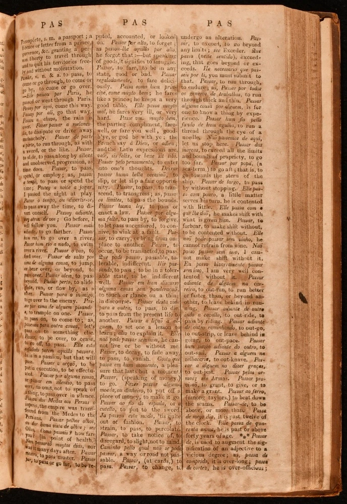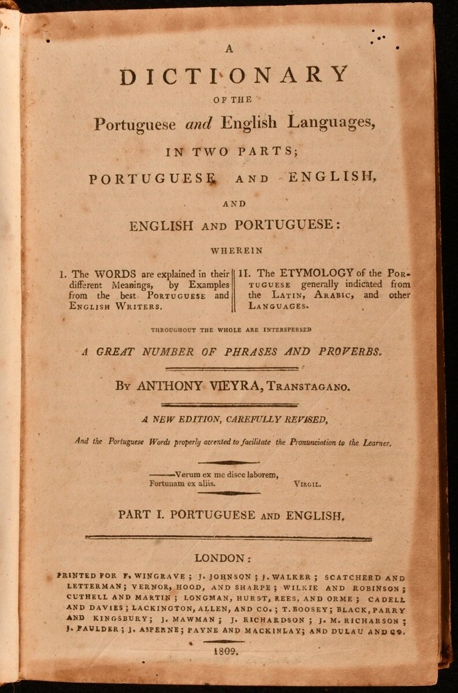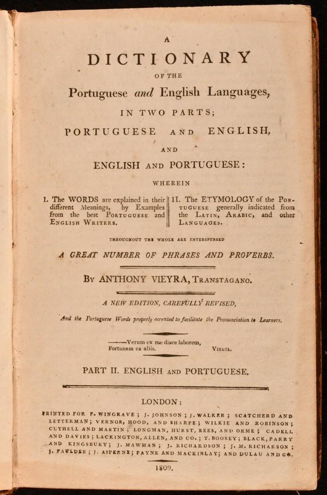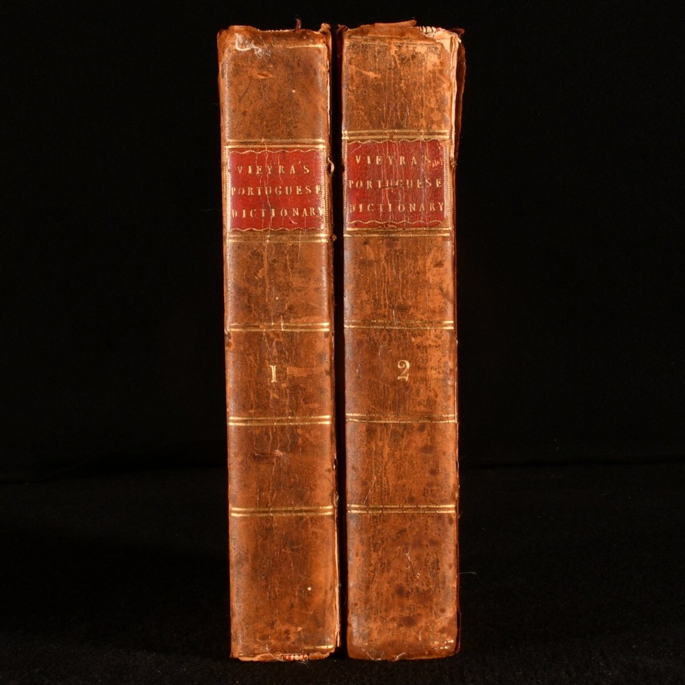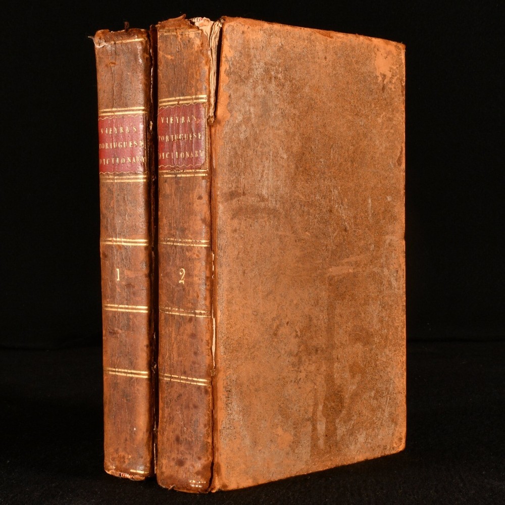 Click here to see our other books! A Dictionary of the Portuguese and English Languages, in Two Parts Anthony Vieyra 1809 F. Wingrave; J. Johnson et al. : London 9" by 6" Unpaginated SUMMARY A smart early nineteenth century edition of Anthony Vieyra's Portuguese-English dictionary. Leather Binding Overall Condition: Good This book weighs 2 KG when packed UK Postage: £ 3.99 US Postage: £ 29.99 EU Postage : £ 21.99 European Postage: £ 23.99 Asia Postage: £ 37.99 Worldwide Postage: £ 38.99 DESCRIPTION A new edition, complete in two volumes. First published in 1773, Vieyra was a professor of Italian and Portuguese in London, and later became Regis Professor of Spanish at the University of Dublin. In the same period, he authored a useful Portuguese Grammar. Consisting of Part I, wherein Portuguese words are provided - 'properly accented to facilitate the pronunciation of the learner' - alongside their English meaning, and Part II, in which English words are provided, and their definitions supplied in Portuguese. With the label of a Lisbon based bookseller to the front pastedown of volume I. A smart copy of this impressive early nineteenth century English-Portuguese dictionary. CONDITION In full calf bindings. Front joints starting, with boards holding firm. Significant rubbing to board perimeters and back strips, with small loss of leather to tail of volume I and head of volume II. Rear hinges starting, but firmly held. Bookseller's label to front pastedown of volume I. Light worming to head of front pastedown and to the head of each leaf for the first third of volume I, not affecting text. Internally, firmly bound. Areas of spotting and foxing throughout, most prominent to volume I. Overall Condition: Good GLOSSARY OF TERMS Overall Condition (Dustwrapper condition rating is shown after that for the book itself, where a dustwrapper is present) Fine - Very well preserved copy showing very little wear Very Good Indeed - Only one or two minor faults, really a very attractive copy Very Good - Quite a wide term meaning no major faults but probably several smaller ones often expected given the age of the book, but still a respectable copy Good - Meaning not very good. Some more serious faults as will be described in the condition report under 'condition' Good Only - Meaning one or more faults that could really do with repair Fair - As with good only above but with other faults leaving a compromised copy even after repair Poor - Really bad and possibly seriously incomplete. We only sell books in this condition where their rarity or value makes them attractive none the less. Major defects will be described. GUARANTEE We offer a full money back guarantee on our descriptions. Please ask for details and conditions. We prefer PAYPAL. If you pay via PAYPAL we will post the item off the same or the next working day with the postage you have selected. Please note we cannot accept USD cheques