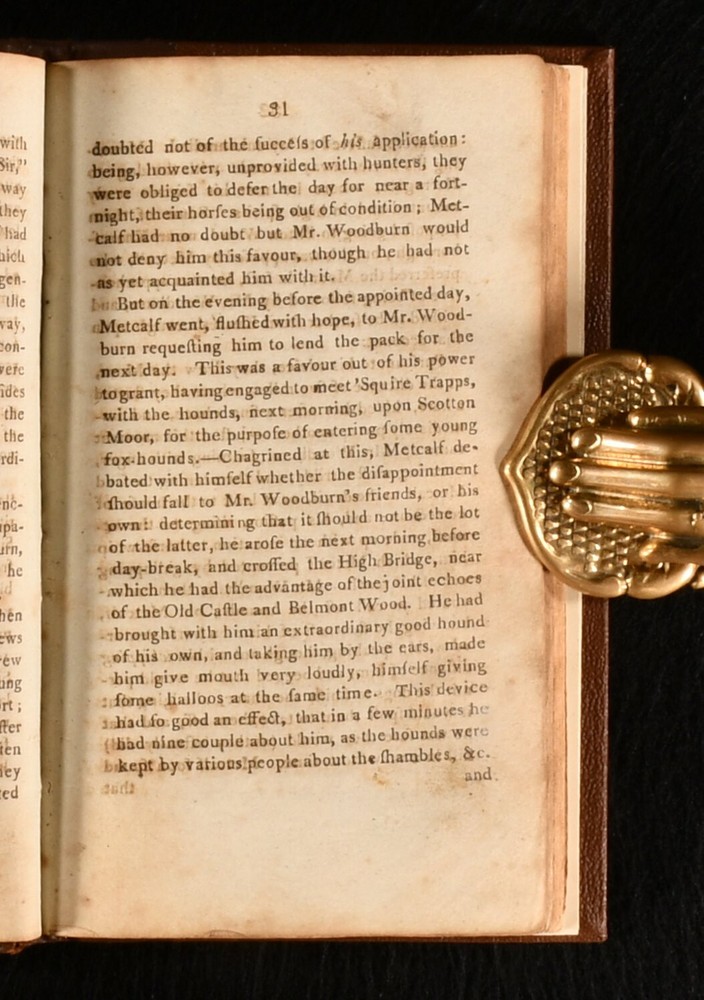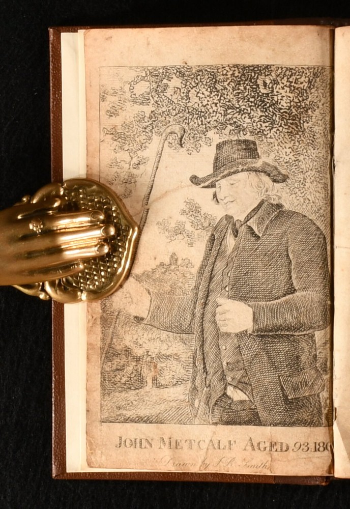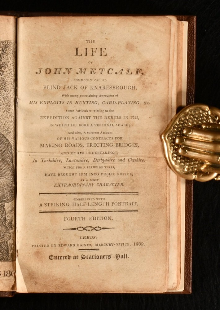 Click here to see our other books! The Life of John Metcalf, Commonly Called Blind Jack of Knaresbrough, With Many Entertaining Anecdotes of His Exploits in Hunting, Card-Playing, &c, Some Particulars Relating to the Expedition Against the Rebels in 1745, in Which he Bore a Personal Share; and Also, a Succinct Account of His Various Contracts for Making Roads, Erecting Bridges, and Other Undertakings, in Yorkshire, Lancashire, Derbyshire, and Cheshire; Which, for a Series of Years, Have Brought Him into Public Notice, as a Most Extraordinary Character Anonymous 1809 Edward Baines : Leeds 7" by 4" [3], iv, [1], vi-vii, [1], ix, [1], 11-140pp SUMMARY An uncommon fourth edition of this touching first hand account of the life of John Metcalf, the father of the modern road, illustrated with a frontispiece, and rebound in a nice quarter calf binding. Illustrated,Leather Binding,Rebound Overall Condition: Very Good This book weighs 0.5 KG when packed UK Postage: £ 3.99 US Postage: £ 15.99 EU Postage : £ 13.99 European Postage: £ 14.99 Asia Postage: £ 18.99 Worldwide Postage: £ 19.99 DESCRIPTION The fourth edition of this work. An uncommon early edition of this work. Illustrated with a frontispiece. Collated, complete. Collated from Jisc from a copy held at the York Minster. A biography on the life of John Metcalf, who was also known as Blind Jack of Knaresborough or Blind Jack Metcalf. Metcalf was the first professional road builder during the Industrial Revolution. He was blind from the age of six, when he lost his sight after a smallpox infection. Despite his sight loss, he was accomplished in many fields, including diving, swimming, cary playing, and playing the fiddler. During the Industrial Revolution he build about one-hundred and eighty miles of turnpike road, mostly in the north of England. This prolificity earned his the reputation as being one of the fathers of the modern road. Written anonymously, though the biography was documented by his own account, just before he died. CONDITION Rebound in a quarter morocco binding with cloth to the boards. Externally, smart. Light bumping to the head and tail of the spine. A small amount of rubbing to the spine. Internally, firmly bound. Pages are age-toned with some spots. Frontispiece is repaired, with an additional leaf adhered to the reverse, repairing a long closed tear. Prior owner's ink inscription to the tail of page 140, 'William ... Barton'. Overall Condition: Very Good GLOSSARY OF TERMS Overall Condition (Dustwrapper condition rating is shown after that for the book itself, where a dustwrapper is present) Fine - Very well preserved copy showing very little wear Very Good Indeed - Only one or two minor faults, really a very attractive copy Very Good - Quite a wide term meaning no major faults but probably several smaller ones often expected given the age of the book, but still a respectable copy Good - Meaning not very good. Some more serious faults as will be described in the condition report under 'condition' Good Only - Meaning one or more faults that could really do with repair Fair - As with good only above but with other faults leaving a compromised copy even after repair Poor - Really bad and possibly seriously incomplete. We only sell books in this condition where their rarity or value makes them attractive none the less. Major defects will be described. GUARANTEE We offer a full money back guarantee on our descriptions. Please ask for details and conditions. We prefer PAYPAL. If you pay via PAYPAL we will post the item off the same or the next working day with the postage you have selected. Please note we cannot accept USD cheques