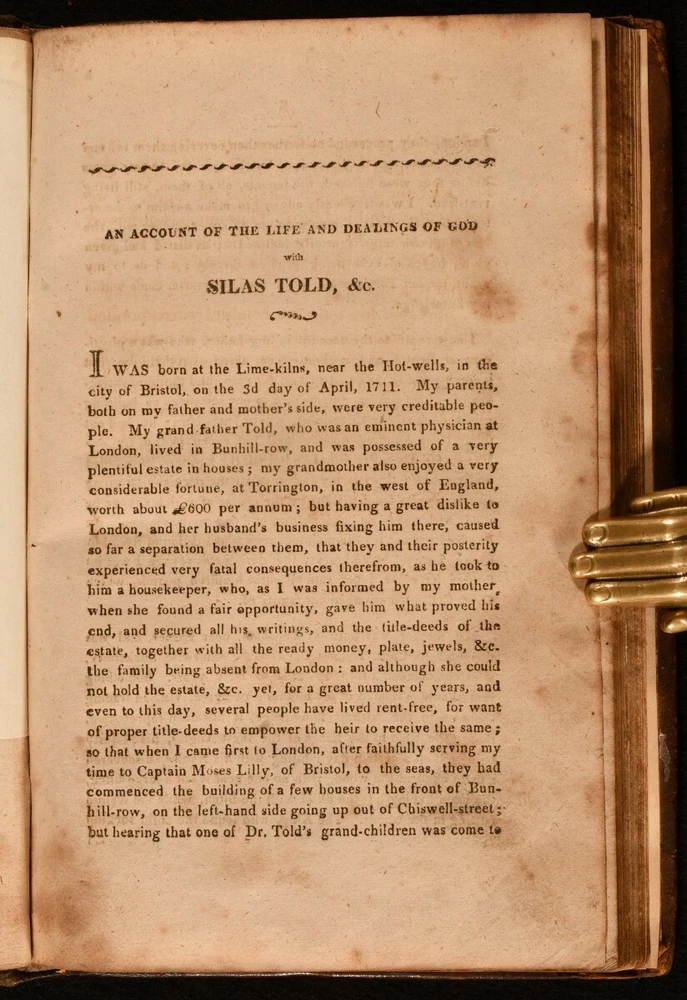 Click here to see our other books! An Account of the Dealings of God with Silas Told, Late Preacher of the Gospel Silas Told 1810 W. Cowdroy : Salford 8.5" by 6" vi [1], 3-134pp SUMMARY A smart copy of Silas Told's scarce account of his tumultuous life, spent aboard slaving voyages in his youth, and as a prison chaplain in his later years. Illustrated,Scarce Overall Condition: Very Good This book weighs 0.75 KG when packed UK Postage: £ 3.99 US Postage: £ 19.99 EU Postage : £ 15.99 European Postage: £ 16.99 Asia Postage: £ 21.99 Worldwide Postage: £ 25.99 DESCRIPTION Scarce in all contemporary editions, Silas Told's autobiographical work was first published posthumously, in 1785. Retaining the original half title, and with the frontispiece, captioned 'Silas Told attending Mr Brownrigg to the place of execution' bound in to the rear. A former owner's pen and ink illustration of this same scene, captioned 'Wm Hogarth 1747' - though not in Hogarth's hand - is bound in after the preface. Silas Told was born in Bristol in 1711, attending Colston's school as a charity pupil. At the age of fourteen, Silas was apprenticed on board a slaver's ship. Falling ill on the voyage, he was abandoned in Jamaica, and suffered repeated beatings and abuse. He was handed over to the notorious slave captain, Timothy Tucker, and suffered further cruelties. Able to read and write, unlike most of his contemporaries, he kept a record of the voyage, and upon returning to England became a Methodist preacher. He ended his days as a chaplain to prisoners who were condemned to hang at Newgate Prison in London. This work, recounting his life experiences, was published by his Methodist friends after his death, as they wanted to spread the story of Told’s conversion to the religion, and use it to show the cruelties of the slave trade. CONDITION Rebacked in morocco, retaining original calf boards. Endpapers renewed. Small handwritten title label to spine. Externally, excellent. Internally, firmly bound. Pages significantly age toned, with spotting throughout, most concentrated to first and last few leaves. With a former owner's illustration bound in following the preface. Overall Condition: Very Good GLOSSARY OF TERMS Overall Condition (Dustwrapper condition rating is shown after that for the book itself, where a dustwrapper is present) Fine - Very well preserved copy showing very little wear Very Good Indeed - Only one or two minor faults, really a very attractive copy Very Good - Quite a wide term meaning no major faults but probably several smaller ones often expected given the age of the book, but still a respectable copy Good - Meaning not very good. Some more serious faults as will be described in the condition report under 'condition' Good Only - Meaning one or more faults that could really do with repair Fair - As with good only above but with other faults leaving a compromised copy even after repair Poor - Really bad and possibly seriously incomplete. We only sell books in this condition where their rarity or value makes them attractive none the less. Major defects will be described. GUARANTEE We offer a full money back guarantee on our descriptions. Please ask for details and conditions. We prefer PAYPAL. If you pay via PAYPAL we will post the item off the same or the next working day with the postage you have selected. Please note we cannot accept USD cheques