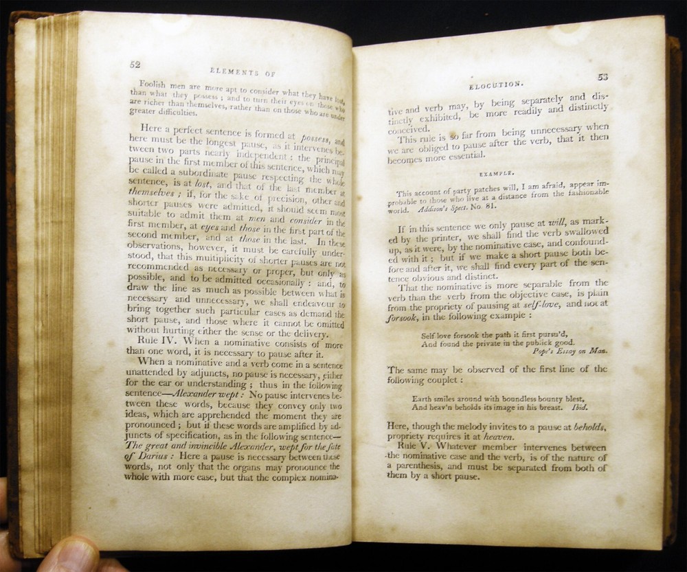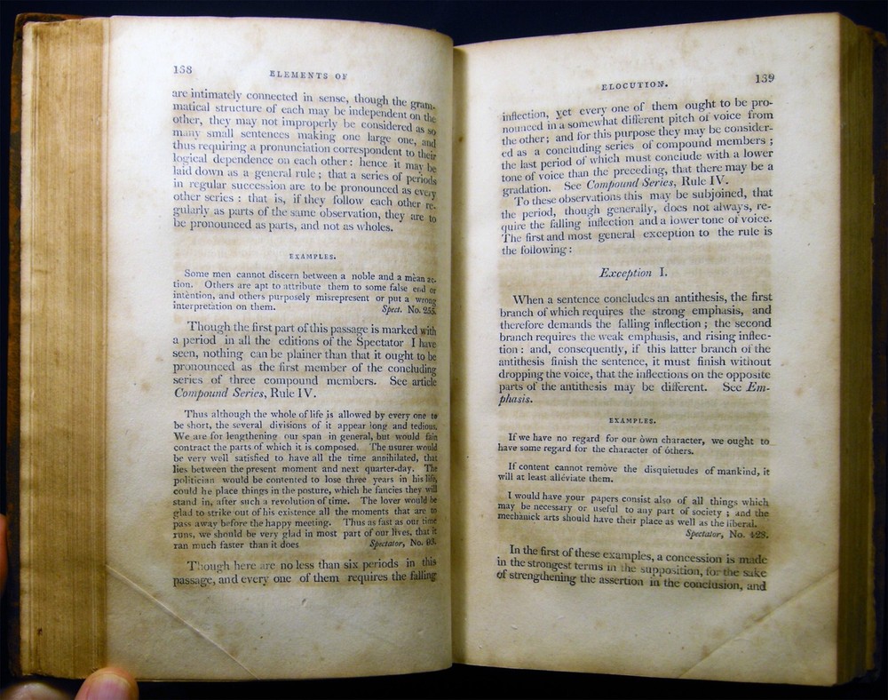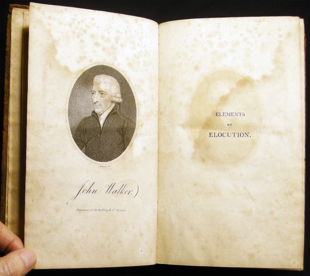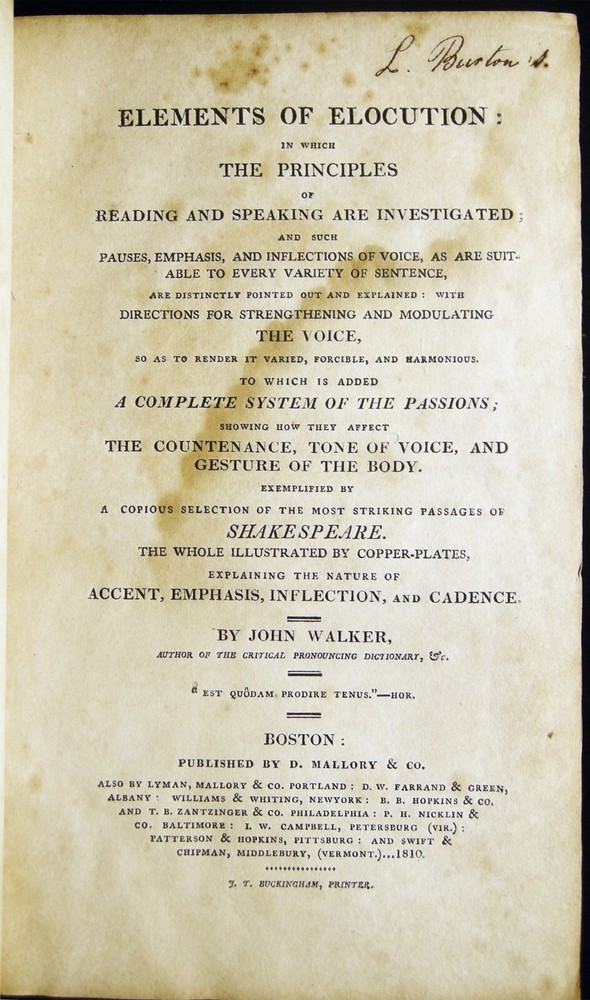 [029225] Walker, John. Elements of Elocution: In Which the Principles of Reading and Speaking are Investigated.... Boston, Mass.: Published By D. Mallory & Co. Et al, 1810. 379 pages; portrait frontispiece engraving of John Walker by Edwin; with several illustrated plates within the text. Previous owner signature at top of title page of L. Burton; back endpaper with a short, penciled notation. John Walker (1732 - 1807) British elocutionist, orthoepist, and lexicographer; "...ideas on elocution continued to be influential throughout the nineteenth century, but it is as an orthoepist and lexicographer that he is best known..." (Joan C. Beal in the ODNB) Approx. 5 1/2" x 8 1/2" size; full polished leather binding, gilt titles & simple line-rules. Covers & spine very worn & rubbed; chipped at top of spine covering; some spotting and foxing & old damp-discoloration; in about good condition.