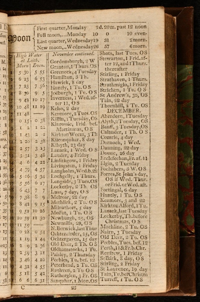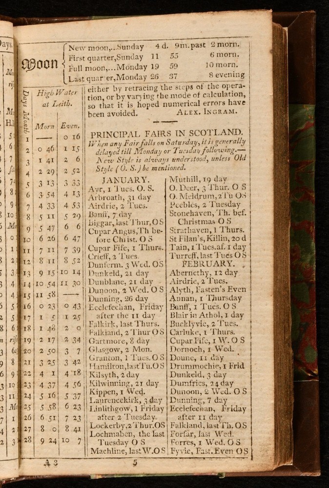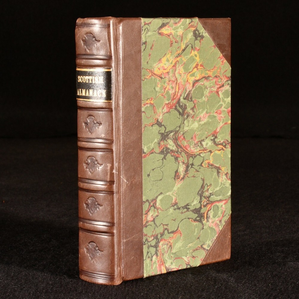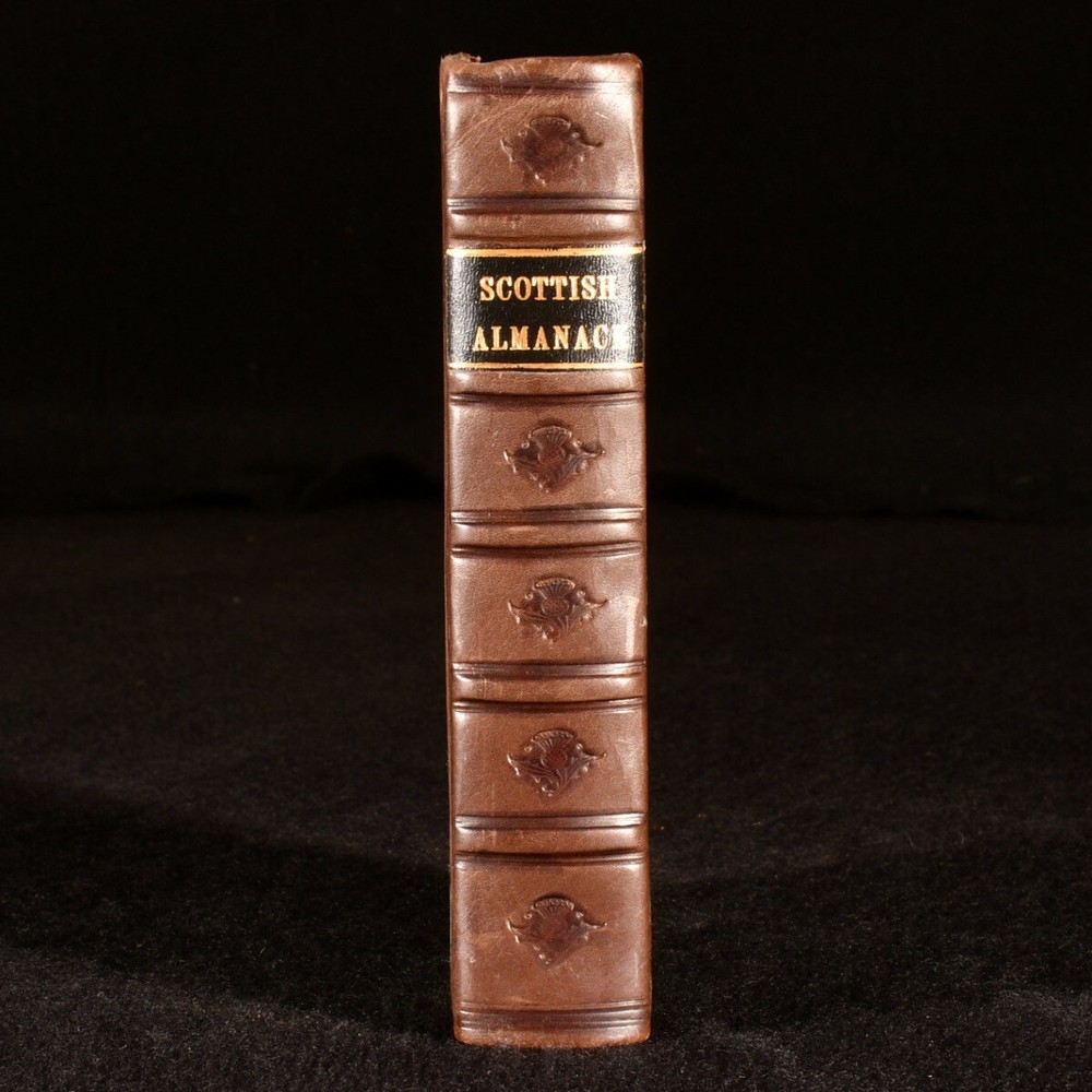 Click here to see our other books! The General Almanack of Scotland, and British Register for 1810 Not Stated 1810 David Ramsay; Robert Allan; John Watson : Edinburgh 6" by 4" 2-324pp SUMMARY The very scarce 1810 edition of the General Almanack of Scotland. First Edition,Leather Binding,Rebound,Very Scarce Overall Condition: Very Good This book weighs 0.5 KG when packed UK Postage: £ 3.99 US Postage: £ 15.99 EU Postage : £ 13.99 European Postage: £ 14.99 Asia Postage: £ 18.99 Worldwide Postage: £ 19.99 DESCRIPTION This very scarce and impressively detailed reference work provides information on taxes, stamp duties, fairs, and roads, while also detailing the British army and navy lists for the year. The almanack includes a calendar of public holidays, information on full moons, a gardener's calendar, conversion tables, and information on Scottish solicitors and clerks. A contemporary owner has annotated a front blank with information on 'list of stamps for bills of exchange & notes - Ireland'. With a contemporary stamp, dated 1809, to the verso of the title page. In a smart half calf binding. Endpapers renewed. CONDITION Rebound in half calf, with marbled paper covered boards. Bump to spine head, otherwise externally excellent. Endpapers renewed. Inscriptions to a front blank. Internally, firmly bound. Pages age toned, but generally clean. Stamp to verso of title page. Overall Condition: Very Good GLOSSARY OF TERMS Overall Condition (Dustwrapper condition rating is shown after that for the book itself, where a dustwrapper is present) Fine - Very well preserved copy showing very little wear Very Good Indeed - Only one or two minor faults, really a very attractive copy Very Good - Quite a wide term meaning no major faults but probably several smaller ones often expected given the age of the book, but still a respectable copy Good - Meaning not very good. Some more serious faults as will be described in the condition report under 'condition' Good Only - Meaning one or more faults that could really do with repair Fair - As with good only above but with other faults leaving a compromised copy even after repair Poor - Really bad and possibly seriously incomplete. We only sell books in this condition where their rarity or value makes them attractive none the less. Major defects will be described. GUARANTEE We offer a full money back guarantee on our descriptions. Please ask for details and conditions. We prefer PAYPAL. If you pay via PAYPAL we will post the item off the same or the next working day with the postage you have selected. Please note we cannot accept USD cheques