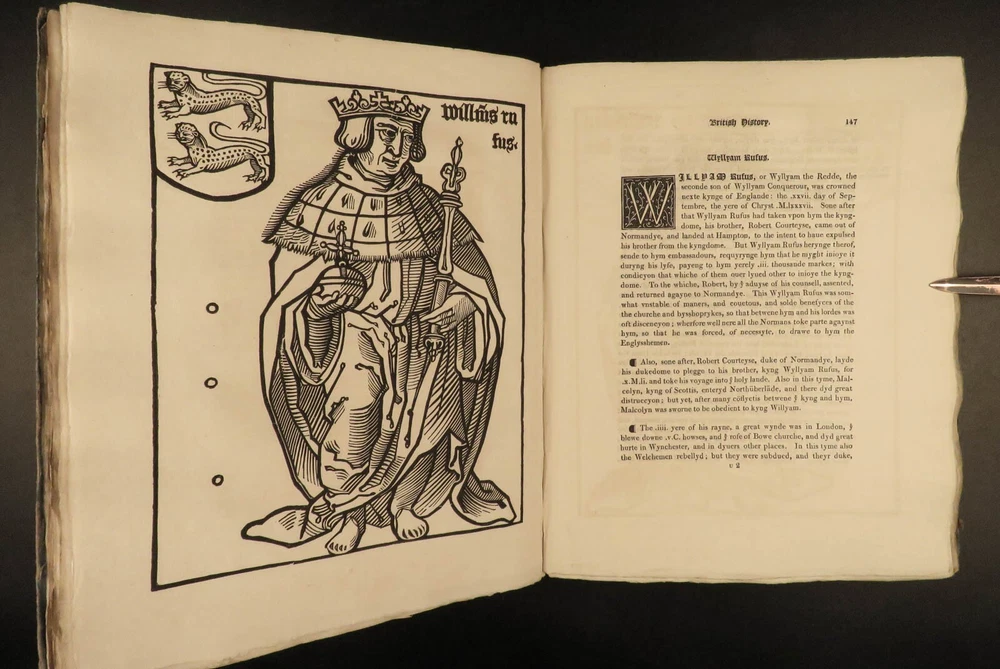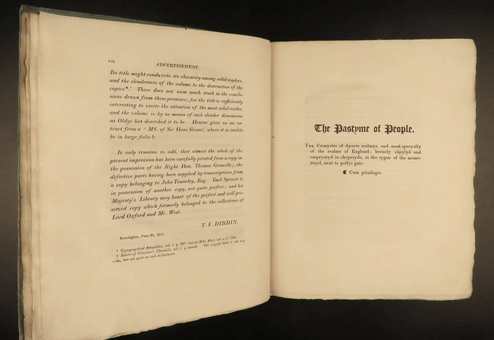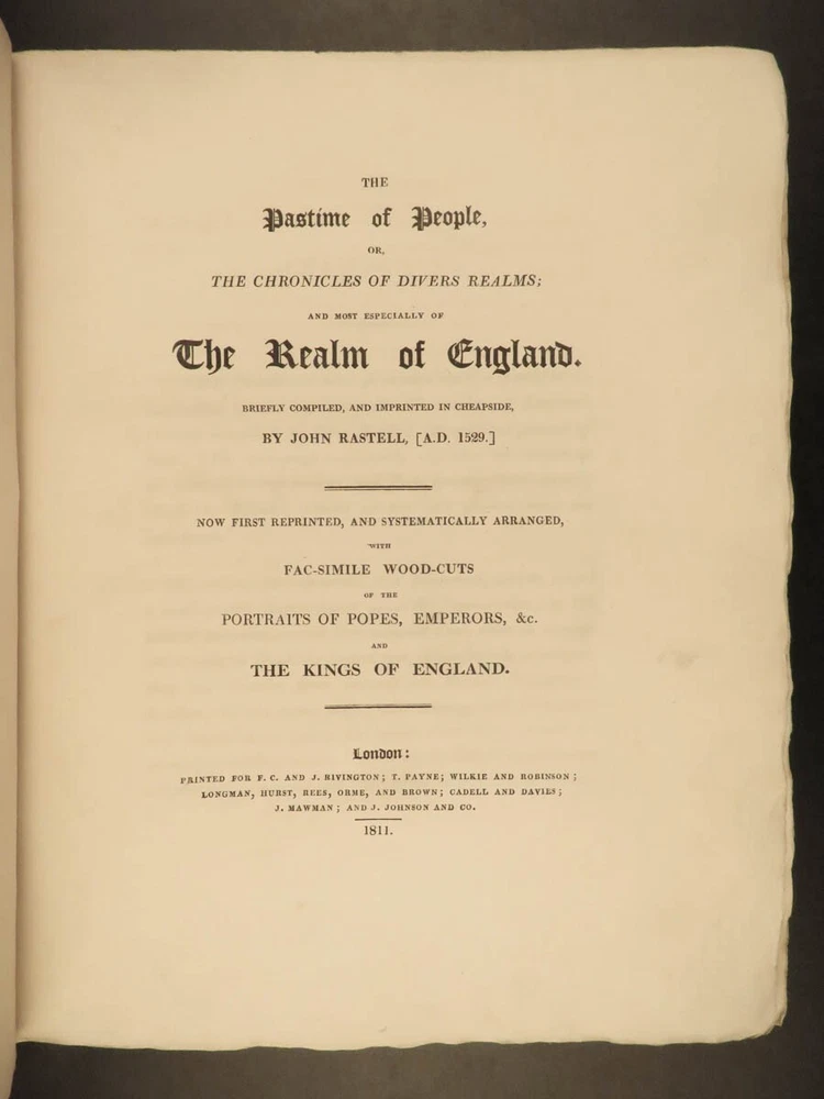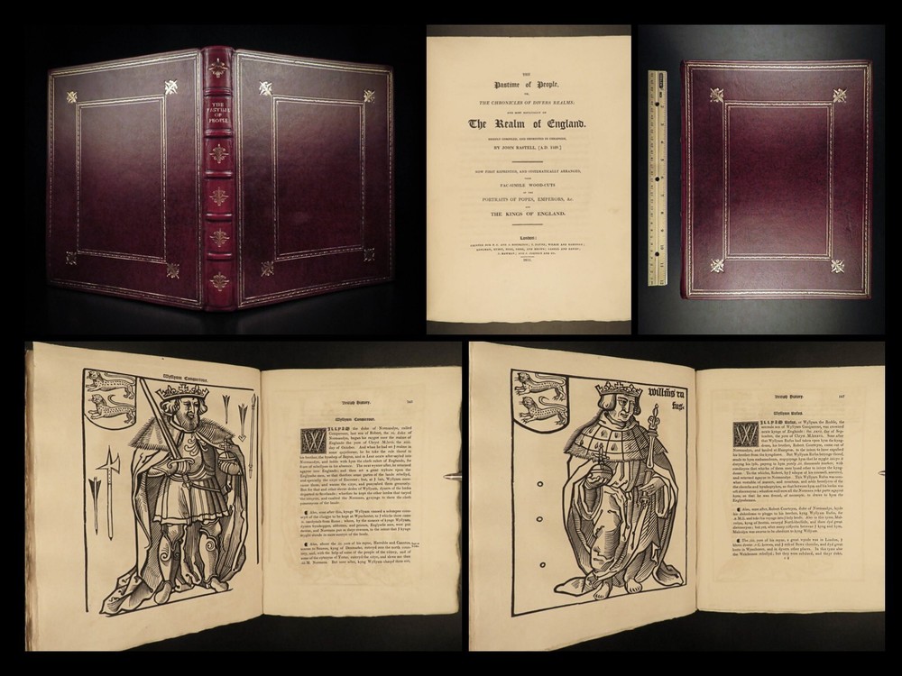 1811 1 st ed John Rastell Pastime of People English Chronicles FOLIO Woodcuts John Rastell was a 15 th -century English author most known for his work ‘ Pastime of the People’ . First appearing in 1529, this work is a chronicle of the people of England from the earliest known times through the right of Richard III. Notable contents include biographies of Richard I, William Rufus, and King John, as well as histories of other kingdoms including Rome, Flemish, Norman, and French histories. Rastell also includes a thorough description of the Papacy. According to Lowndes, this is one of only 500 known printed copies! Very rare! This edition, edited by Dibdin, was the first reprinted edition and systematically arranged with facsimile woodcuts. The 18 woodcuts are some of the most impressive full-page, folio woodcuts you will ever see in a 19 th -century printing. Item number: #21020 Price: $950 RASTELL, John The pastime of people, or, the chronicles of divers realms ; and most especially of the realm of England. Briefly compiled, and imprinted in Cheapside, by John Rastell, (A.D. 1529.) London : Printed for F.C. and J. Rivington ; T. Payne ; Wilkie and Robinson ; Longman, Hurst, Rees, Orme, and Brown ; Cadell and Davies ; J. Mawman ; and J. Johnson and Co., 1811. First edition thus. Details : · Collation: Complete with all pages o viii, 299, [1] o 18 full-page woodcut engravings · References: Lowndes 2051 · Language: English · Binding: Leather; tight and secure · Size : ~12.5in X 10in (31.5cm x 25.5cm) Our Guarantee: Very Fast. Very Safe. Free Shipping Worldwide. Customer satisfaction is our priority! Notify us with 7 days of receiving, and we will offer a full refund without reservation! 21020