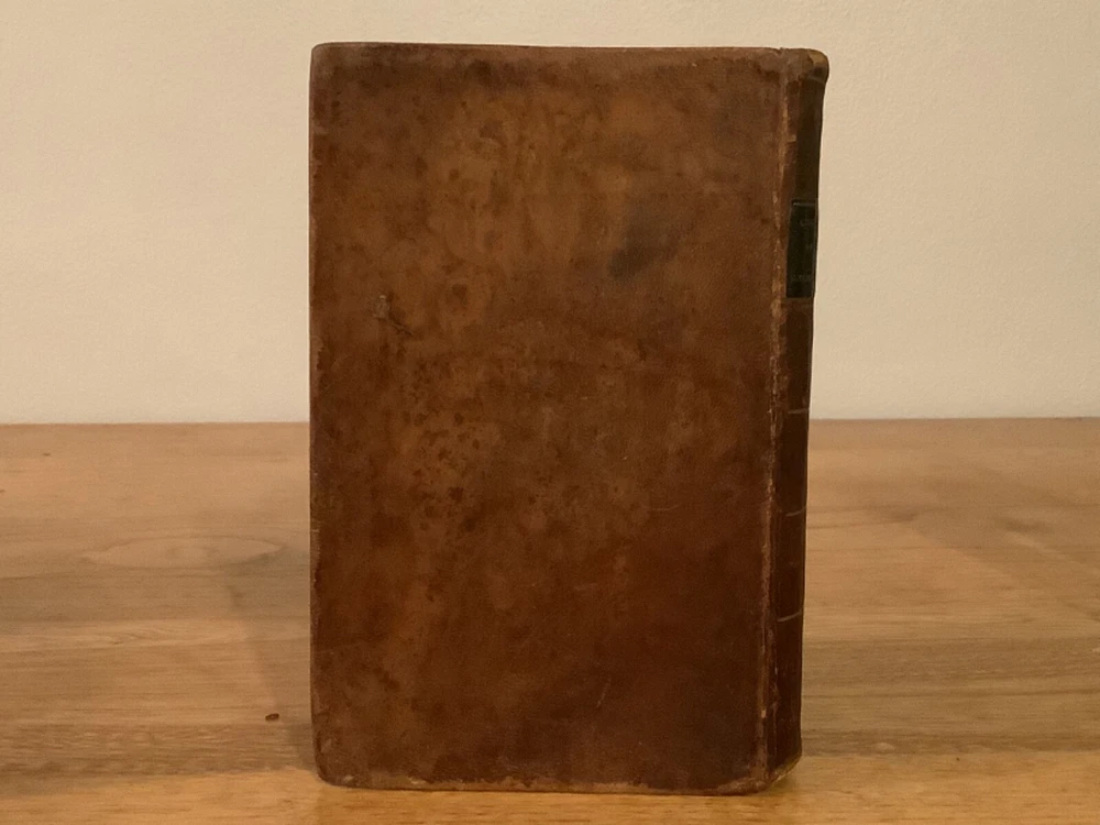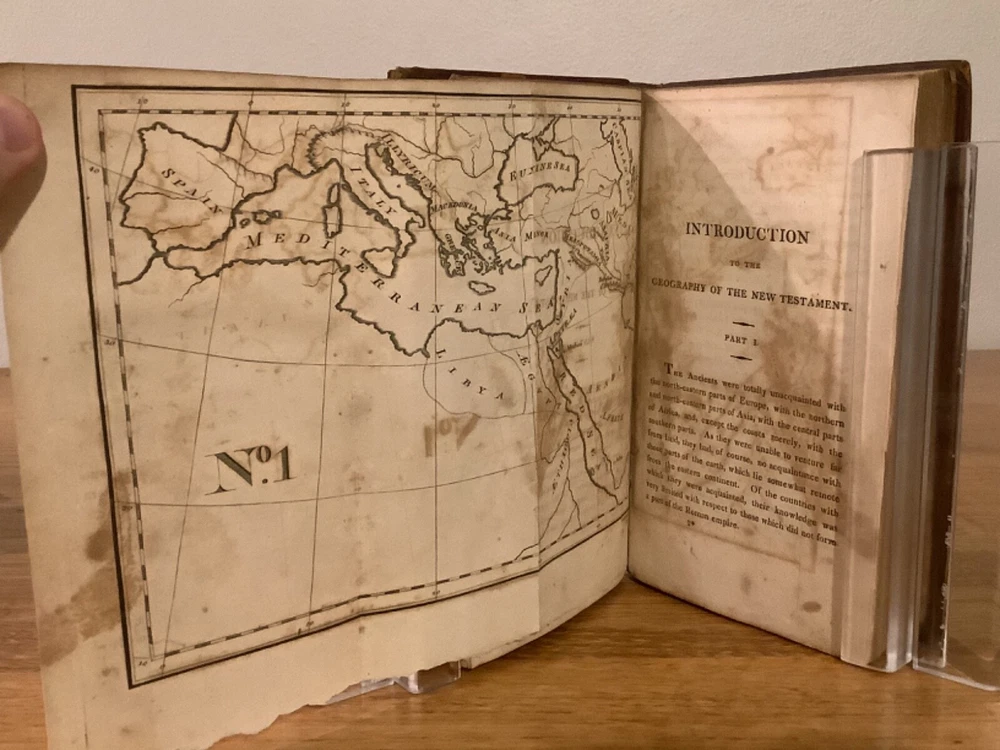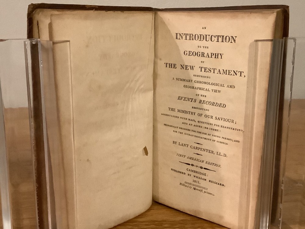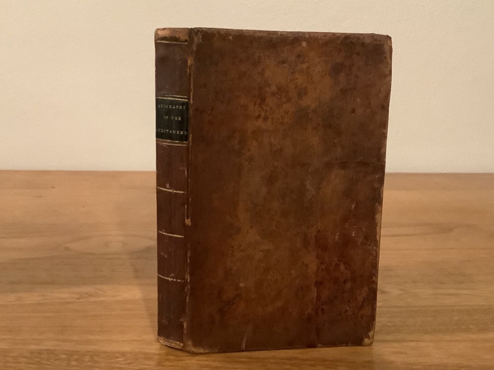 An Introduction to the Geography of the New Testament, Comprising a Summary Chronological and Geographical View of the Events Recorded Respecting the Ministry of our Saviour. By Lant Carpenter and printed in Cambridge (believed Massachusetts) by William Hilliard. 1811, 1st American edition, 217 pp, 6.75 x 4.5”, 12mo, full leather hardcover. In good condition, with rubbing and wear to boards and spine, primarily along edges and corners. Hinges remain in good condition and text block is bound well. Small hole in last endpage at front of book. Includes four total maps, including three foldout ones, which remain in overall good condition. General age-related toning to pages, along with periodic foxing and wear. Please see photographs and ask any questions prior to purchasing. A scarce reference book, primarily designed for students, of the geography and locations in the New Testament. By Land Carpenter (1780-1840), a British Unitarian minister. COLR1811BFGL-0623-aj0190