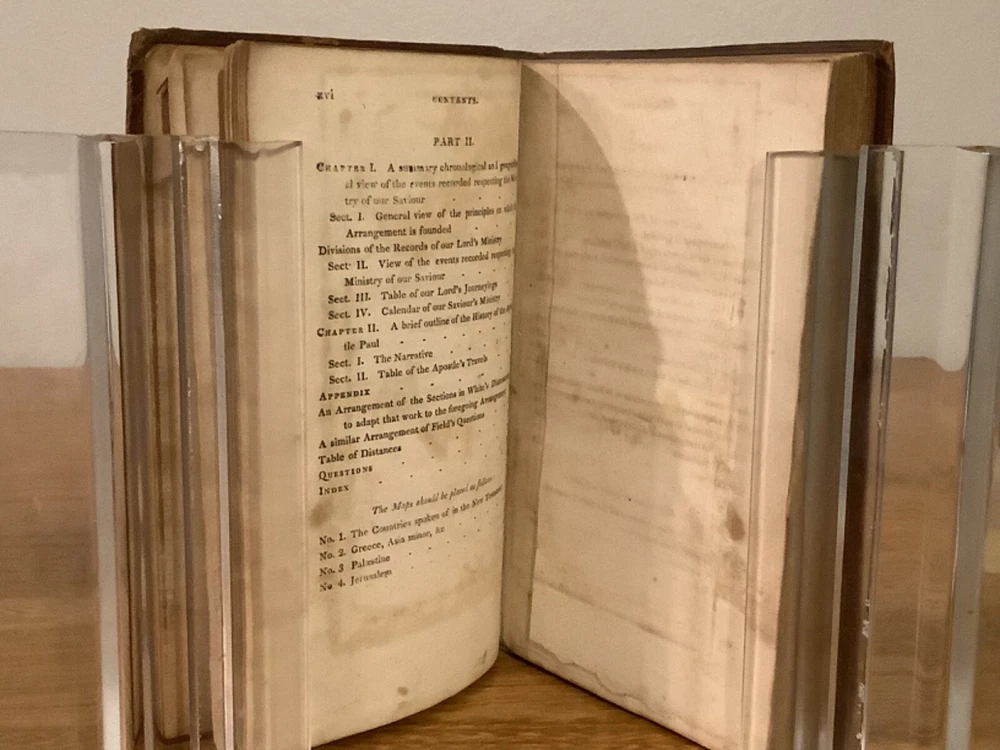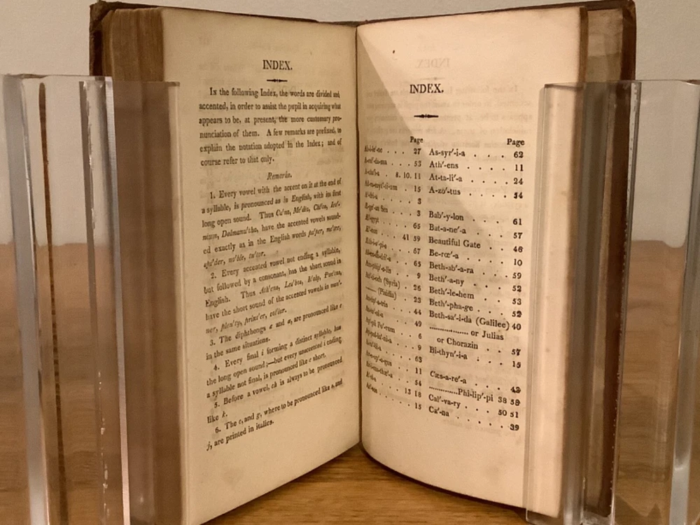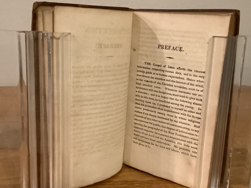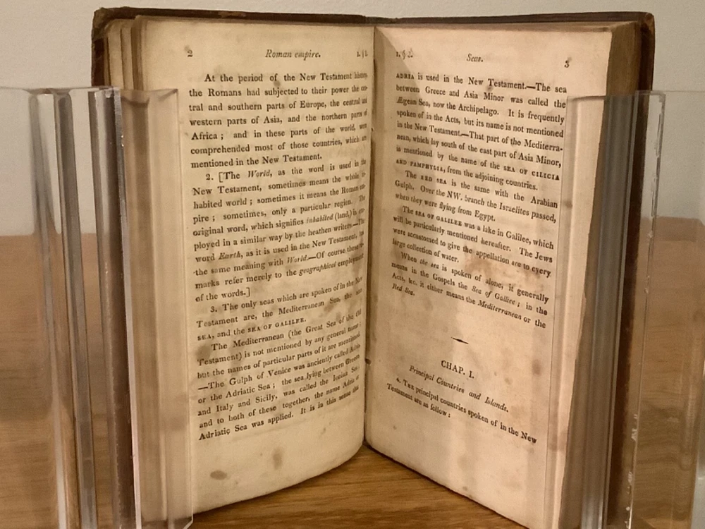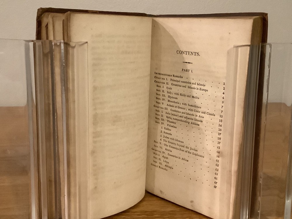 An Introduction to the Geography of the New Testament, Comprising a Summary Chronological and Geographical View of the Events Recorded Respecting the Ministry of our Saviour. By Lant Carpenter and printed in Cambridge (believed Massachusetts) by William Hilliard. 1811, 1st American edition, 217 pp, 6.75 x 4.5”, 12mo, full leather hardcover. In good condition, with rubbing and wear to boards and spine, primarily along edges and corners. Hinges remain in good condition and text block is bound well. Small hole in last endpage at front of book. Includes four total maps, including three foldout ones, which remain in overall good condition. General age-related toning to pages, along with periodic foxing and wear. Please see photographs and ask any questions prior to purchasing. A scarce reference book, primarily designed for students, of the geography and locations in the New Testament. By Land Carpenter (1780-1840), a British Unitarian minister. COLR1811BFGL-0623-aj0190
