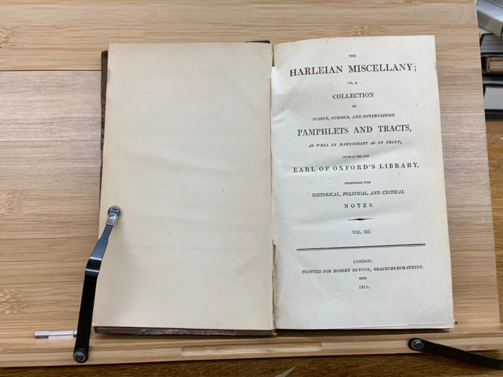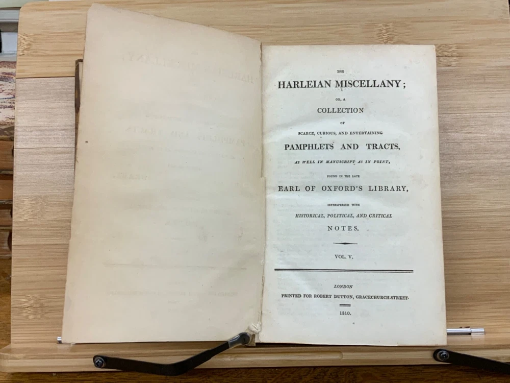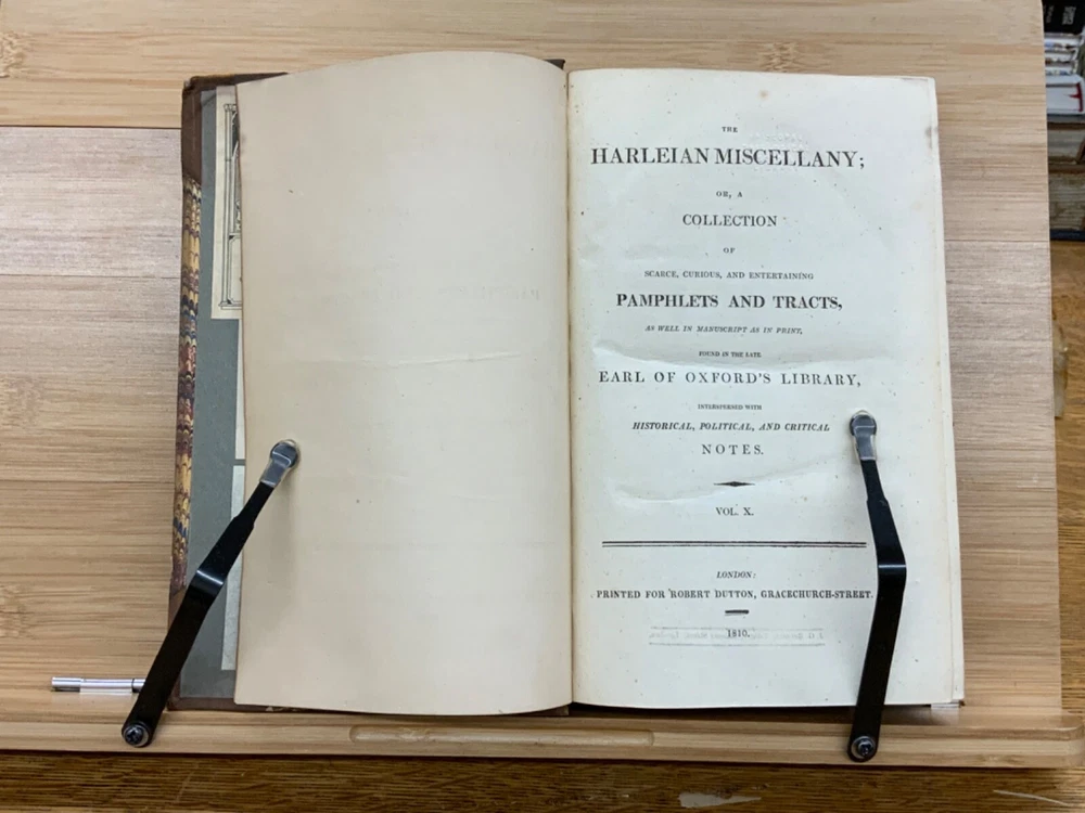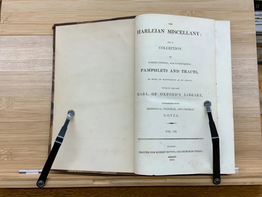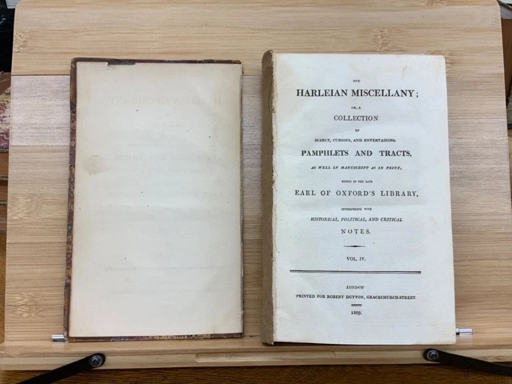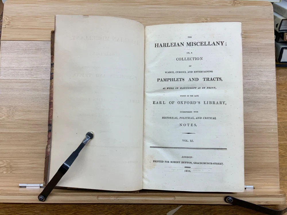 The Harleian Miscellany; or, a Collection of Scarce, Curious, and Entertaining Pamphlets and Tracts, As Well in Manuscript as in Print, Found in the Late Earl of Oxford's Library, Interspersed with Historical, Political, and Critical Notes. Complete in XXII Volumes. I: 1808, 547 pp; II: 1809, 566 pp; III: 1809, 561 pp; IV: 1809, 571 pp; V: 1810, 582 pp; VI: 1810, 552 pp; VII: 1810, 608 pp; VIII: 1810, 574 pp; IX: 1810, 561 pp; X: 1810, 568 pp; XI: 1810, 557 pp; XII: 1811, 284+ pp. London: Printed for Robert Dutton. Ex-library: Trinity Church Library & Library of Episcopal Theological School of Cambridge. Half-leather marbled boards, 8.5 x 5.25", 8vos. In poor condition. As is. Front boards detached on Vols IV, V, VIII, & IX. Rear boards detached on Vols IV & V. All boards are moderately scuffed at edges & leather corners. Marbling exhibits general soiling on all volumes. Vol. I exhibits red & brown repair tape over leather spine, reinforcing both front and rear hinges. Vol. I's front end-page, fly-leaf, and p. 547 detached from binding. Leather spines completely lacking on Vols. IV & V. Top half of Vol. XI's spine detached (but included with purchase for future repair). White ex-library hand-writing on all tails of spines (except Vols. IV & V). Heads and tails of all other spines are chipped & rubbed, especially Vol. VIII's head. Ex-library plates on all front paste-downs. Ex-library marginalia on all title pages (verso). Pages are brittle & some are chipped at fore-edges. If boards are still attached, gutters are split. Bindings are overall intact, hinges either detached or very fragile. Perfect candidate for restoration. A complete set. Please see photos. The Harleian Miscellany is a collection of material from the library of the Earl of Oxford and Earl Mortimer collated and edited by Samuel Johnson and William Oldys between 1744 and 1753 on behalf of the publisher Thomas Osborne. The "late Earl of Oxford" whose library was the source of the texts could refer either to Robert Harley, 1st Earl of Oxford and Earl Mortimer (1661-1724) or to his son, Edward Harley, 2nd Earl of Oxford and Earl Mortimer (1689-1741). Both father and son were bibliophiles and contributed greatly to the collection. Plethora of interesting topics, from religion to coffee production. FORN-MSB-0224-0764-HK1177