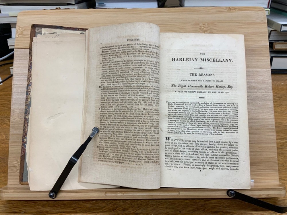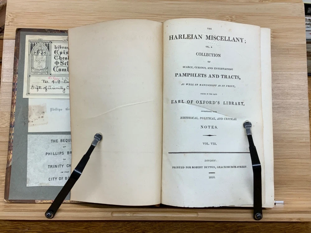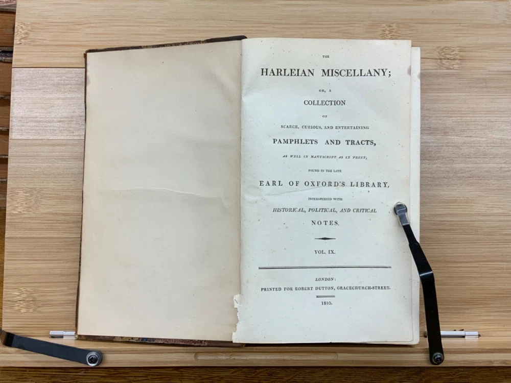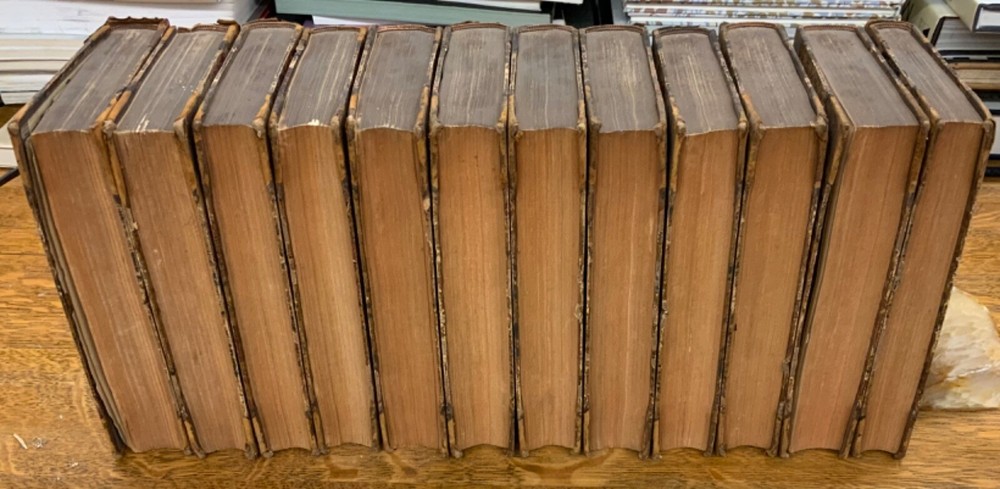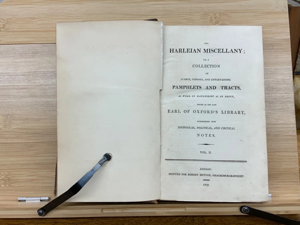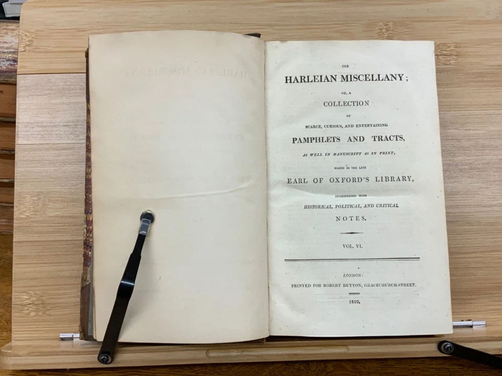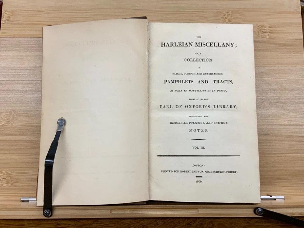 The Harleian Miscellany; or, a Collection of Scarce, Curious, and Entertaining Pamphlets and Tracts, As Well in Manuscript as in Print, Found in the Late Earl of Oxford's Library, Interspersed with Historical, Political, and Critical Notes. Complete in XXII Volumes. I: 1808, 547 pp; II: 1809, 566 pp; III: 1809, 561 pp; IV: 1809, 571 pp; V: 1810, 582 pp; VI: 1810, 552 pp; VII: 1810, 608 pp; VIII: 1810, 574 pp; IX: 1810, 561 pp; X: 1810, 568 pp; XI: 1810, 557 pp; XII: 1811, 284+ pp. London: Printed for Robert Dutton. Ex-library: Trinity Church Library & Library of Episcopal Theological School of Cambridge. Half-leather marbled boards, 8.5 x 5.25", 8vos. In poor condition. As is. Front boards detached on Vols IV, V, VIII, & IX. Rear boards detached on Vols IV & V. All boards are moderately scuffed at edges & leather corners. Marbling exhibits general soiling on all volumes. Vol. I exhibits red & brown repair tape over leather spine, reinforcing both front and rear hinges. Vol. I's front end-page, fly-leaf, and p. 547 detached from binding. Leather spines completely lacking on Vols. IV & V. Top half of Vol. XI's spine detached (but included with purchase for future repair). White ex-library hand-writing on all tails of spines (except Vols. IV & V). Heads and tails of all other spines are chipped & rubbed, especially Vol. VIII's head. Ex-library plates on all front paste-downs. Ex-library marginalia on all title pages (verso). Pages are brittle & some are chipped at fore-edges. If boards are still attached, gutters are split. Bindings are overall intact, hinges either detached or very fragile. Perfect candidate for restoration. A complete set. Please see photos. The Harleian Miscellany is a collection of material from the library of the Earl of Oxford and Earl Mortimer collated and edited by Samuel Johnson and William Oldys between 1744 and 1753 on behalf of the publisher Thomas Osborne. The "late Earl of Oxford" whose library was the source of the texts could refer either to Robert Harley, 1st Earl of Oxford and Earl Mortimer (1661-1724) or to his son, Edward Harley, 2nd Earl of Oxford and Earl Mortimer (1689-1741). Both father and son were bibliophiles and contributed greatly to the collection. Plethora of interesting topics, from religion to coffee production. FORN-MSB-0224-0764-HK1177