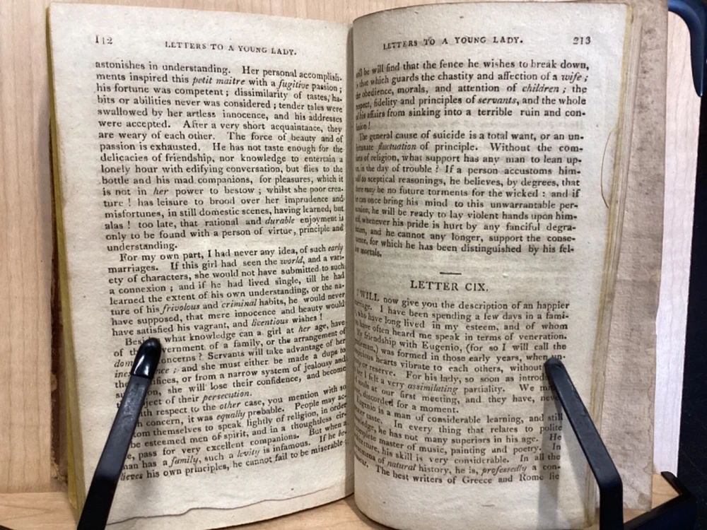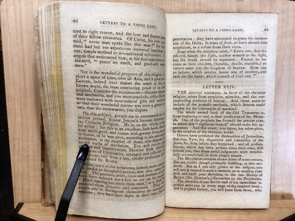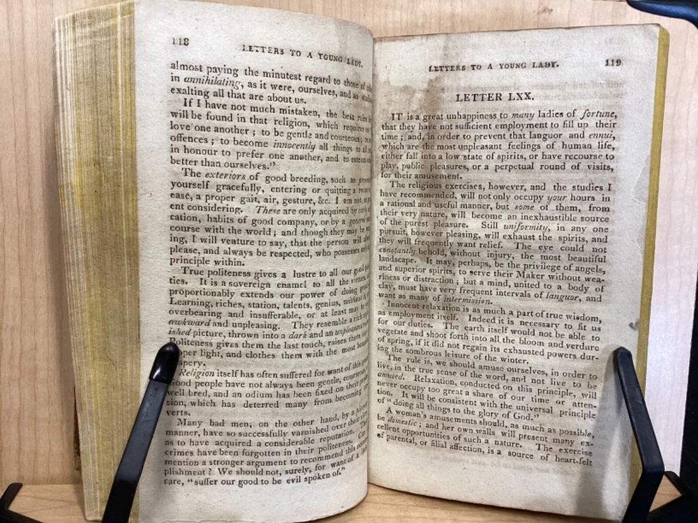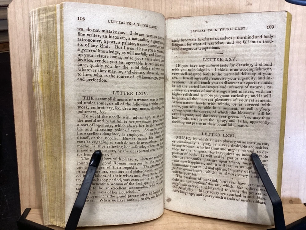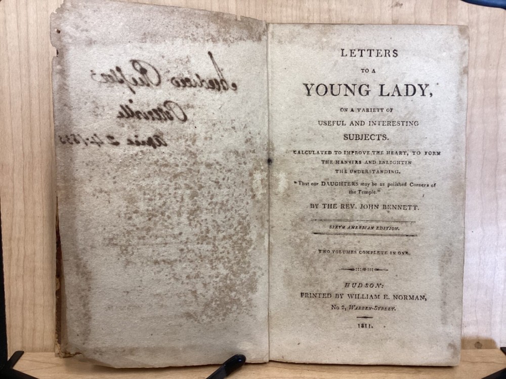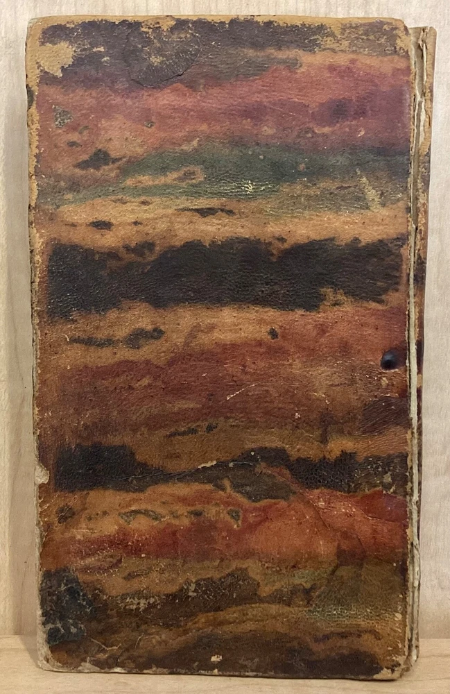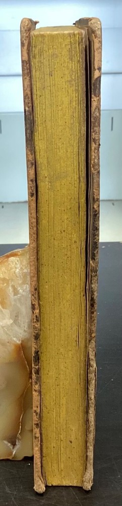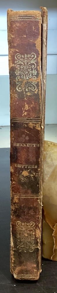 Letters to a Young Lady, on a Variety of Useful and Interesting Subjects. Calculated to Improve the Heart, to Form the Manners and Enlighten the Understanding, by The Rev. John Bennett, Sixth American Edition, Two Volumes in One, William E. Norman, Hudson, 1811, 238pp, leather, 4.5 x 7", 18mo Poor condition/as is. Front board is completely detached from binding. Rear board is attached to binding via fragile cording. Original leather boards have an interesting coloring applied, including red, green, and black. Chipping and scuffing to boards. Tips are bumped with exposed boards. Fore edges are painted yellow. Chipping and cracking to spine, but still legible; title in gilt. Small chip at tail with exposed binding. Provenance in ink on flyleaf (possibly Andrea Rufsee Potterville, April 24, 1835). No known marginalia. Toning, age-staining, and foxing throughout textblock. Please see photos and ask any questions prior to purchase. An early work on women's etiquette and education, predating the American release of Bennett's Strictures on Female Education by one year (First American Edition was published in 1791). This work was one of the earliest and most progressive titles on the subject to be printed in the young republic. FORN-TUB-0051-BB-2407-JC1039