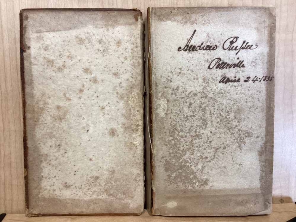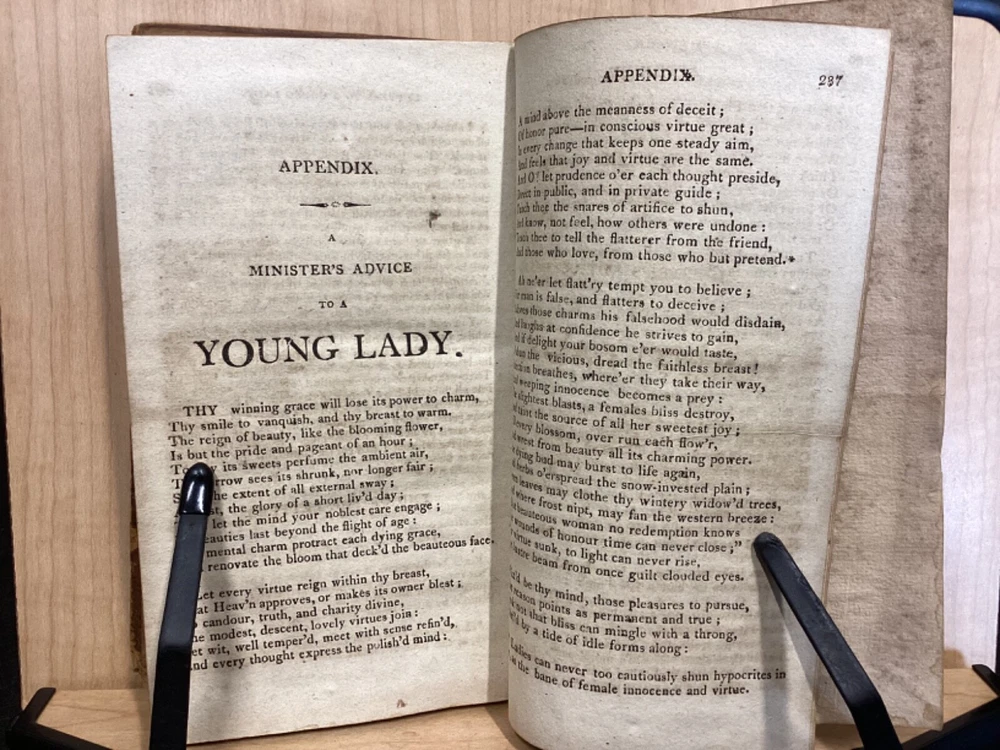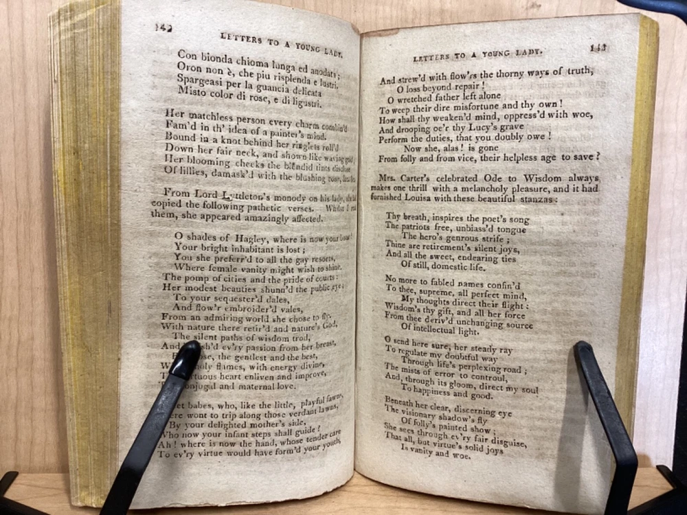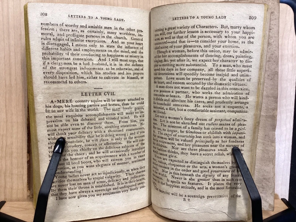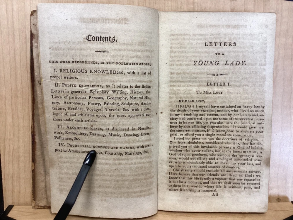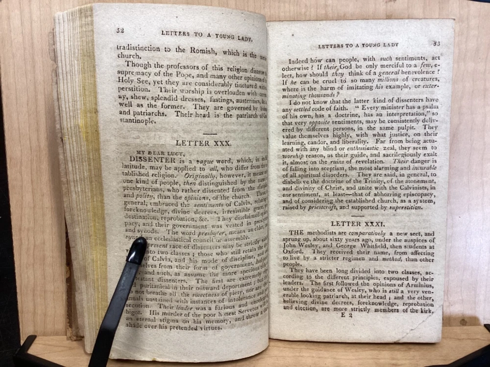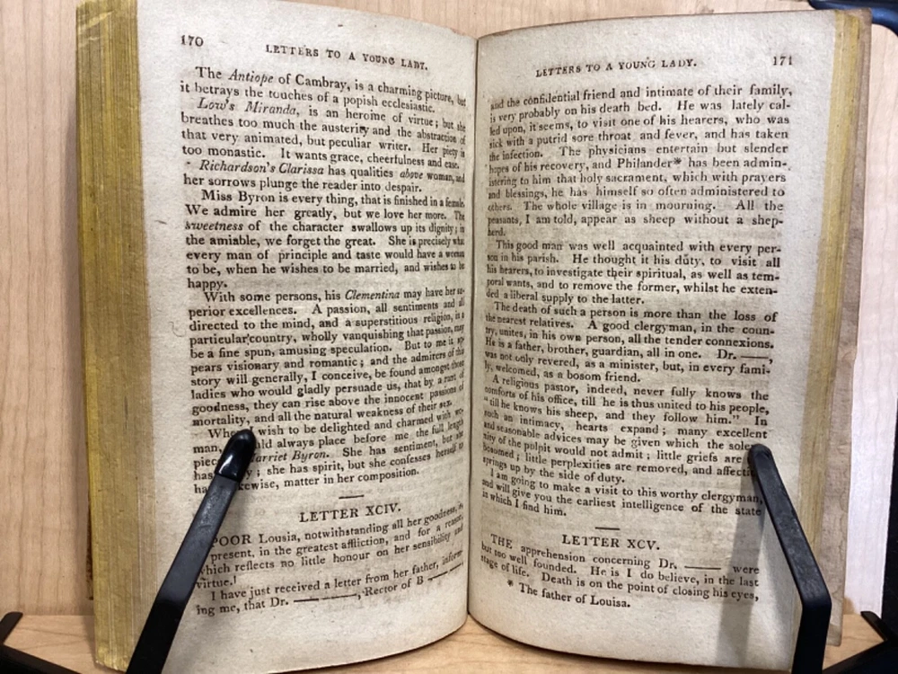 Letters to a Young Lady, on a Variety of Useful and Interesting Subjects. Calculated to Improve the Heart, to Form the Manners and Enlighten the Understanding, by The Rev. John Bennett, Sixth American Edition, Two Volumes in One, William E. Norman, Hudson, 1811, 238pp, leather, 4.5 x 7", 18mo Poor condition/as is. Front board is completely detached from binding. Rear board is attached to binding via fragile cording. Original leather boards have an interesting coloring applied, including red, green, and black. Chipping and scuffing to boards. Tips are bumped with exposed boards. Fore edges are painted yellow. Chipping and cracking to spine, but still legible; title in gilt. Small chip at tail with exposed binding. Provenance in ink on flyleaf (possibly Andrea Rufsee Potterville, April 24, 1835). No known marginalia. Toning, age-staining, and foxing throughout textblock. Please see photos and ask any questions prior to purchase. An early work on women's etiquette and education, predating the American release of Bennett's Strictures on Female Education by one year (First American Edition was published in 1791). This work was one of the earliest and most progressive titles on the subject to be printed in the young republic. FORN-TUB-0051-BB-2407-JC1039