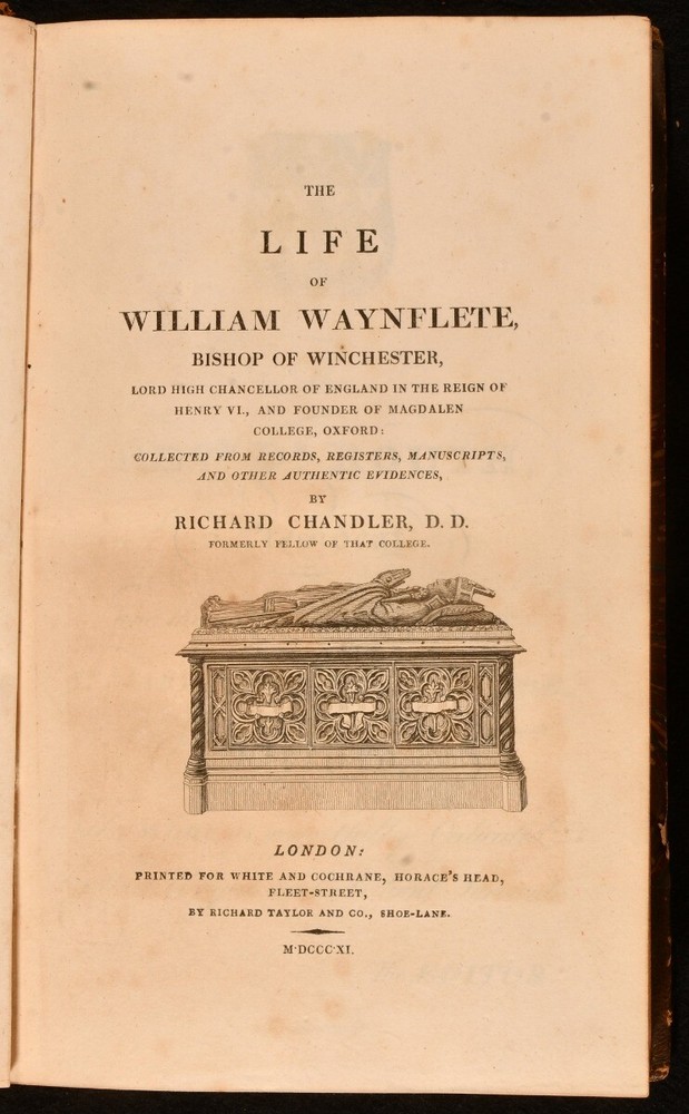 Click here to see our other books! The Life of William Waynflete, Bishop of Winchester Richard Chandler 1811 White and Cochrane : London 10" by 6" [6], xvi, 428pp SUMMARY An illustrated biography of William Waynflete, in its first edition. Fine Binding,Illustrated,Leather Binding Overall Condition: Very Good This book weighs 1 KG when packed UK Postage: £ 3.99 US Postage: £ 22.99 EU Postage : £ 16.99 European Postage: £ 17.99 Asia Postage: £ 22.99 Worldwide Postage: £ 28.99 DESCRIPTION A first edition copy. William Waynflete was the Bishop of Winchester and Lord Chancellor of England during the fifteenth century. He founded Magdalen College, Oxford and three subsidiary schools. This volume details his life and work. With a frontispiece and four plates and an in-text illustration. Collated, complete. With a bookplate for Charles Savile Roundell to the front free endpaper. CONDITION In quarter leather with marbled boards. Externally, smart with some rubbing to the spine, joints and extremities. With some fading to the top of the rear board. With a bookplate for Charles Savile Roundell to the front free endpaper. Internally, firmly bound with generally bright and clean pages. Overall Condition: Very Good GLOSSARY OF TERMS Overall Condition (Dustwrapper condition rating is shown after that for the book itself, where a dustwrapper is present) Fine - Very well preserved copy showing very little wear Very Good Indeed - Only one or two minor faults, really a very attractive copy Very Good - Quite a wide term meaning no major faults but probably several smaller ones often expected given the age of the book, but still a respectable copy Good - Meaning not very good. Some more serious faults as will be described in the condition report under 'condition' Good Only - Meaning one or more faults that could really do with repair Fair - As with good only above but with other faults leaving a compromised copy even after repair Poor - Really bad and possibly seriously incomplete. We only sell books in this condition where their rarity or value makes them attractive none the less. Major defects will be described. GUARANTEE We offer a full money back guarantee on our descriptions. Please ask for details and conditions. We prefer PAYPAL. If you pay via PAYPAL we will post the item off the same or the next working day with the postage you have selected. Please note we cannot accept USD cheques