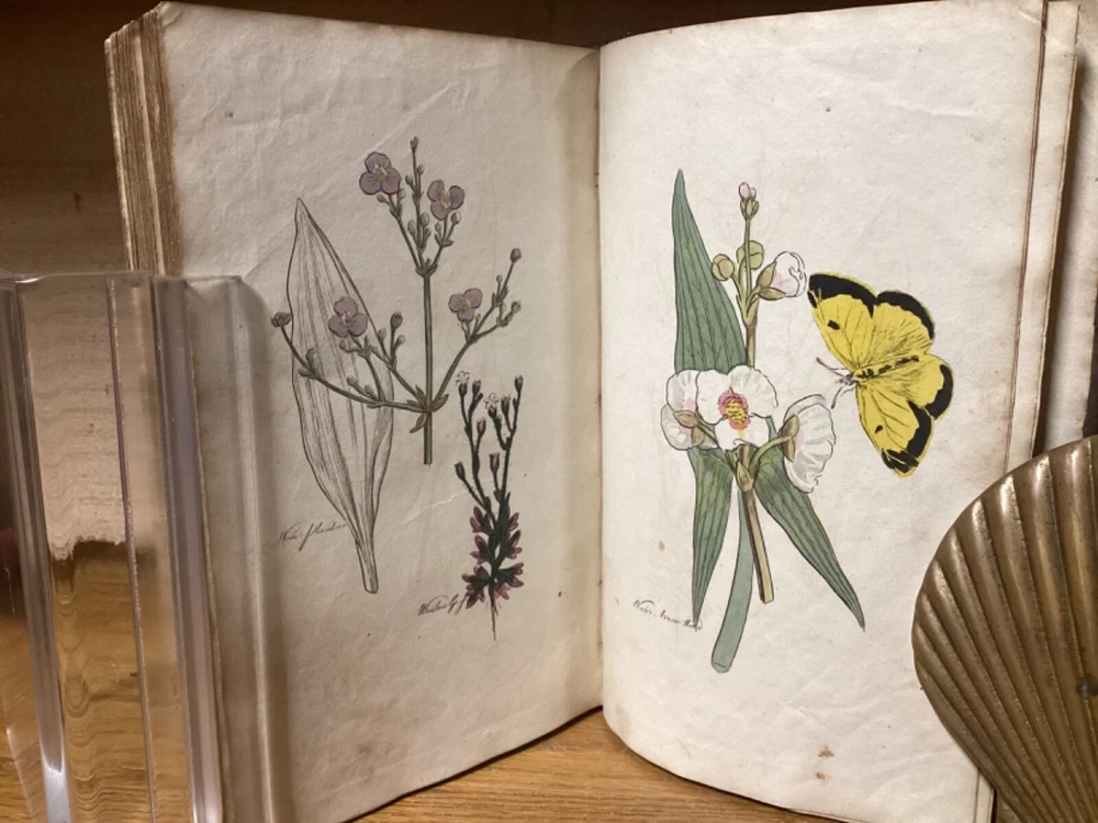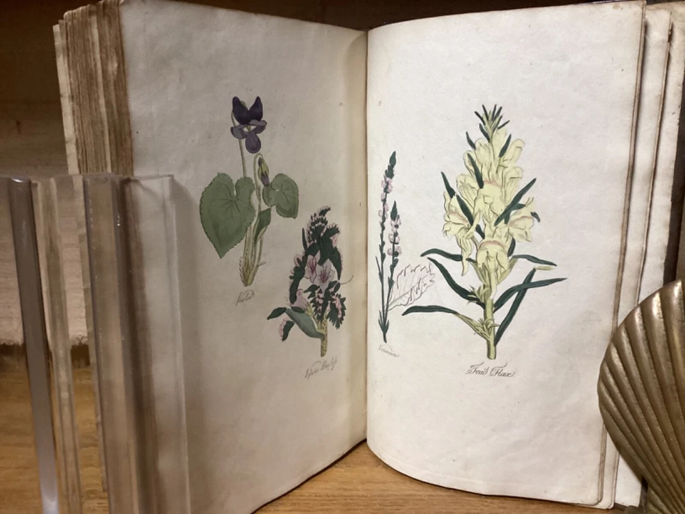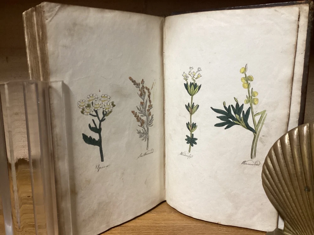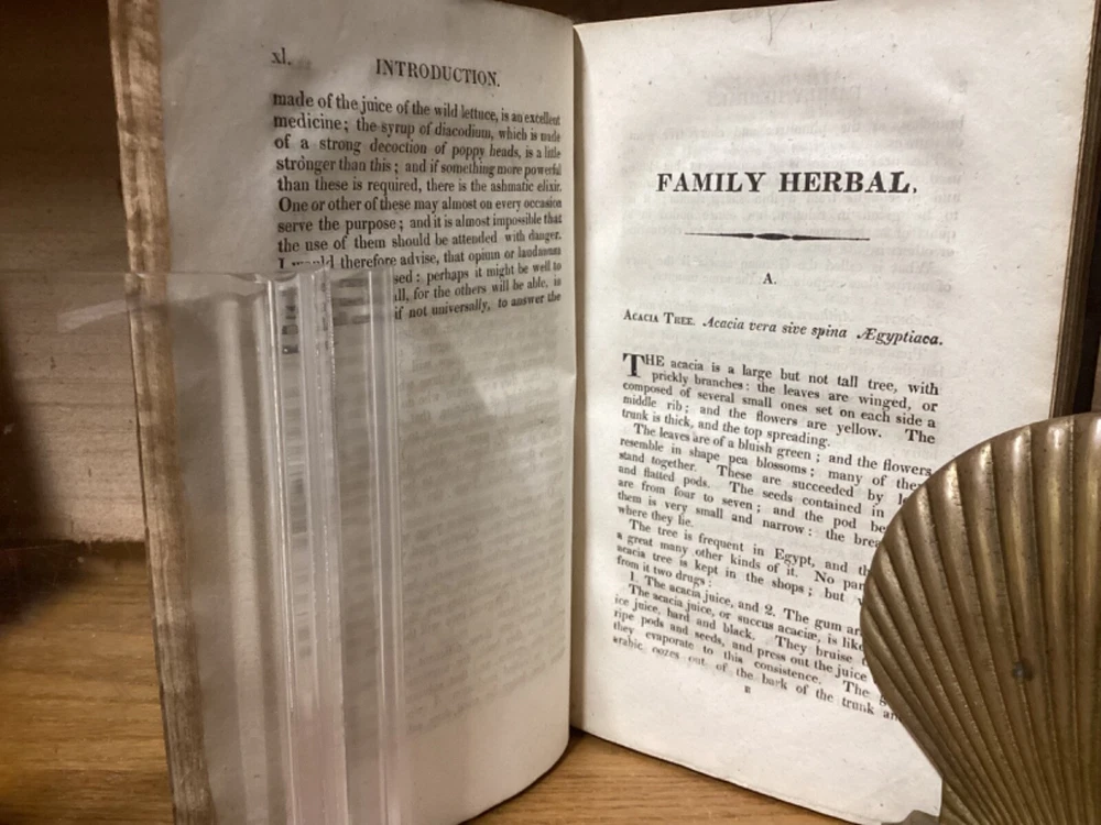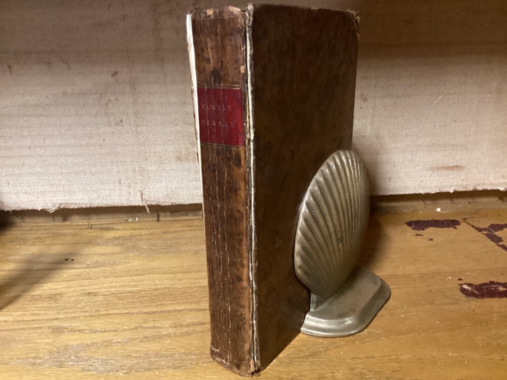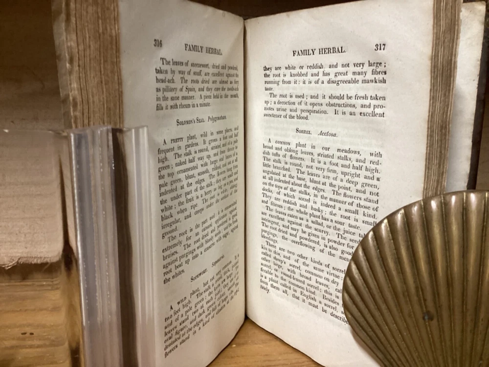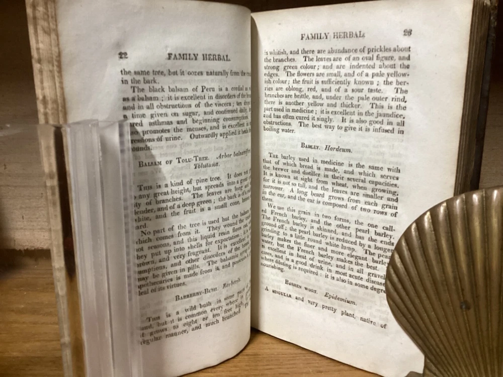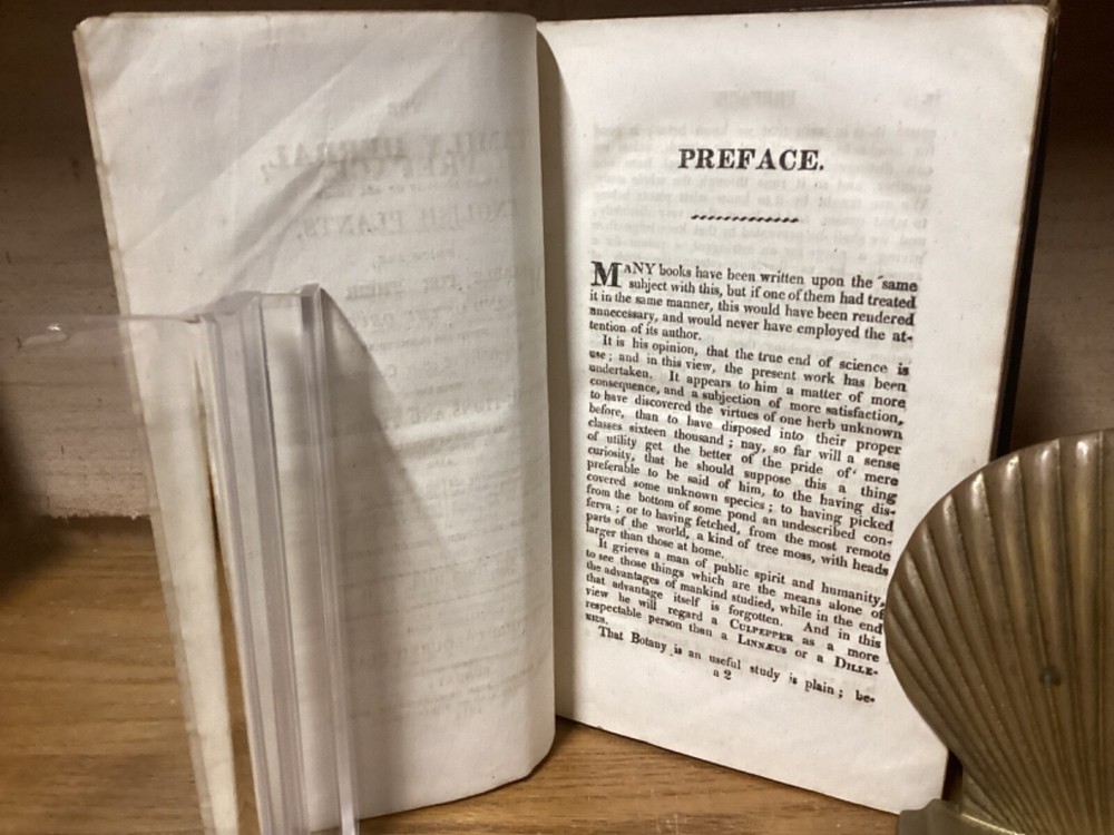 The Family Herbal, or an Account of all those English Plants, which are Remarkable for their Virtues. By John Hill and printed in Bungay, Suxxex, by G. Brightly and Co. 1812, 316 pp plus plates, 8.5” x 5.5”, 8vo, hardcover full leather. As-is, with front board detached and rear board almost entirely split. Rubbing and wear to exterior. Some rubbing and light chipping to leather on spine. Text block remains bound well despite wear. Light markings and marginalia. Beautifully illustrated with 54 color plates at rear. General age-related toning to pages, along with periodic foxing and wear. Please see photographs and ask any questions prior to purchasing. A scarce family reference piece on notable English plants and their medicinal and cultural uses in the early 19th Century. A great piece for restoration. COLN1812AHJC-0724-aj1943