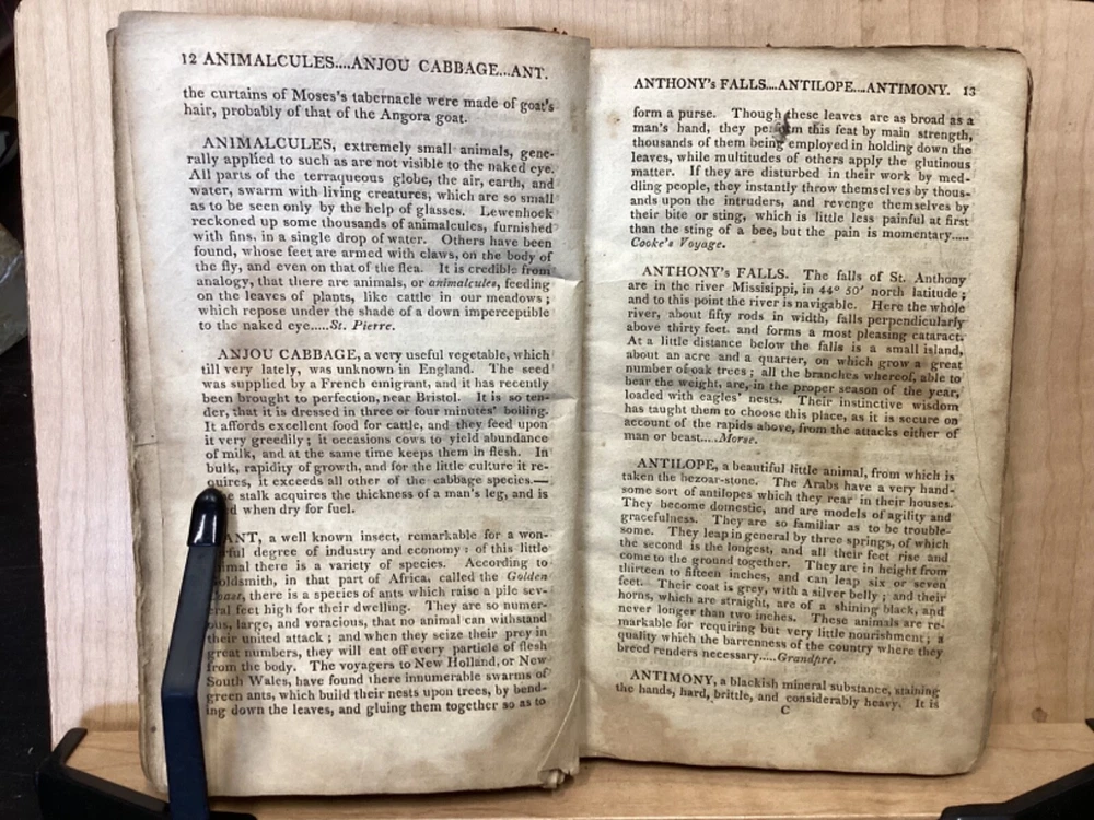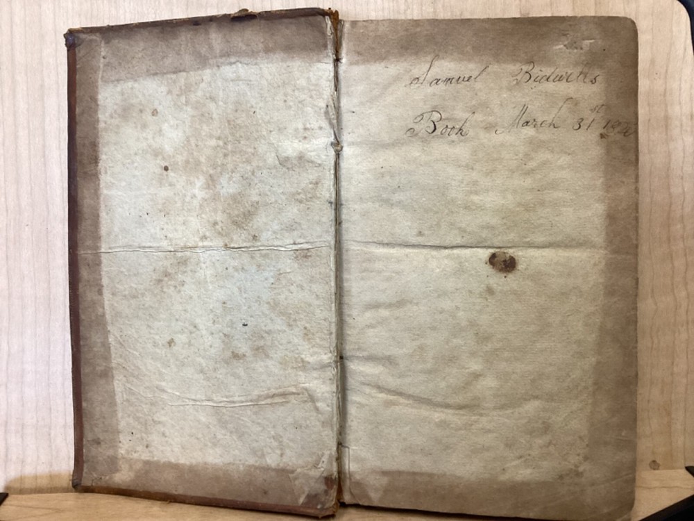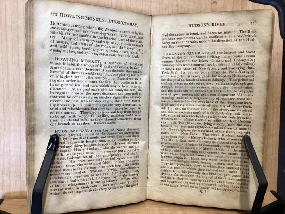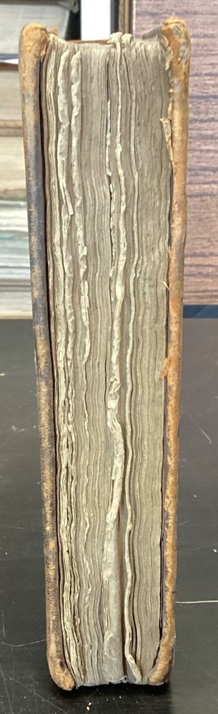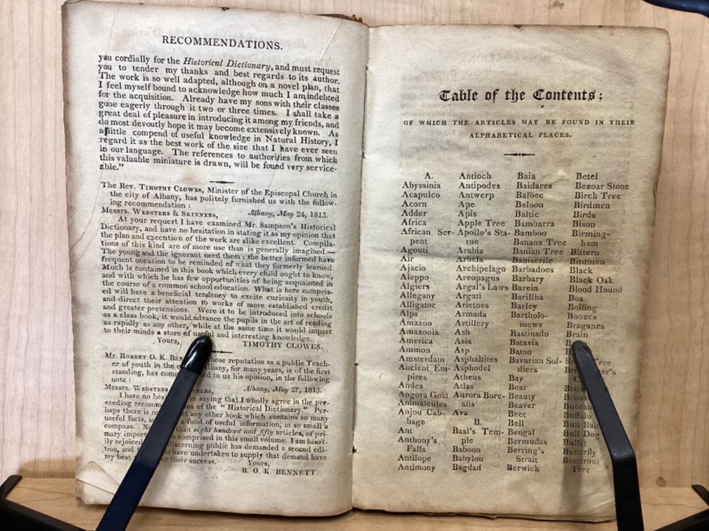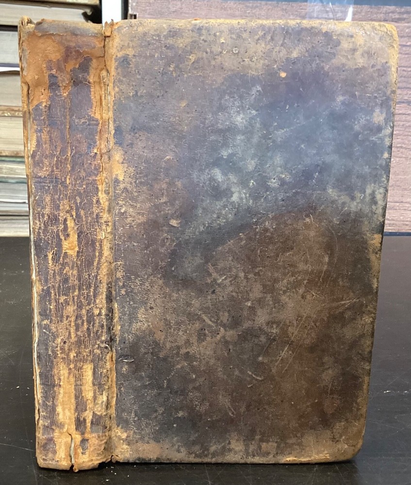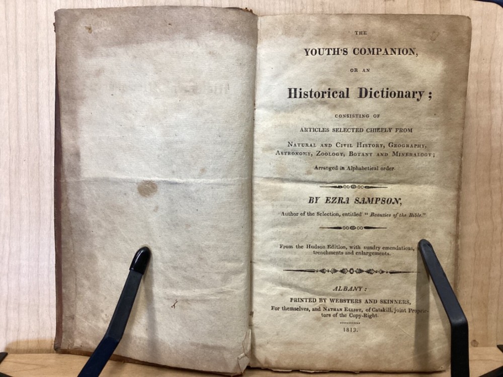 The Youth's Companion, or an Historical Dictionary; Consisting of Articles Selected Chiefly from Natural and Civil History, Geography, Astronomy, Zoology, Botany and Mineralogy; Arranged in Alphabetical Order, by Ezra Sampson, Websters and Skinners, Albany, 1813, 412pp, leather, 4.5 x 7", 18mo Fair condition. Wear and chipping to boards. Tips are bumped and edges are scuffed. Cracking and chipping to spine. Joints and hinges are cracked. Provenance on flyleaf (Samuel Bidwell). Toning, age-staining, tea-staining, and ink-staining throughout textblock. Binding is fragile; numerous pages are beginning to come loose. Please see photos. Ezra Sampson (12 February 1749 - 12 December 1828) was a Massachusetts clergyman and graduate of Yale University. He officiated as chaplain in the camp at Roxbury where he encouraged the patriotic determination of the militia with his vigorous discourses. After retiring from the clergy, he moved to New York and began publication of the "Balance" in 1801. He was also the editor of the "Connecticut Courant" in 1804, and continued to write for the paper until 1817. FORN-TUB-0041-BB-2405-JC768