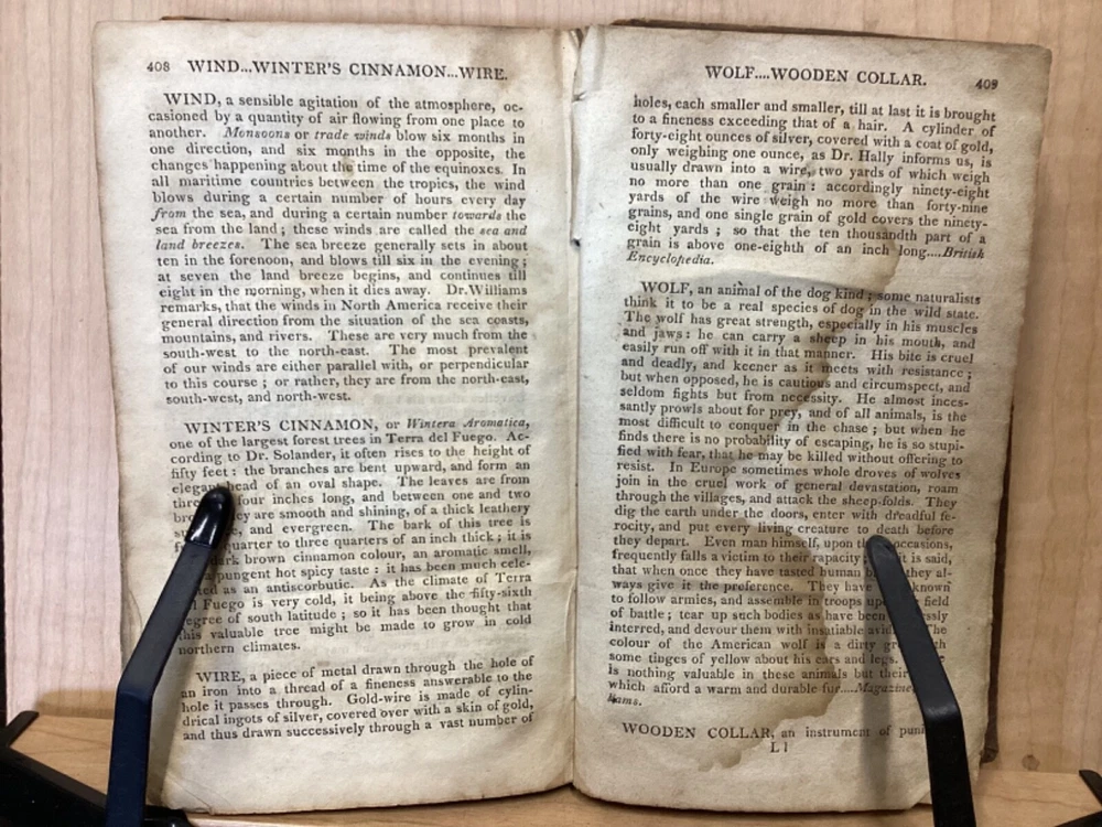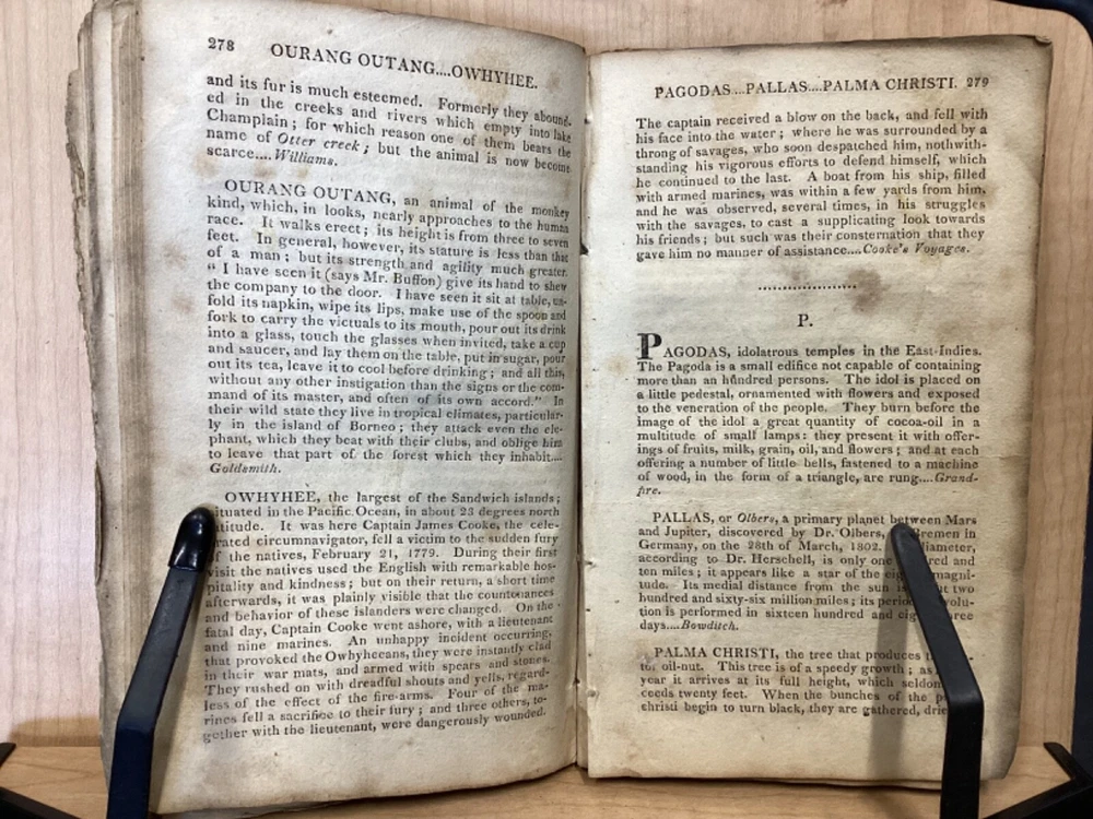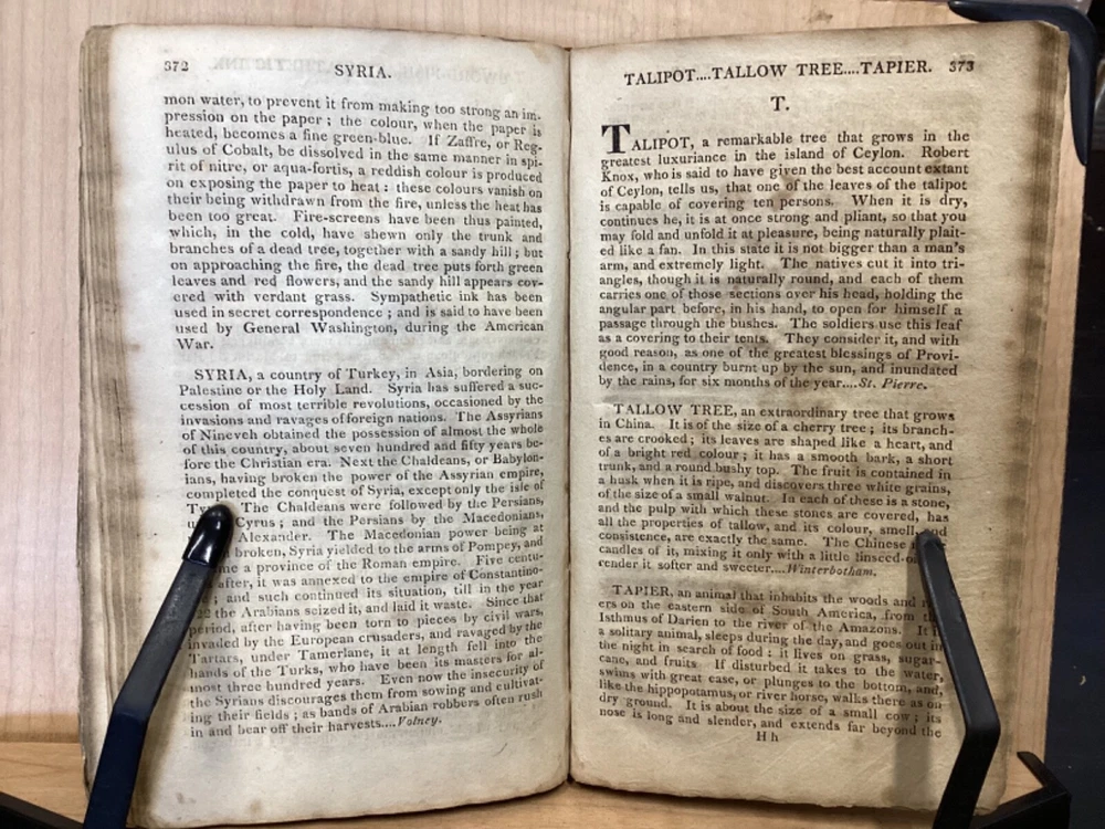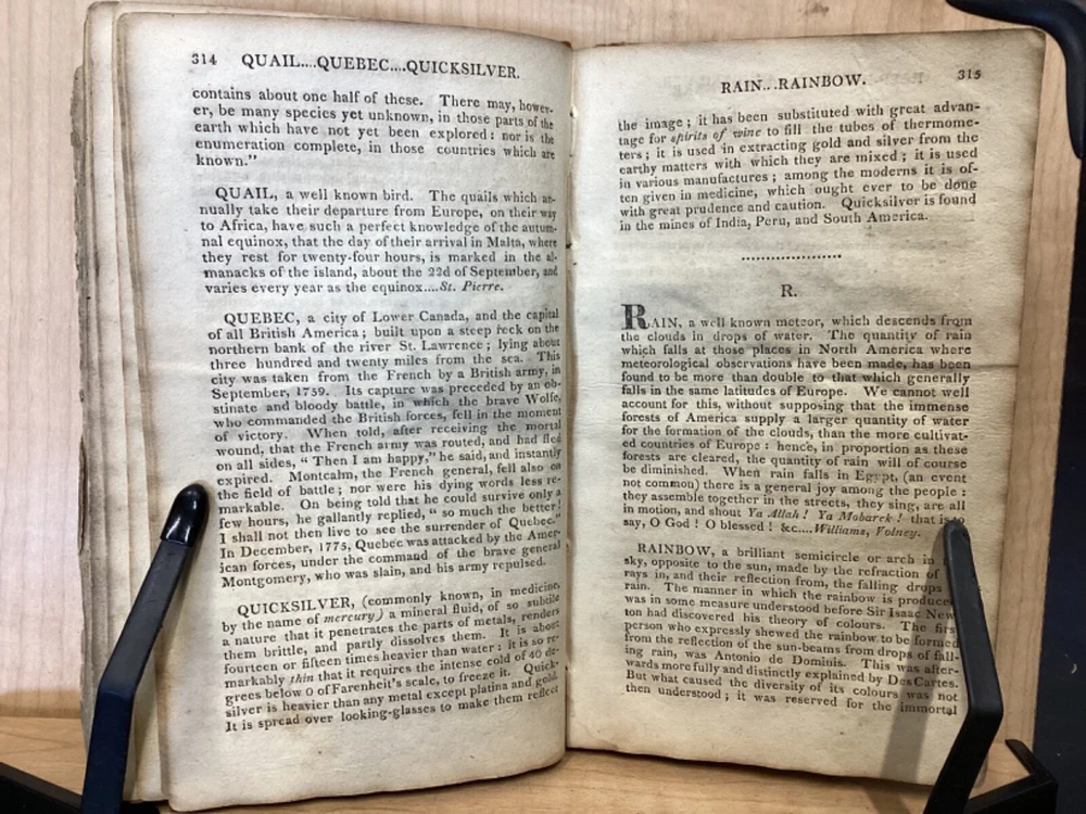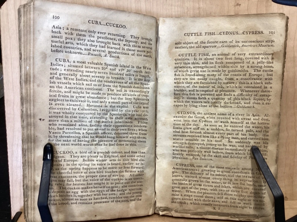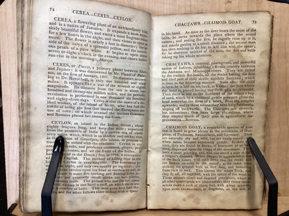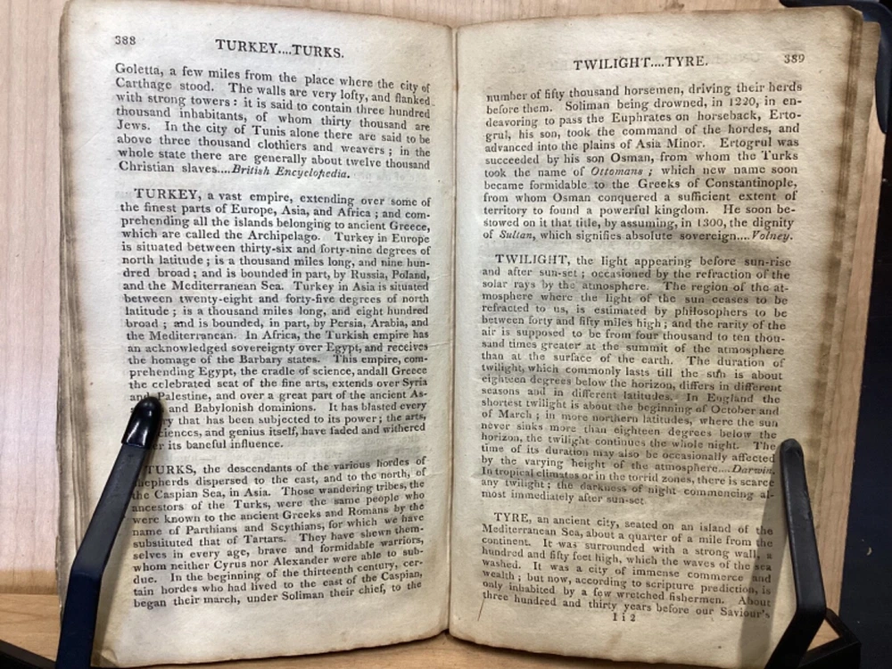 The Youth's Companion, or an Historical Dictionary; Consisting of Articles Selected Chiefly from Natural and Civil History, Geography, Astronomy, Zoology, Botany and Mineralogy; Arranged in Alphabetical Order, by Ezra Sampson, Websters and Skinners, Albany, 1813, 412pp, leather, 4.5 x 7", 18mo Fair condition. Wear and chipping to boards. Tips are bumped and edges are scuffed. Cracking and chipping to spine. Joints and hinges are cracked. Provenance on flyleaf (Samuel Bidwell). Toning, age-staining, tea-staining, and ink-staining throughout textblock. Binding is fragile; numerous pages are beginning to come loose. Please see photos. Ezra Sampson (12 February 1749 - 12 December 1828) was a Massachusetts clergyman and graduate of Yale University. He officiated as chaplain in the camp at Roxbury where he encouraged the patriotic determination of the militia with his vigorous discourses. After retiring from the clergy, he moved to New York and began publication of the "Balance" in 1801. He was also the editor of the "Connecticut Courant" in 1804, and continued to write for the paper until 1817. FORN-TUB-0041-BB-2405-JC768