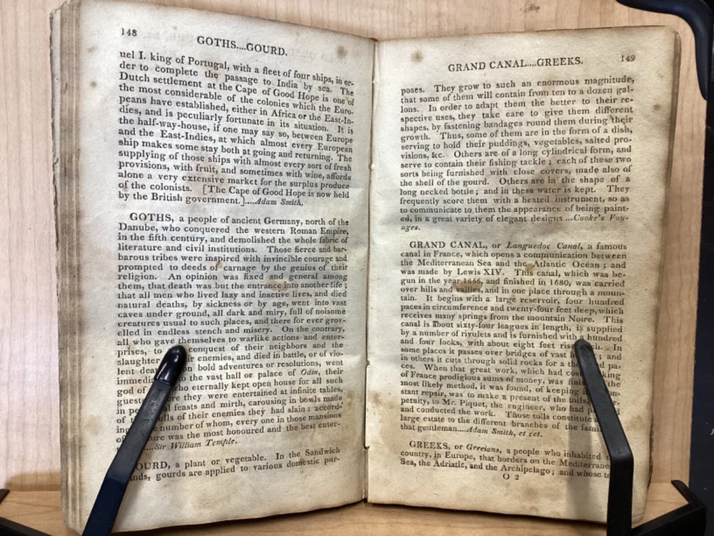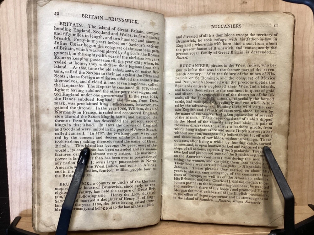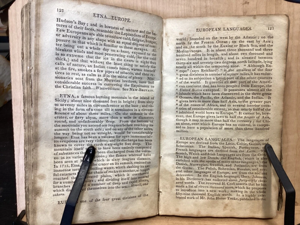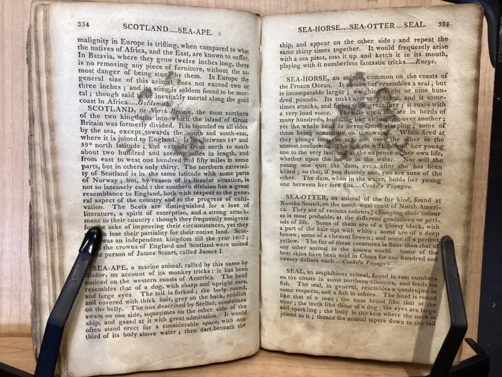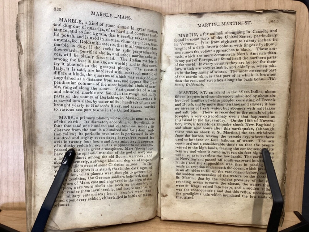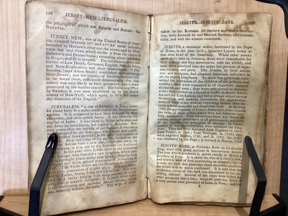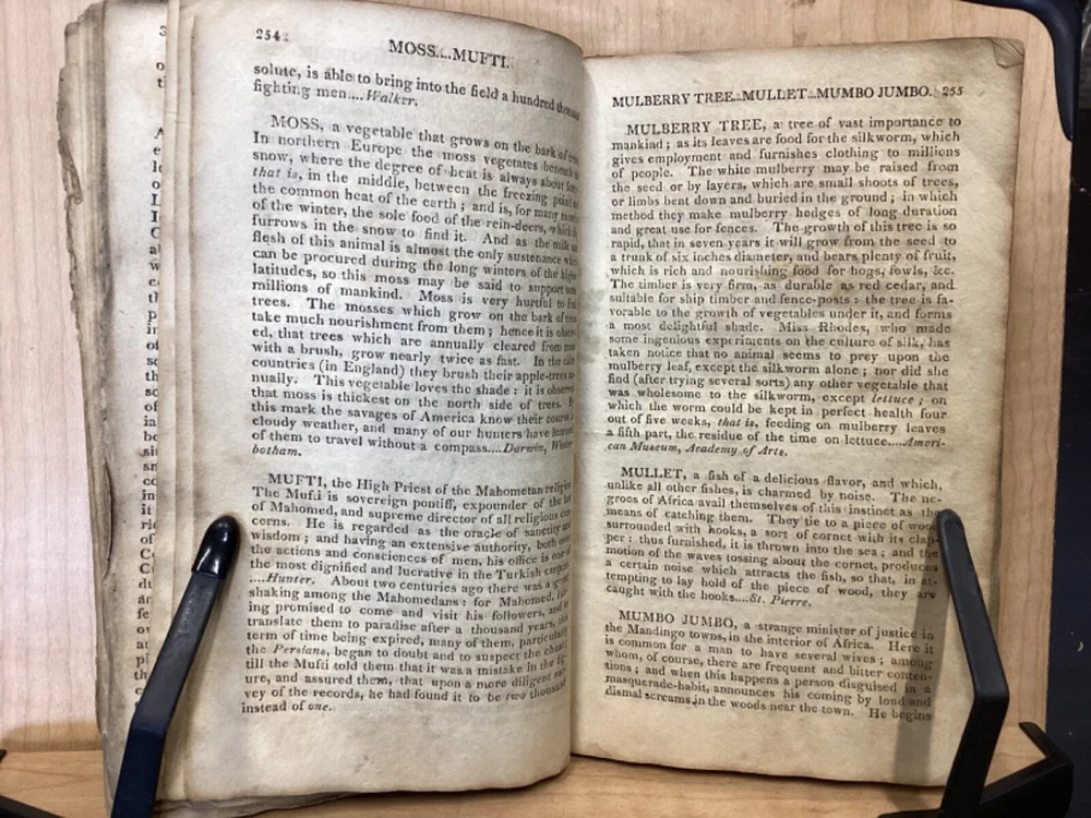The Youth's Companion, or an Historical Dictionary; Consisting of Articles Selected Chiefly from Natural and Civil History, Geography, Astronomy, Zoology, Botany and Mineralogy; Arranged in Alphabetical Order, by Ezra Sampson, Websters and Skinners, Albany, 1813, 412pp, leather, 4.5 x 7", 18mo Fair condition. Wear and chipping to boards. Tips are bumped and edges are scuffed. Cracking and chipping to spine. Joints and hinges are cracked. Provenance on flyleaf (Samuel Bidwell). Toning, age-staining, tea-staining, and ink-staining throughout textblock. Binding is fragile; numerous pages are beginning to come loose. Please see photos. Ezra Sampson (12 February 1749 - 12 December 1828) was a Massachusetts clergyman and graduate of Yale University. He officiated as chaplain in the camp at Roxbury where he encouraged the patriotic determination of the militia with his vigorous discourses. After retiring from the clergy, he moved to New York and began publication of the "Balance" in 1801. He was also the editor of the "Connecticut Courant" in 1804, and continued to write for the paper until 1817. FORN-TUB-0041-BB-2405-JC768