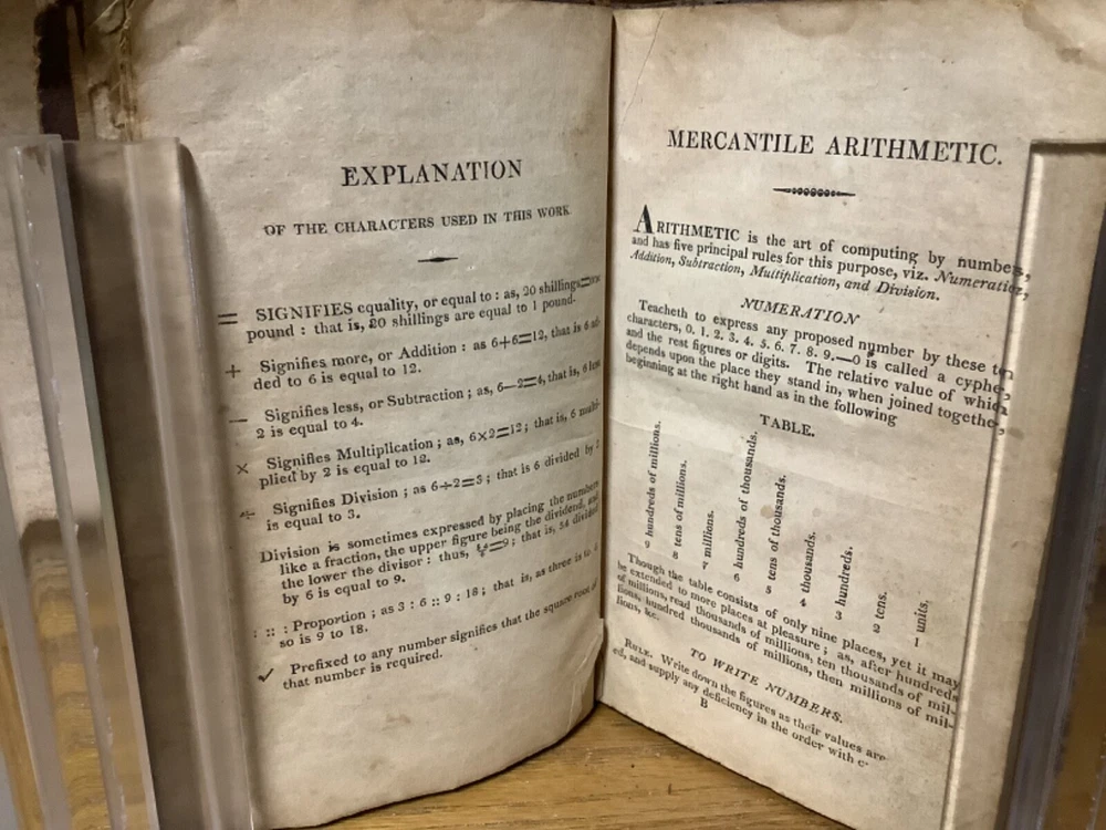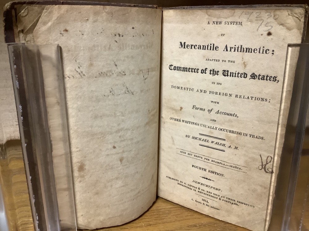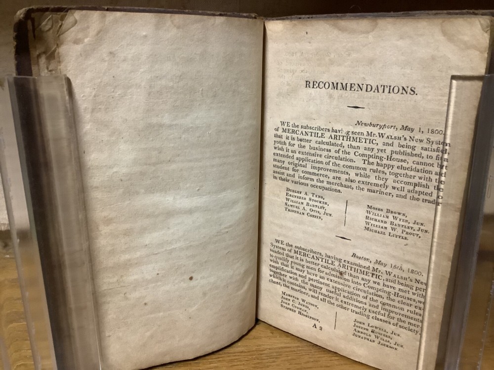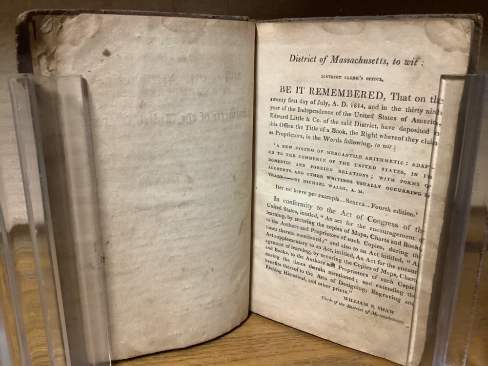 A New System of Mercantile Arithmetic; Adapted to the Commerce of the United States, in its Domestic and Foreign Relations; with Forms of Accounts, and Other Writings Usually Occurring in Trade. By Michael Walsh and printed in Newburyport, Massachusetts by E. Little and Co. 1814, 275 pp, 7” x 4.75”, 8vo, full leather hardcover. In good condition, with superficial rubbing and wear to exterior. Hinges remain in good condition with some cracking at front. Text block remains bound well with minor wear, primarily to end pages. Light markings and marginalia, primarily at front. Some cracking to title label on spine. Staining remnants to edges of some pages. General age-related toning to pages, along with periodic foxing and wear. Please see photographs and ask any questions prior to purchasing. A scarce Newburyport printing and early commercial arithmetic manual designed for the United States. COLU1814ABDB-0524-aj1664