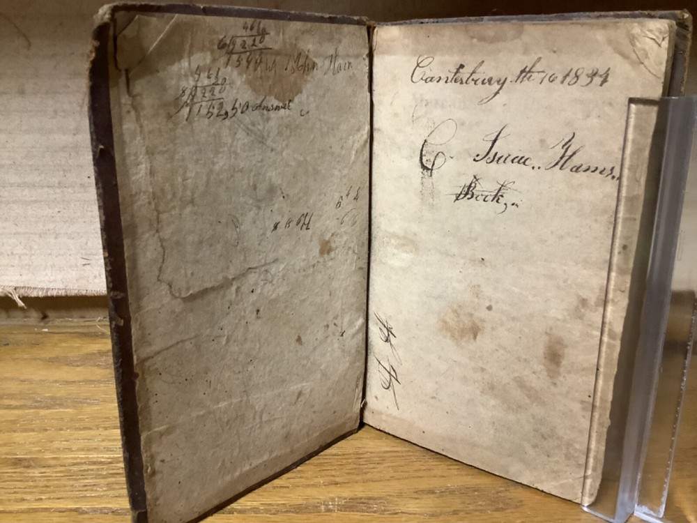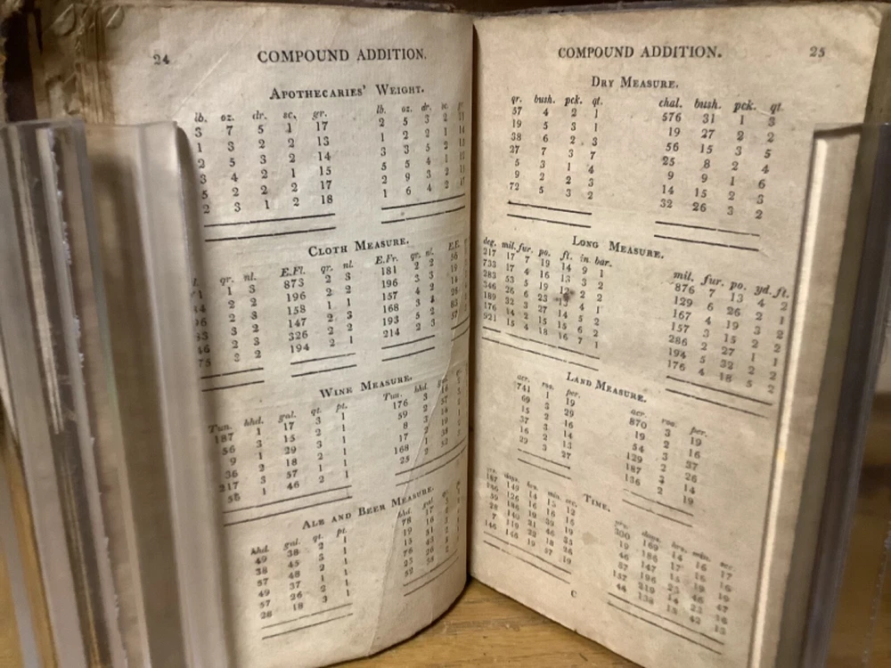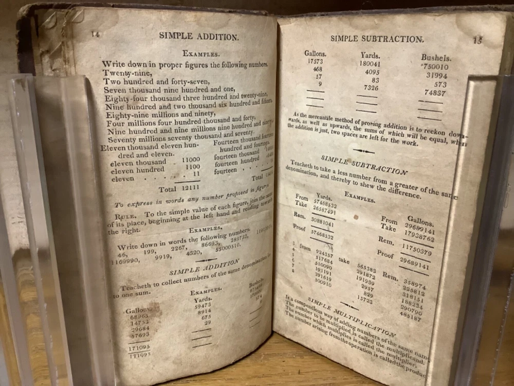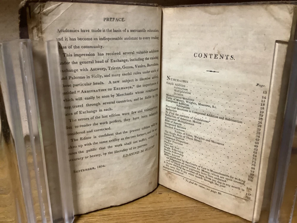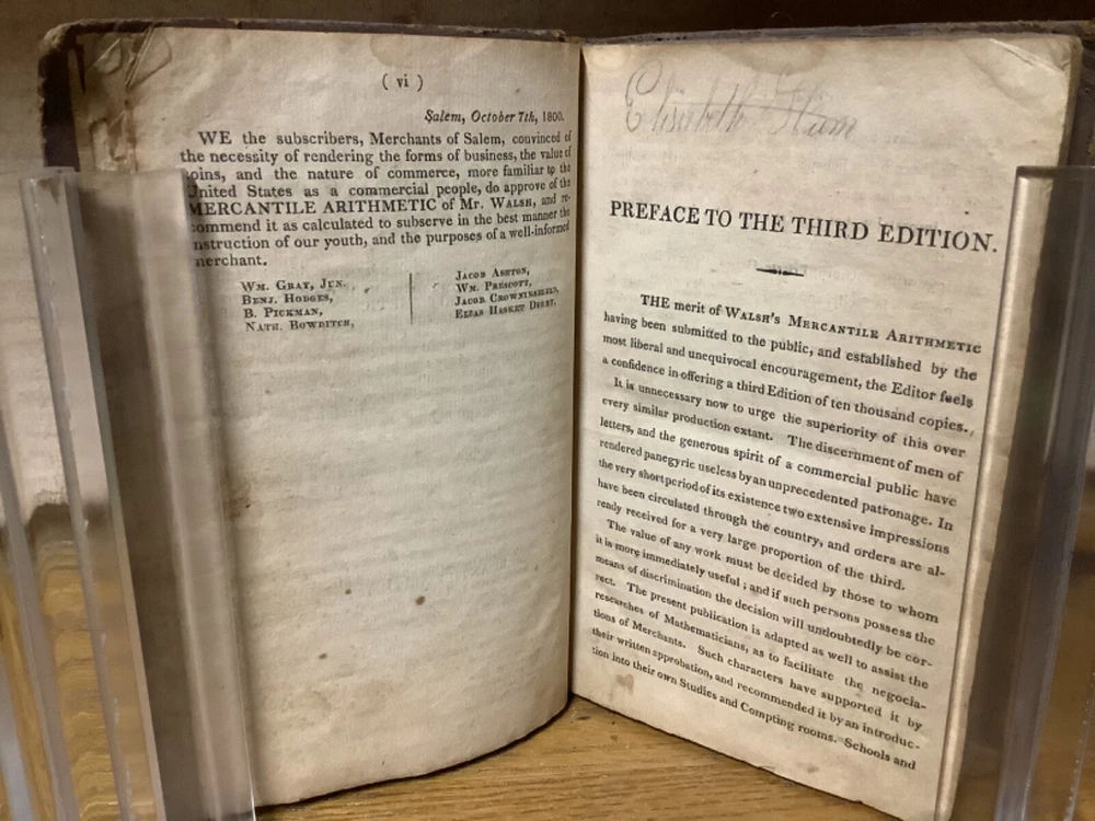 A New System of Mercantile Arithmetic; Adapted to the Commerce of the United States, in its Domestic and Foreign Relations; with Forms of Accounts, and Other Writings Usually Occurring in Trade. By Michael Walsh and printed in Newburyport, Massachusetts by E. Little and Co. 1814, 275 pp, 7” x 4.75”, 8vo, full leather hardcover. In good condition, with superficial rubbing and wear to exterior. Hinges remain in good condition with some cracking at front. Text block remains bound well with minor wear, primarily to end pages. Light markings and marginalia, primarily at front. Some cracking to title label on spine. Staining remnants to edges of some pages. General age-related toning to pages, along with periodic foxing and wear. Please see photographs and ask any questions prior to purchasing. A scarce Newburyport printing and early commercial arithmetic manual designed for the United States. COLU1814ABDB-0524-aj1664