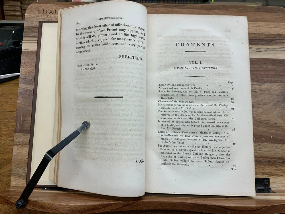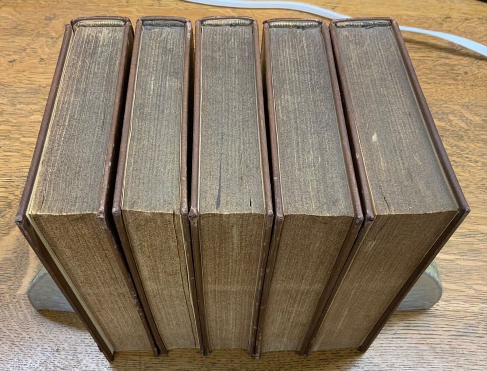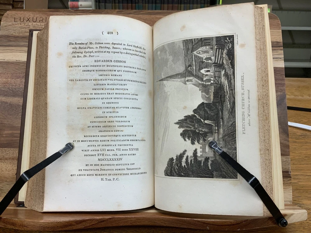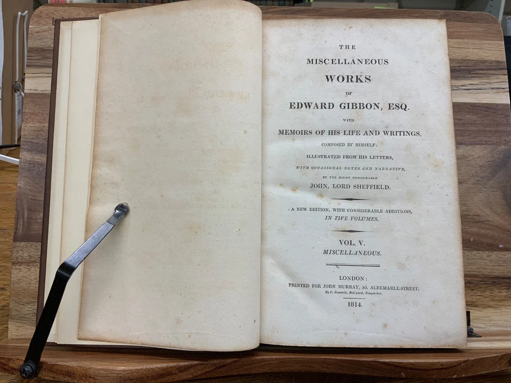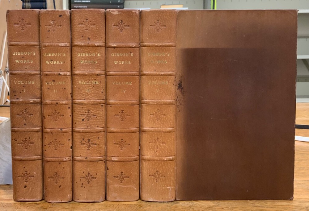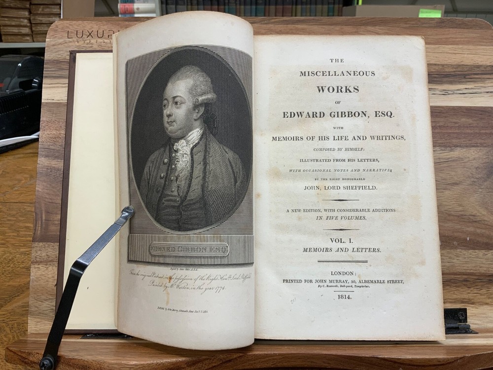 The Miscellaneous Works of Edward Gibbon, Esq. With Memoirs of His Life and Writings, Composed by Himself: Illustrated from His Letters, With Occasional Notes and Narrative, By The Right Honourable John, Lord Sheffield. A New Edition With Considerable Additions, In Five Volumes. London: Printed for John Murray, 1814. Second Edition. Complete set, modern full leather bindings measure 8.5 x 5.5”, 8vos. Vol. I: Memoirs and Letters, 530 p. Vol. II: Letters , 503 p. Vol. III: Historical and Critical, 612 p. Vol. IV: Classical and Critical, 648 p. Vol. V: Miscellaneous , 635 p. In fair condition. Front board of Vol. I DETACHED FROM BINDING. Boards are normally scuffed at edges and corners. Heads and tails of spines scuffed; gilt lettering normally soiled, but legible. Ink splotching on spines of Vols. I-III. Off-setting from shelf-wear on front board of Vol. V. End-papers fresh. Off-setting on title page of Vol. 1 from frontispiece. Normal to light toning throughout text-blocks, mostly in margins. Scattered age-staining. Front board DETACHED Vol. I, remainder of Vols. Remain tight and intact. Please see photos and ask questions, if any, before purchasing. Edward Gibbon FRS (1737 – 1794) was an English essayist, historian, and politician. His most important work, The History of the Decline and Fall of the Roman Empire, published in six volumes between 1776 and 1789, is known for the quality and irony of its prose, its use of primary sources, and its polemical criticism of organized religion. Includes A Vindication of some Passages in the Fifteenth and Sixteenth Chapters of the History of the Decline and Fall of the Roman Empire ( Vol.IV pages 575-648 ). For reference these chapters are as follows: Chapter 15 : The Progress of the Christian Religion, and the Sentiments, Manners, Numbers, and Condition of the Primitive Christians – Ceremonies, Arts, and Festivals Chapter 16: The Conduct of the Roman Government towards the Christians, from Reign of Nero to that of Constantine – Persecution of Jews & Christians by Domitian. Complete set in five volumes. Second Edition. RARES1814CLMP 05/25 - HK2436