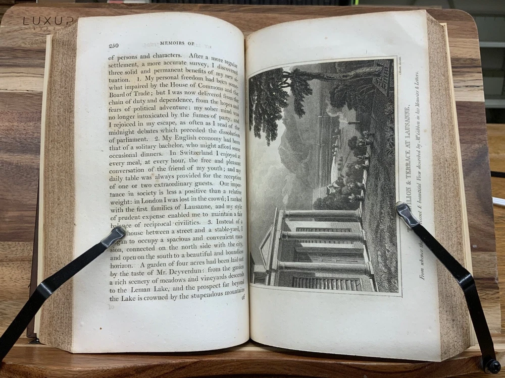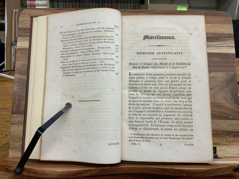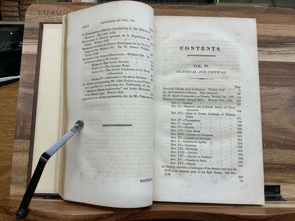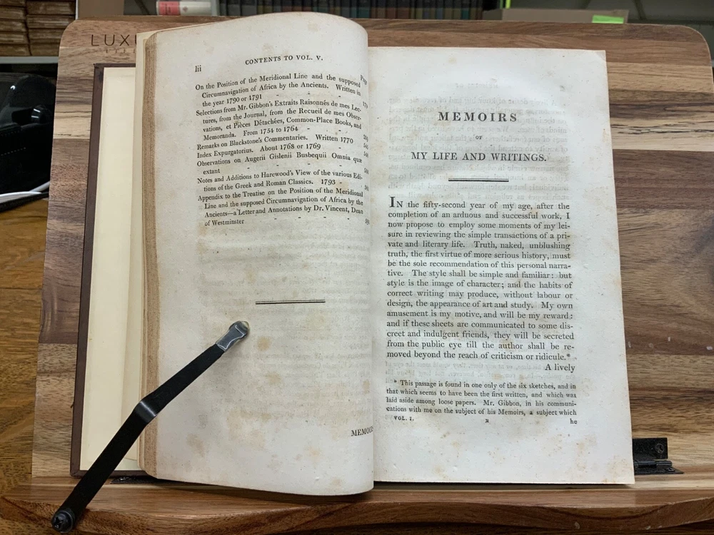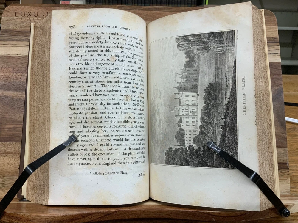The Miscellaneous Works of Edward Gibbon, Esq. With Memoirs of His Life and Writings, Composed by Himself: Illustrated from His Letters, With Occasional Notes and Narrative, By The Right Honourable John, Lord Sheffield. A New Edition With Considerable Additions, In Five Volumes. London: Printed for John Murray, 1814. Second Edition. Complete set, modern full leather bindings measure 8.5 x 5.5”, 8vos. Vol. I: Memoirs and Letters, 530 p. Vol. II: Letters , 503 p. Vol. III: Historical and Critical, 612 p. Vol. IV: Classical and Critical, 648 p. Vol. V: Miscellaneous , 635 p. In fair condition. Front board of Vol. I DETACHED FROM BINDING. Boards are normally scuffed at edges and corners. Heads and tails of spines scuffed; gilt lettering normally soiled, but legible. Ink splotching on spines of Vols. I-III. Off-setting from shelf-wear on front board of Vol. V. End-papers fresh. Off-setting on title page of Vol. 1 from frontispiece. Normal to light toning throughout text-blocks, mostly in margins. Scattered age-staining. Front board DETACHED Vol. I, remainder of Vols. Remain tight and intact. Please see photos and ask questions, if any, before purchasing. Edward Gibbon FRS (1737 – 1794) was an English essayist, historian, and politician. His most important work, The History of the Decline and Fall of the Roman Empire, published in six volumes between 1776 and 1789, is known for the quality and irony of its prose, its use of primary sources, and its polemical criticism of organized religion. Includes A Vindication of some Passages in the Fifteenth and Sixteenth Chapters of the History of the Decline and Fall of the Roman Empire ( Vol.IV pages 575-648 ). For reference these chapters are as follows: Chapter 15 : The Progress of the Christian Religion, and the Sentiments, Manners, Numbers, and Condition of the Primitive Christians – Ceremonies, Arts, and Festivals Chapter 16: The Conduct of the Roman Government towards the Christians, from Reign of Nero to that of Constantine – Persecution of Jews & Christians by Domitian. Complete set in five volumes. Second Edition. RARES1814CLMP 05/25 - HK2436