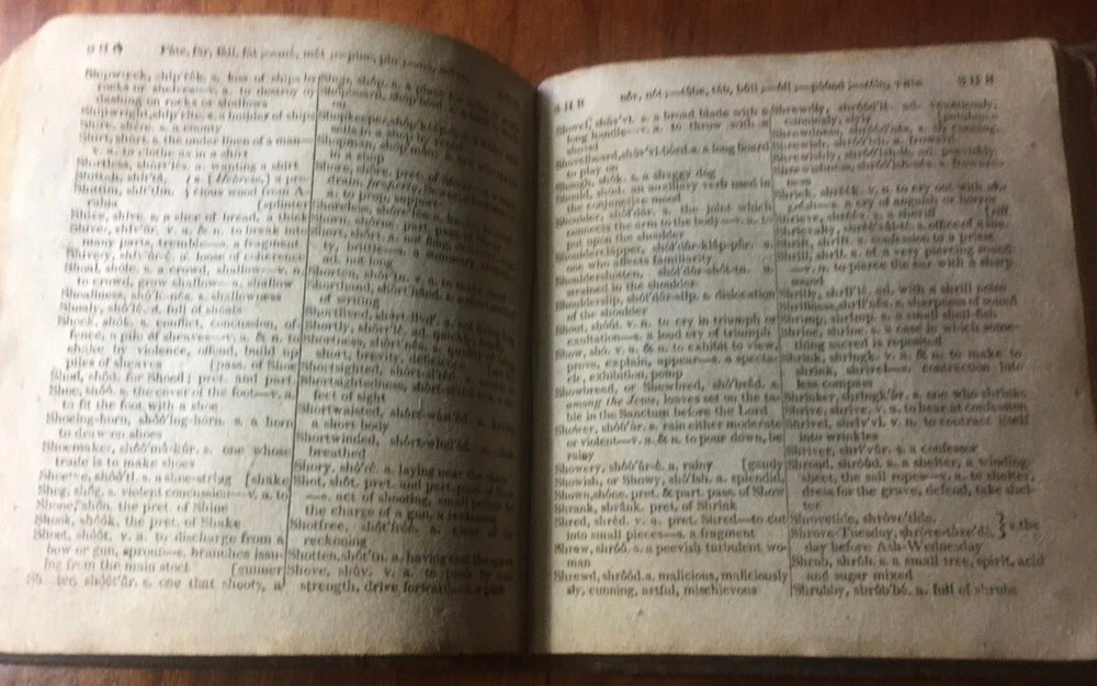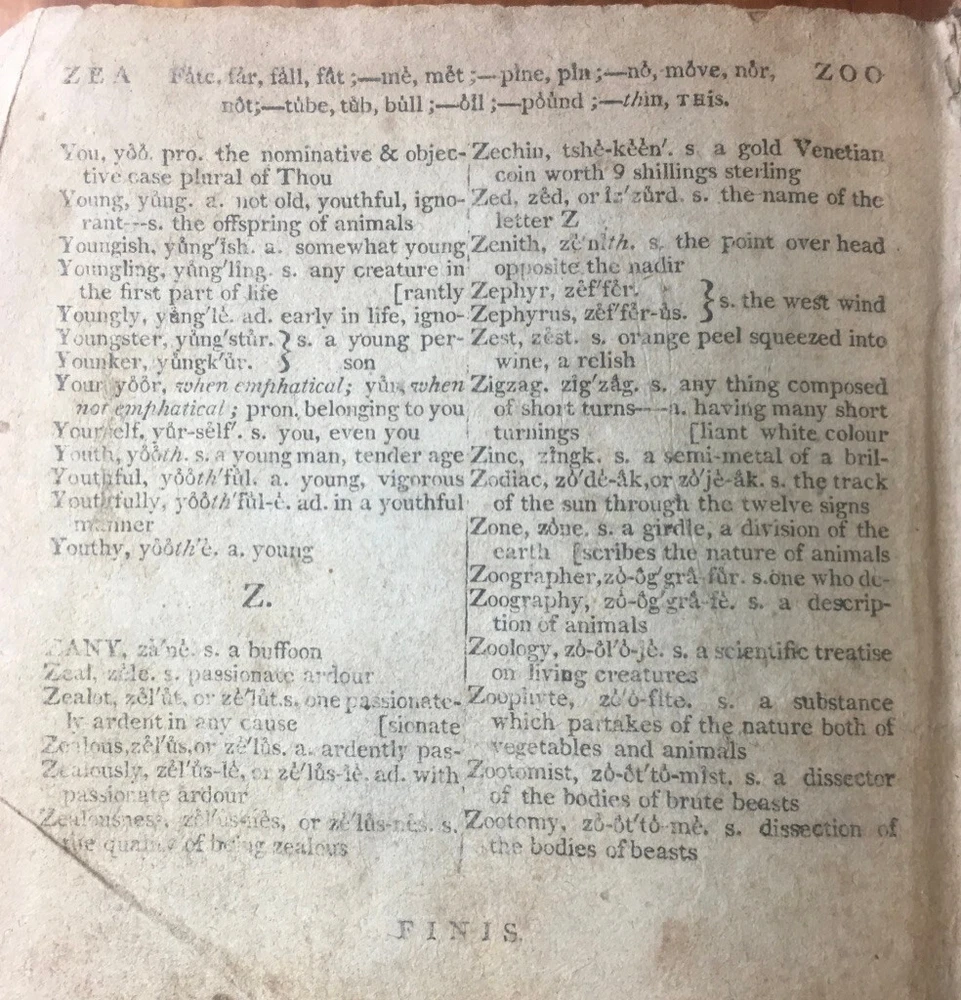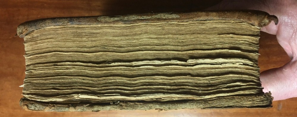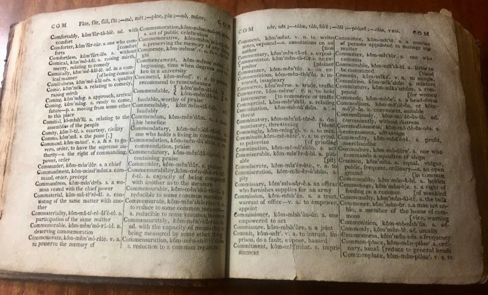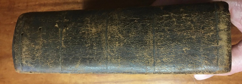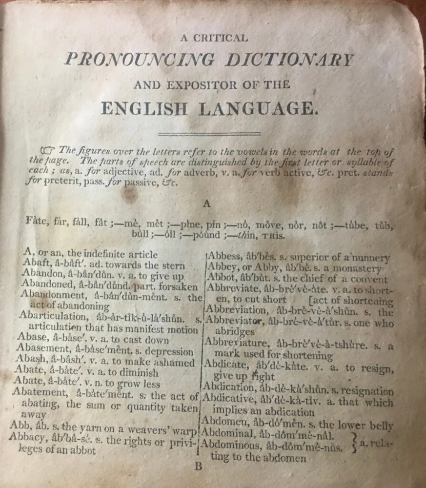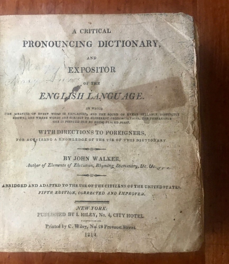 Up for sale is a leather bound book titled "A Critical Pronouncing Dictionary and Expositor of the English Language" by John Walker. Published by L. Riley, New York, 1814. The pages are not number, hundreds of page in length, 5 1/4" by 5 3/4" in size. Full leather binding. This vintage leather bound book is in good condition, with rub wear to the covers and the spine. Some ink writing on the front paste down, and some writing on the title page and ink markings on the back paste down. A shadow from removed tape? on the title page. No other markings in the book. Cover board hinges are cracked but are firmly attached. There is foxing and browning to the pages throughout. I believe all pages are present. Buyer to pay $5.00 for shipping. International buyers must use ebay global shipping.