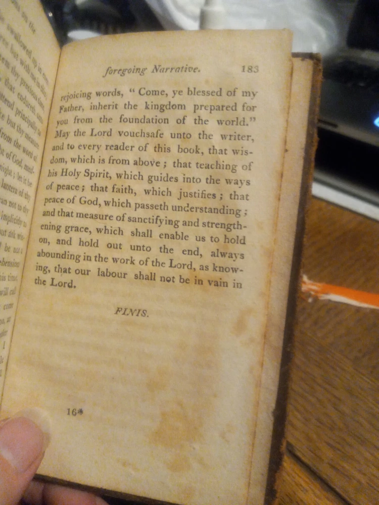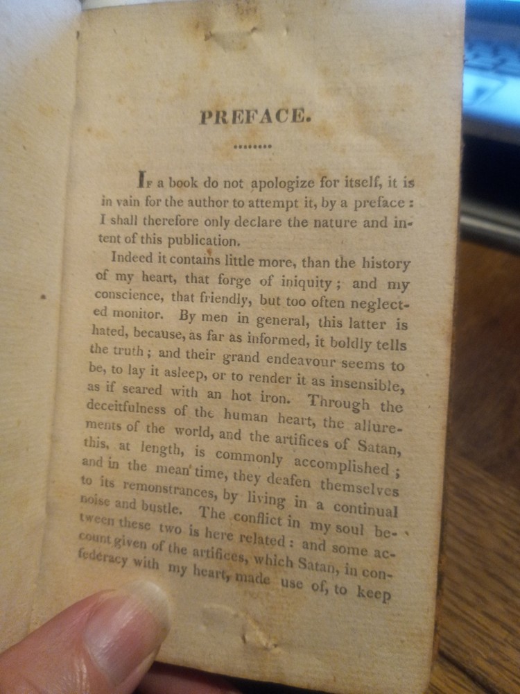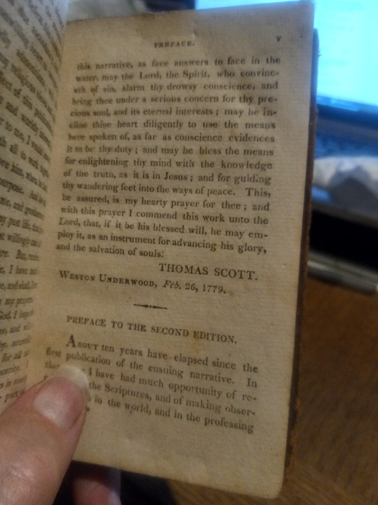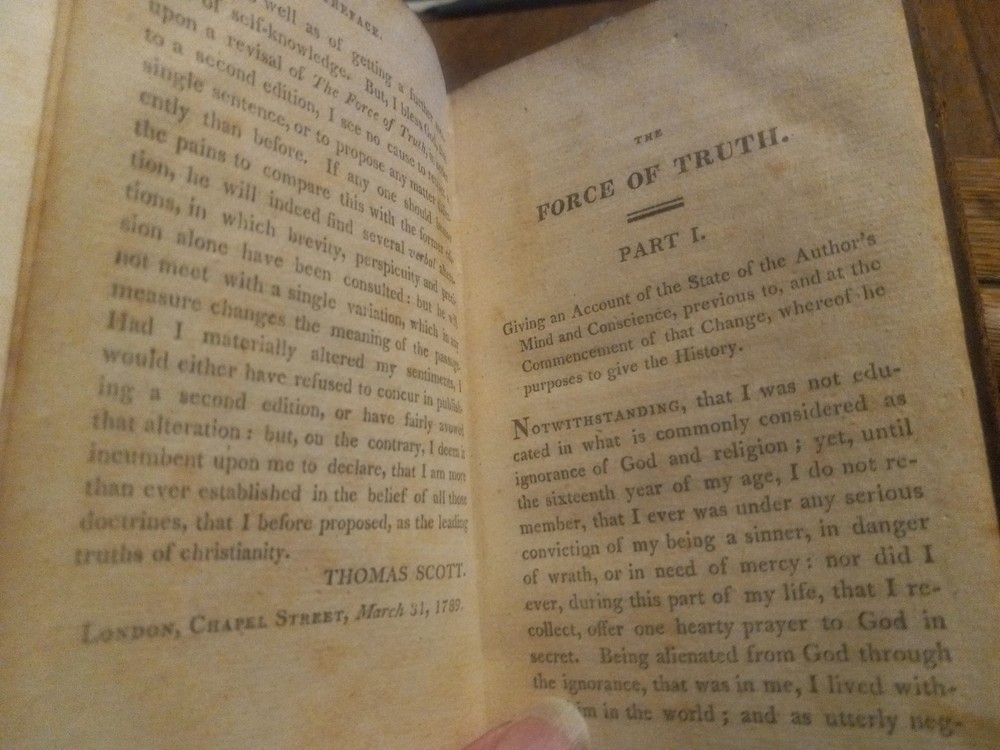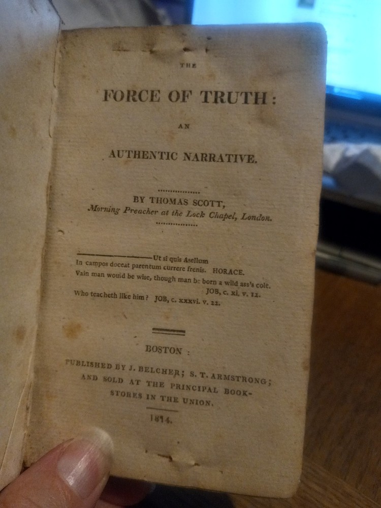 UP FOR SALE TODAY WE HAVE "THE FORCE OF TRUTH: AN AUTHENTIC NARRATIVE. -- BY THOMAS SCOTT, MORNING PREACHER AT THE LOCK CHAPEL, LONDON. -- BOSTON: PUBLISHED BY J. BELCHER, S. T. ARMSTRONG, AND SOLD AT THE PRINCIPAL BOOKSTORES IN THE UNION. - 1814."(1814 PRINTING OF THIS BOOK FIRST PUBLISHED IN ENGLAND ABOUT 1780, BOUND IN A SOMEWHAT DAMAGED BUT STILL ATTRACTIVE FULL LEATHER BINDING!!)-- Here we have a very good for its age copy of this two hundred and eleven year old pocket sized book, which describes the spiritual journey taken by its author, Thomas Scott, which brings him to a more evangelical view of Christianity. The bottom quarter of the front hinge of this book looks like it might have been chewed on by bugs or a rodent, but otherwise the gilt embossed and decorated full leather binding still looks quite nice. This seems to be the earliest edition of this book currently available for sale anywhere.-- THIS IS A SMALL FULL LEATHERBOUND BOOK OF 185 PAGES PLUS A PAGE OF PUBLISHER'S ADVERTISING, WHICH MEASURES ABOUT 6 BY 3 AND A HALF INCHES IN DIAMETER--I AM PUTTING THIS UP FOR SALE TODAY AT A REASONABLE BUY-IT-NOW PRICE WITH FREE SHIPPING,OR FEEL FREE TO SUBMIT YOUR BEST OFFER--GARY FROM HAUNTED MANSION RELIX--