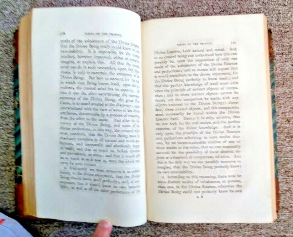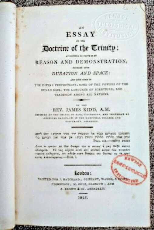 Greetings! Old Saratoga Books is pleased to offer: An Essay on the Doctrine of the Trinity: Attempting to Prove it by Reason and Demonstration, Founded Upon Duration and Space; and Upon Some of the Divine Perfections; Some of the Powers of the Human Soul, the Language of Scripture; and Tradition Among All Nations, by Rev. James Kidd. London: Printed for J. Hatchard, 1815. Three-quarter leather with marbled boards. xxvii, 576 pp. Ex-library copy. Fair condition. Leather is dried out and cracking, joints tender, library markings on spine, front free endpaper, title page, and rear free endpaper. The author was Minister of the Chapel of Ease, Gilcomston, and Professor of Oriental Languages in the Marischal College and University, Aberdeen. Thank you for visiting our auctions. Old Saratoga Books owners Dan and Rachel Jagareski have been selling books since 1996. We had an open shop for twenty years in the historic village of Schuylerville and now sell books exclusively online. We are members of the Independent Online Booksellers Association (IOBA).