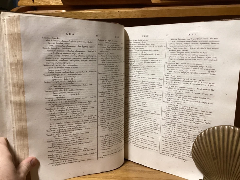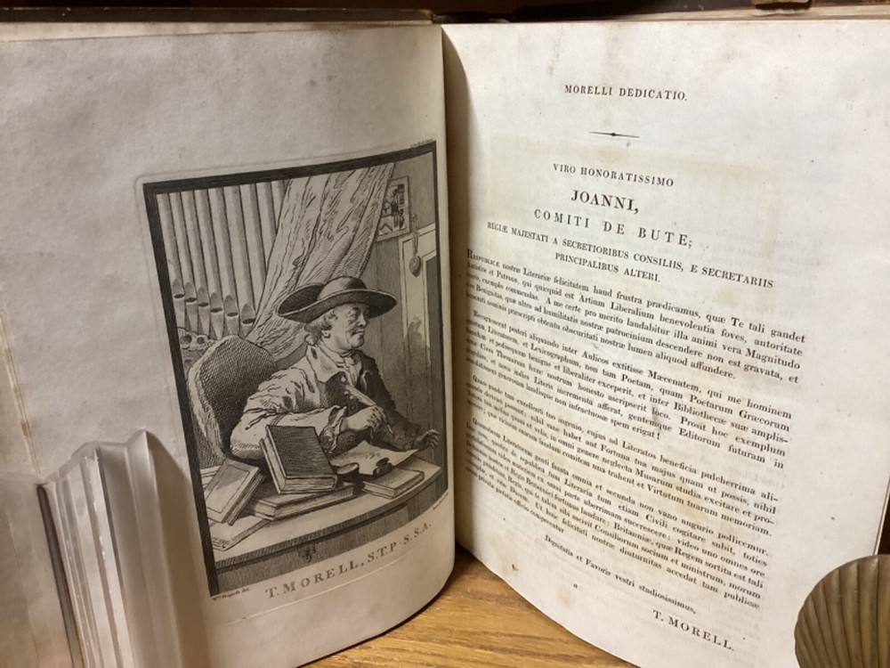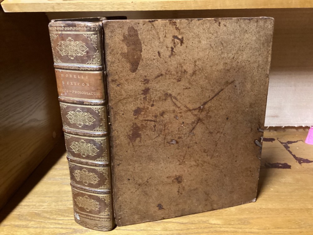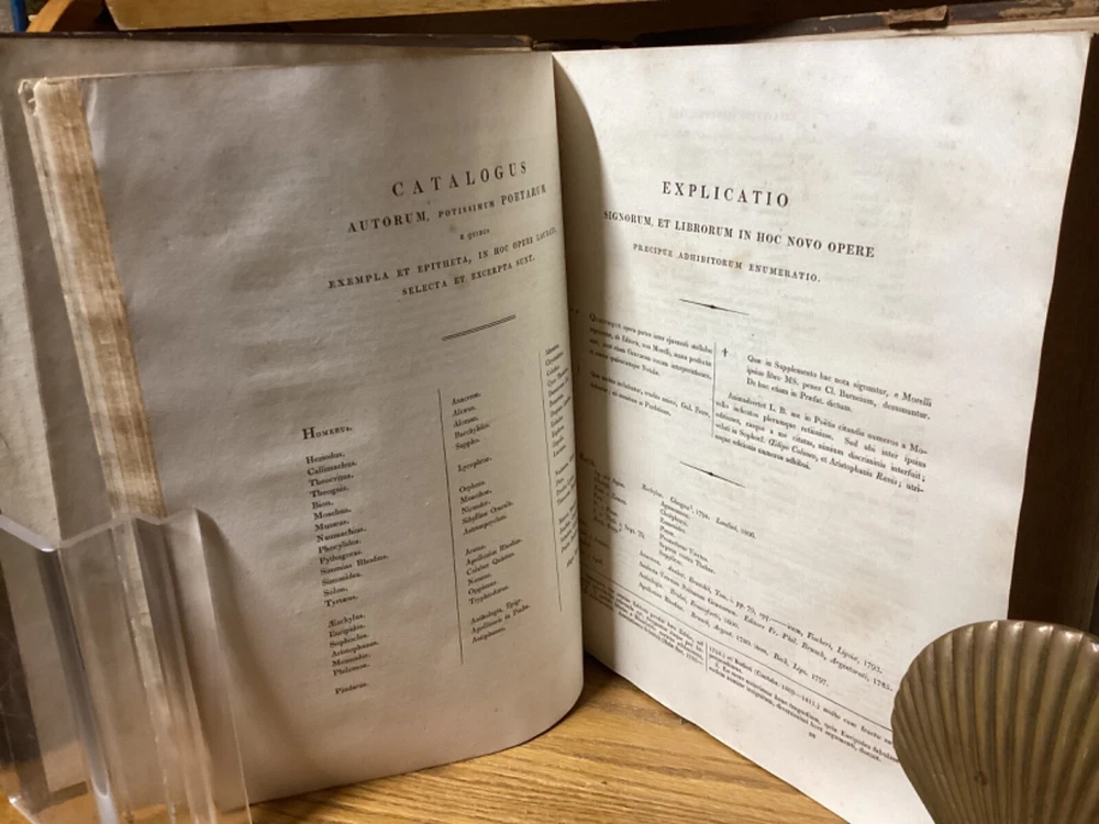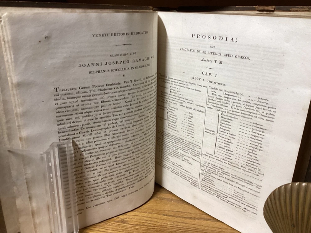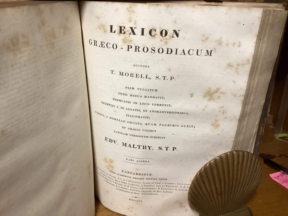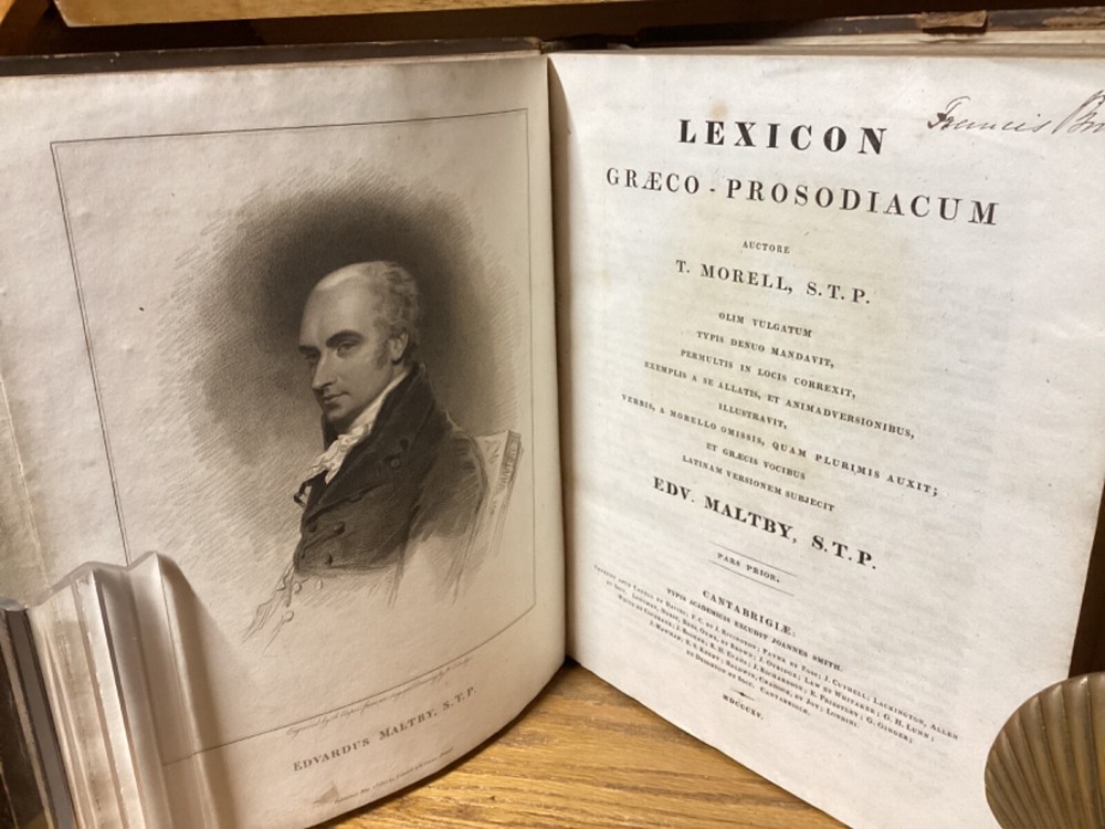 Lexicon Graeco-Prosodiacum. By Thomas Morrell and revised by Edward Maltby. Printed in Canterbury by Smith. 1815, [93] + 1148 pp. 12.25” x 9.5”. 4to. Hardcover full leather. In good condition, with light rubbing and wear to exterior, including along edges and corners. Some cracking and rubbing to hinges, with wear visible on both interior and exterior. Text block remains bound well. Some markings and inscriptions, primarily at front. General age-related toning to pages, along with periodic foxing and wear. Please see photographs and ask any questions prior to purchasing. A scarce Greek Lexicon revised by Church of England clergyman Edward Maltby (1770-1859). A controversial figure, Maltby attracted attention for his liberal teachings, his large personal wealth, and a variety of statements made throughout his long career. Please note size and weight of volume.
