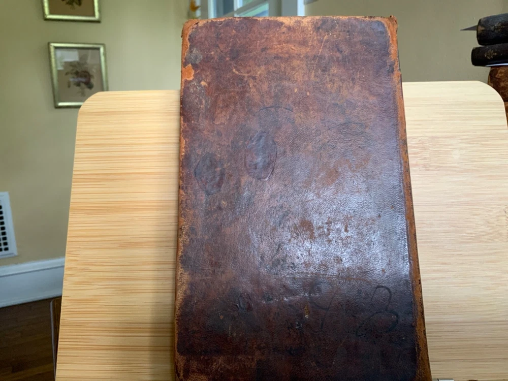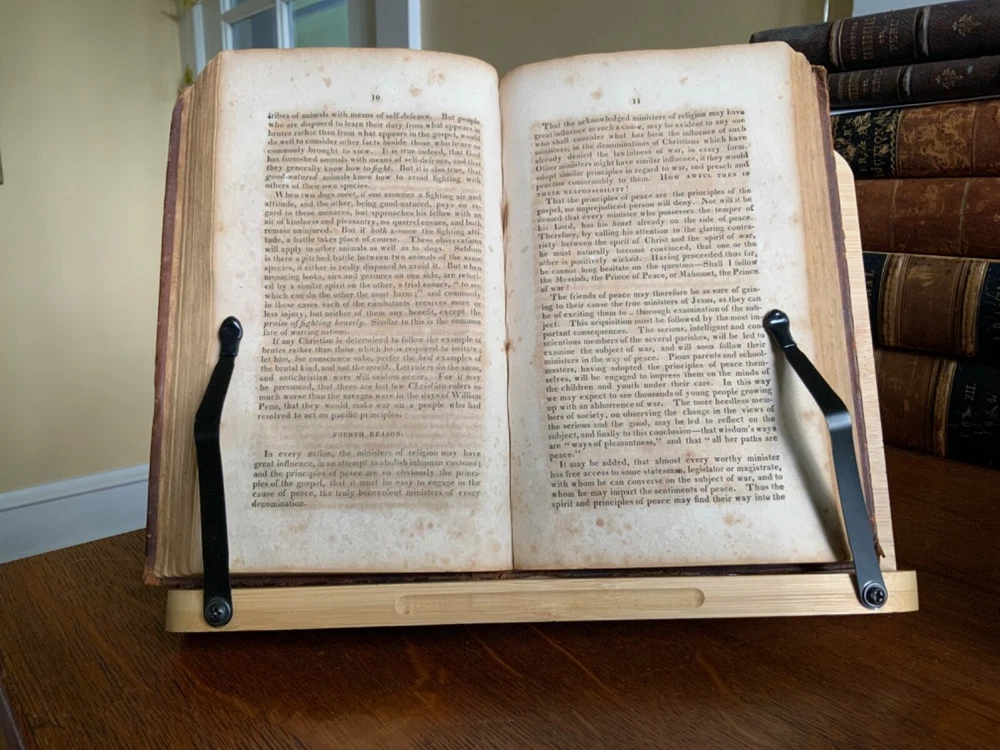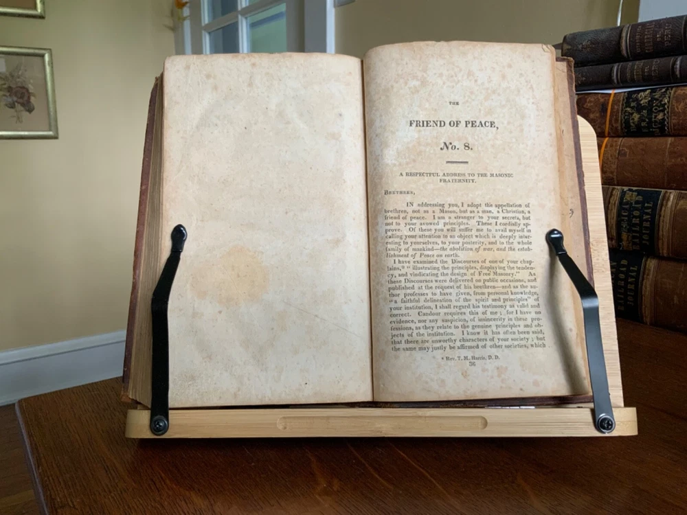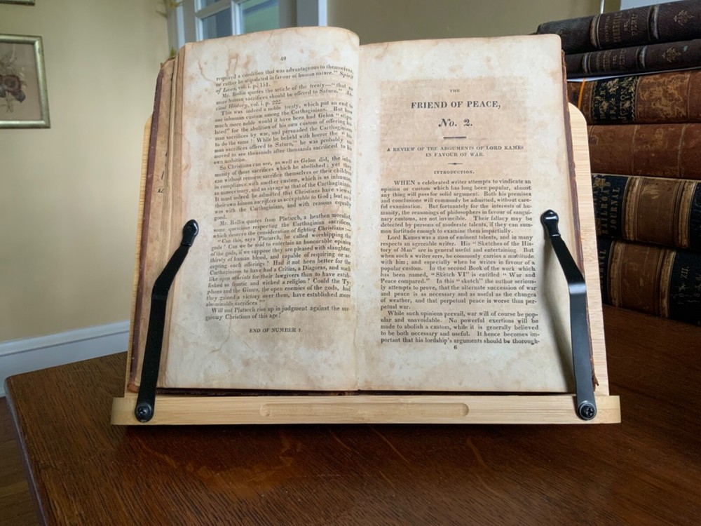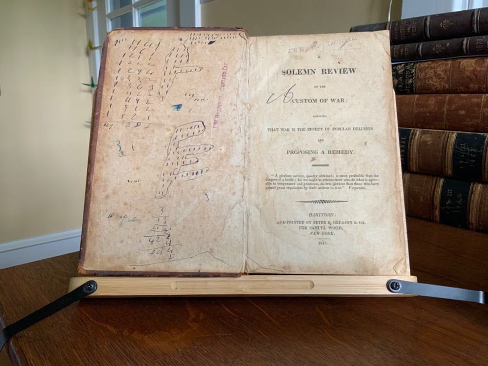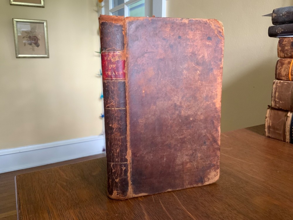 A Solemn Review of the Custom of War; Showing that War is the Effect of Popular Delusion, and Proposing a Remedy, Re-printed By Peter B. Gleason & Co for Samuel Wood, Hartford, 1815, 23 pp, The Friend of Peace, No. 1, Containing, a Special Interview Between the President of the United States and Omar, an Officer Dismissed for Duelling; Six Letters from Omar to the President; with a Review of the Power Assumed by Rulers over the Laws of God and the Lives of Men, in Making War, and Omar’s Solitary Reflections. The Whole Reported By Philo Pacificus, Printed and Sold by Samuel Wood & Sons, New York, 1816, 40 pp, The Friend of Peace No. 2, A Review of the Arguments of Lord Kames in Favour of War, 39 pp, The Friend of Peace No. 3. The Horrors of Napoleon’s Campaign in Russia, 40 pp, The Friend of Peace No. 4. Reasons for Believing that Efforts for the Abolition of War Will Not Be in Vain, 40 pp, The Friend of Peace No. 5. Review of Military Martyrdom, 38 pp, The Friend of Peace No. 6., Peace Societies Compared with Other Benevolent Institutions, 39 pp, The Friend of Peace, No. 7. Eirenikos to Philo Pacificus Letter II, 38 pp, The Friend of Peace No. 8, A Respectful Address to the Masonic Fraternity, 40 pp, full original leather, 8.5 x 5.5”, 8vo. In fair condition. Light wear to extremities with minor scuffing to edges and corners. Corners rubbed with slight loss of tips. Two small repairs to rear board with old hand inscriptions at bottom edge. Joints and ends exhibit red rot. Spine creasing with slight loss of spine label at top right corner. Leather abraded overall with numerous scratch marks. Old hand notations and ownership throughout end papers and textblock. Stamp of J.W. Brougher, Oakland, Cal stamp on pastedown and title. Lacking fly. Numerous instances of age staining, dampness staining and foxing throughout. Toned at edges with finger soiling in the margins. Binding remains intact. Please see photos. A collection of pacifist lectures by noted clergyman Noah Worcester (1758-1837). He published several important tracts on religious subjects, and appears to have had some unorthodox views of the Holy Trinity. Worcester reflected on the effects of war and became a pacifist after the War of 1812. In this work he argued that violence and destruction of war was inconsistent with Christian values. He found the Massachusetts Peace Society, and went to forefront a popular anti-war movement that emerged in American after the War of 1812. Scarce. COLR1815AKLB-623