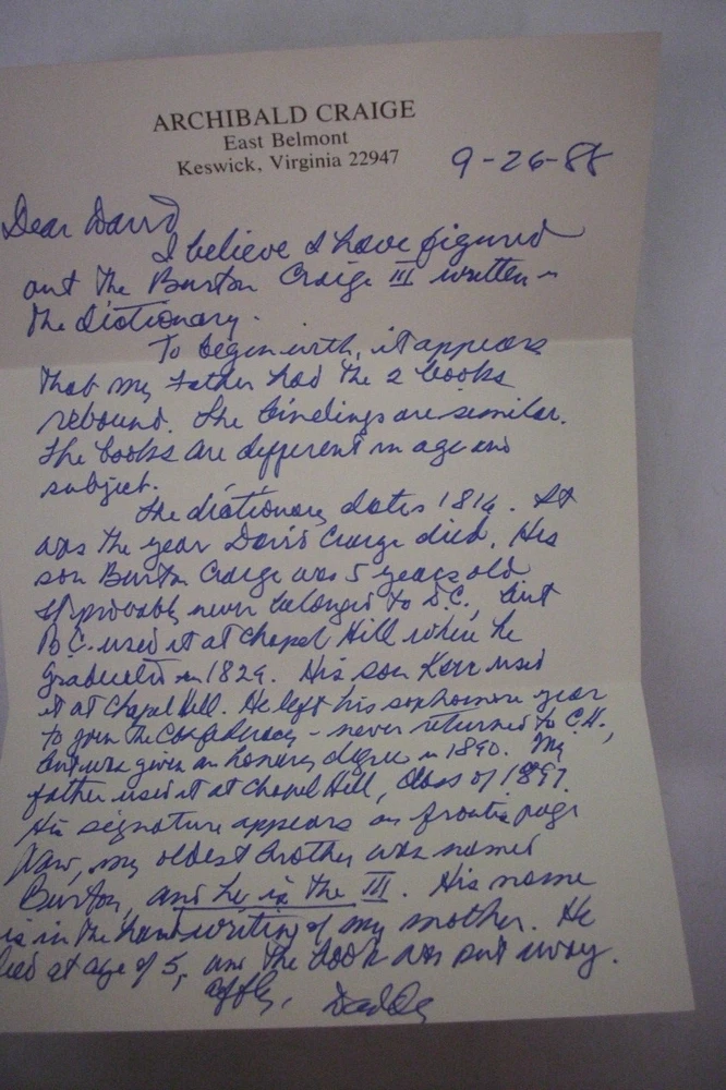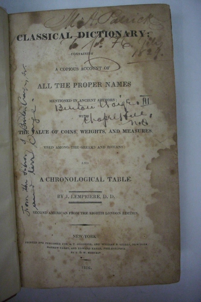 You are bidding on a very scarce hardcover book titled Classical Dictionary: Containing A Copious Account of All The Proper Names Mentioned in Ancient Authors; With the Value of Coins, Weights, and Measures Used Among the Greeks and Romans and a Chronological Table. By J. Lempriere, D. D. This is just the Second American Edition From the Eighth London Edition. Printed and published in New York for A. T. Goodrich, and William B. Gilley, Mathew Carey, and Edward Earle, by T. & W. Mercein, 1816. Imagine, this book is over 200 years old!! The book has old signatures on the title page dealing with the Craige family of Chapel Hill, North Carolina. There is also a letter tucked into the book which sheds some light on the Craige family history. The letter is from Archibald Craige from Keswick, Virginia penned in 1988 (see photo). Book is fully bound in polished calf leather. It was probably rebound into this binding in the late 1800's. The binding shows some wear but remains in overall very good condition. This is a thick book with plenty of pages. The pages are not numbered but if I had to guess, I'd say there are over 1,000 pages. All pages are tightly bound. The pages show some foxing/soiling with the title page being the worst. Most pages show only light foxing. Book is solid and remains in good condition. This is a great family heirloom that would be terrific if it could find its way back to the Craige family! Nice book to add to a collection! This is a very rare book with one of a kind provenance. Very collectible! Great gift idea! (Inventory: 1296Z) Track Page Views With Auctiva's FREE Counter