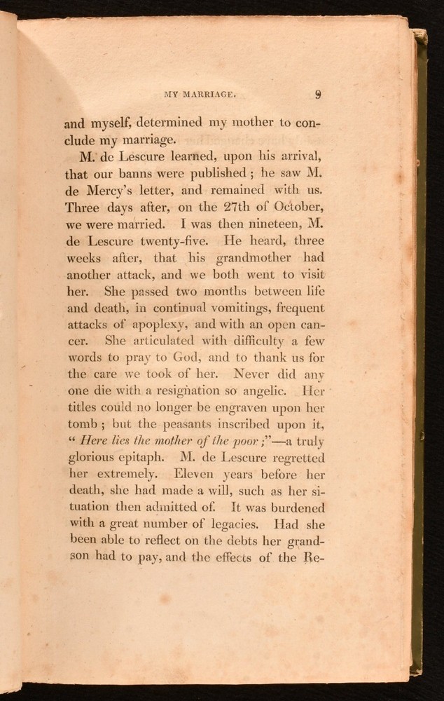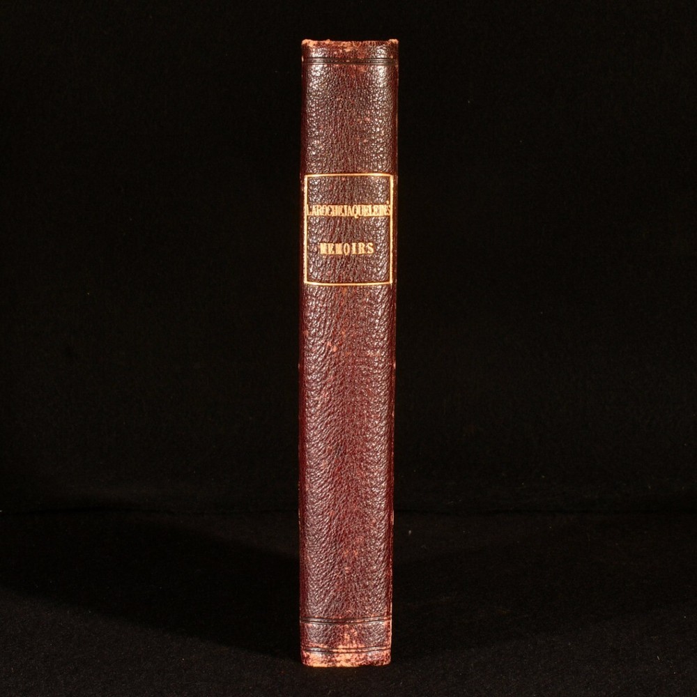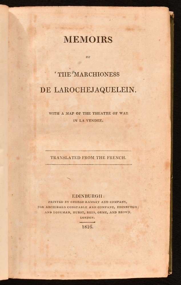 Click here to see our other books! Memoirs of the Marchioness de Larochejaquelein Marchioness de Larochejaquelein 1816 George Ramsay and Company for Archibald Constable and Company : Edinburgh 9" by 6" vi, 535pp. SUMMARY The first English translation of the memoirs of the Marchioness de Larochejaquelein, with a folding map. First Edition,Folding Plates,Leather Binding,Original Binding,Publishers' Original Binding Overall Condition: Good This book weighs 1 KG when packed UK Postage: £ 3.99 US Postage: £ 22.99 EU Postage : £ 16.99 European Postage: £ 17.99 Asia Postage: £ 22.99 Worldwide Postage: £ 28.99 DESCRIPTION First English translation. With a folding map to the front of the text of the theatre of war in La Vendee. The memoirs of Marie Louise Victoire de Donnissan de La Rochejaquelein, a French memoirist known for this work. Within this work La Rochejaquelein describes both the Demonstration of 20 June 1792 as well as the Storming of the Tuileries. She and her spouse left Paris before the September massacres, but were involved in the Revolt in the Vendee. CONDITION Bound in quarter crushed morocco with paper covered boards. Externally, smart with rubbing and light bumping to the extremities. Light fading to the spine with the odd mark to the boards. Internally, firmly bound. Pages are very bright with scattered spotting throughout. Light age toning to the first and last few pages. Overall Condition: Good GLOSSARY OF TERMS Overall Condition (Dustwrapper condition rating is shown after that for the book itself, where a dustwrapper is present) Fine - Very well preserved copy showing very little wear Very Good Indeed - Only one or two minor faults, really a very attractive copy Very Good - Quite a wide term meaning no major faults but probably several smaller ones often expected given the age of the book, but still a respectable copy Good - Meaning not very good. Some more serious faults as will be described in the condition report under 'condition' Good Only - Meaning one or more faults that could really do with repair Fair - As with good only above but with other faults leaving a compromised copy even after repair Poor - Really bad and possibly seriously incomplete. We only sell books in this condition where their rarity or value makes them attractive none the less. Major defects will be described. GUARANTEE We offer a full money back guarantee on our descriptions. Please ask for details and conditions. We prefer PAYPAL. If you pay via PAYPAL we will post the item off the same or the next working day with the postage you have selected. Please note we cannot accept USD cheques
