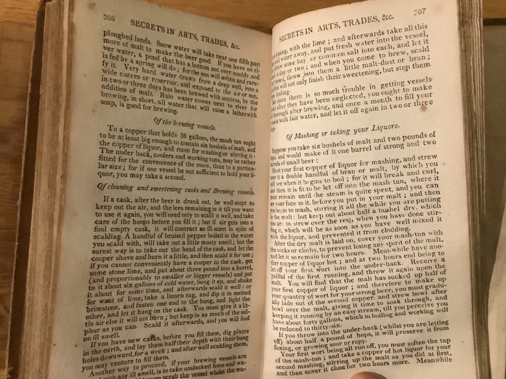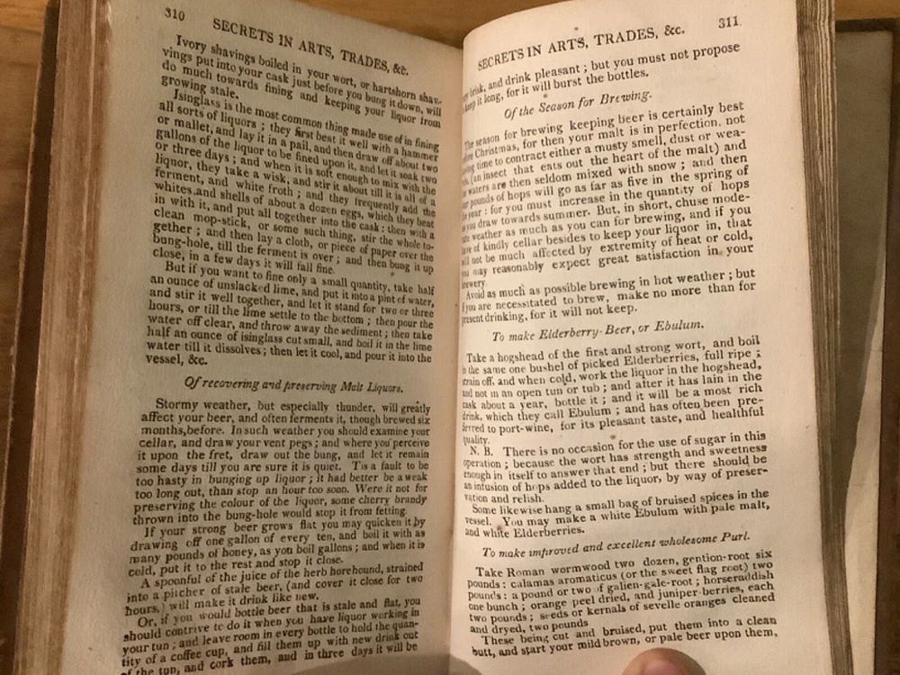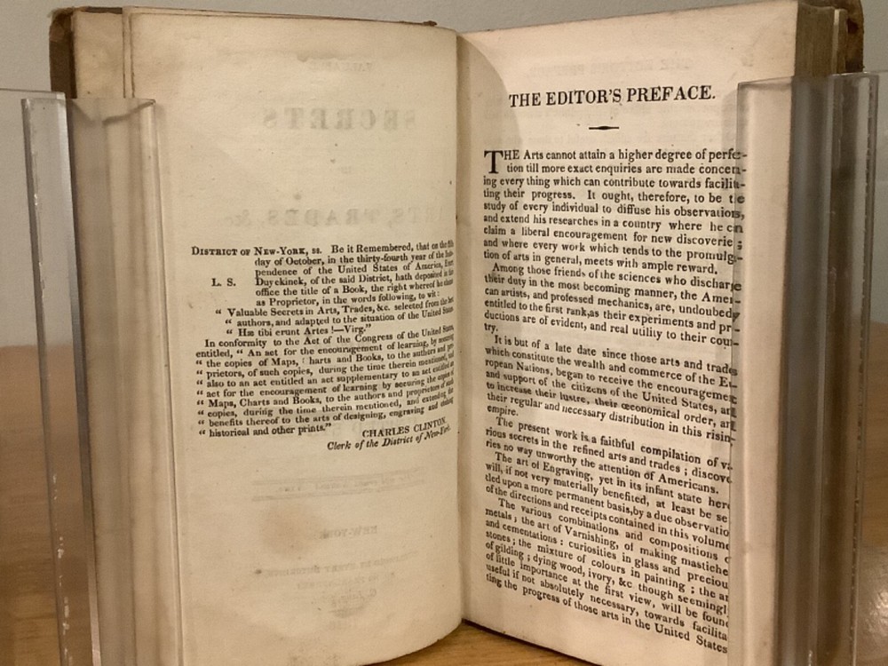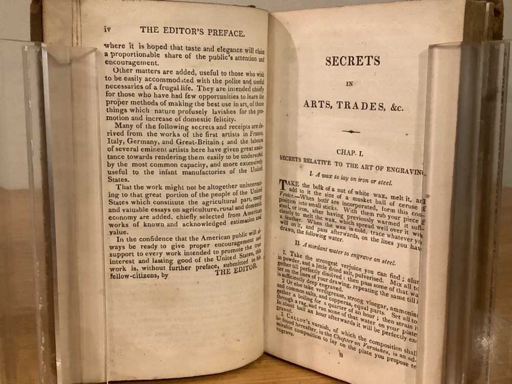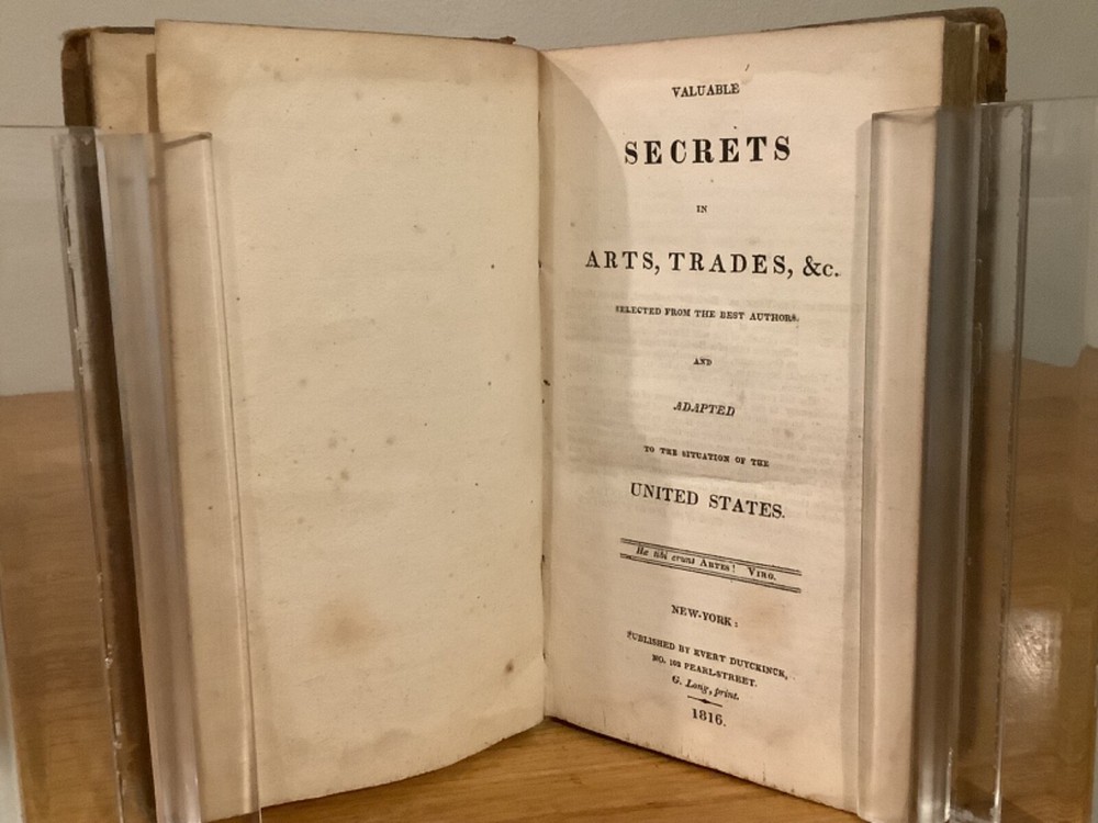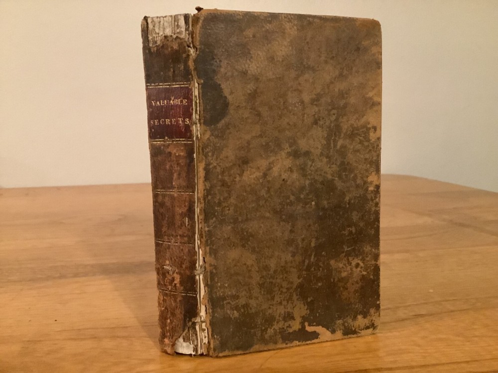 Valuable Secrets in Arts, Trades, &c. Selected from the Best Authors and Adapted to the Situation of the United States. Printed in New York City by Evert Duyckinck. 1816, 317 pp, 6.75 x 4.25”, 12mo, full leather hardcover. As-is, with the front board loose and mostly detached. Rubbing and wear to boards. Loss of leather at top of spine. Text block remains in good condition and is bound well. Light marginalia towards front of book. General age-related toning to pages, along with periodic foxing and wear. Please see photographs and ask any questions prior to purchasing. A scarce reference book, listing a wide variety of trade “secrets”, including a small section on brewing towards the back. A wonderful piece for restoration. COLU1816CHJW FORN0755 HKVAR1223