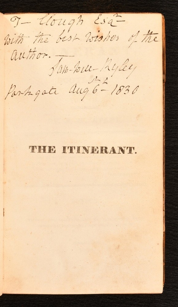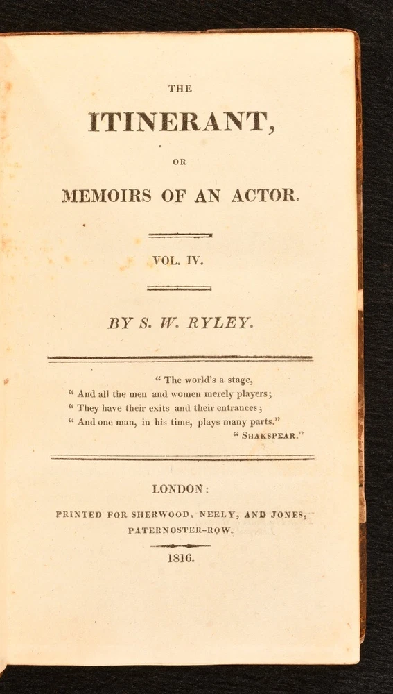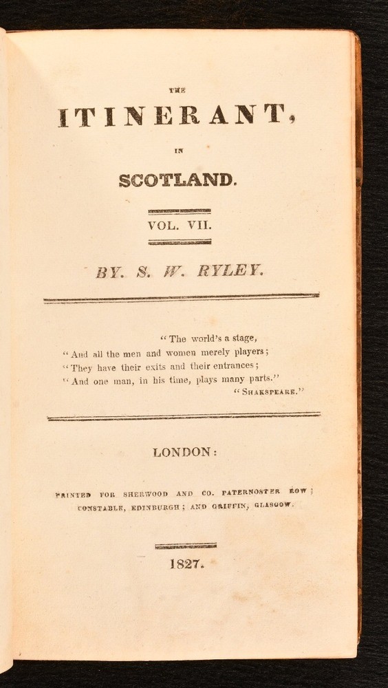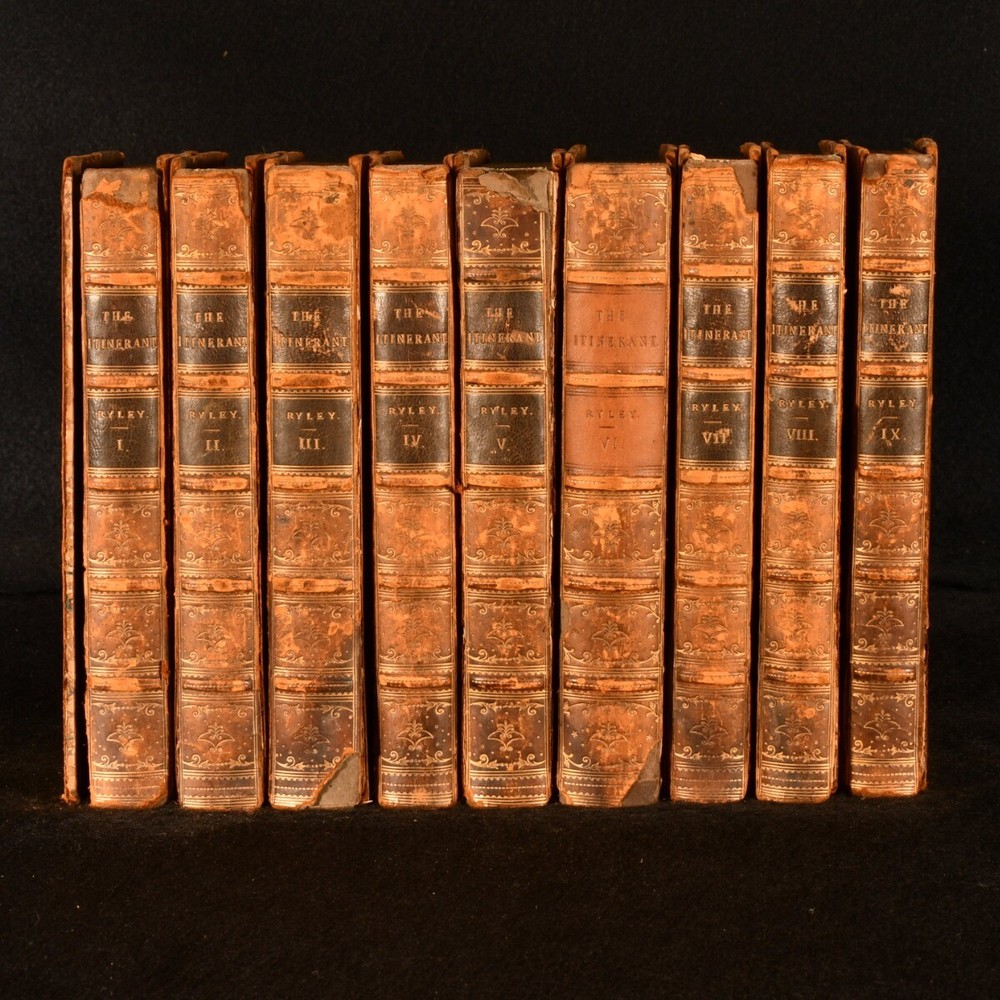 Click here to see our other books! The Itinerant, or Memoirs of an Actor & The Itinerant in Scotland Samuel William Ryley 1816-1827 Sherwood and Co. : London 7" by 4" 323, [1]; [4], 320; [4], 380; [6], 162; [4], 371; [6], 446; [8], iv, 336; [2], 322; [2], 322pp. SUMMARY An exceptionally scarce complete set of the fictional memoirs of English actor Samuel William Ryley, the author's presentation copy, signed to Volume VII. Author's Presentation Copy,Early Edition,First Edition,Leather Binding,Very Scarce Overall Condition: Good Only This book weighs 5 KG when packed UK Postage: £ 4.49 US Postage: £ 42.99 EU Postage : £ 27.99 European Postage: £ 45.99 Asia Postage: £ 74.99 Worldwide Postage: £ 129.99 DESCRIPTION Bound in half calf with marbled paper-covered boards. Complete in nine volumes. The author's presentation copy, inscribed 'With the best wishes of the author. Sam - Will - Ryley' dated Aug 6th 1830. Written by English actor and author, Samuel William Ryley, who spent a large amount of his life performing with various acting companies all over Britain. Ryley lived an exciting and varied life, spending time as a 'wandering' actor with his own act, before moving up to Scotland with the Stephen Kemble company. In this work, Samuel William Ryley presents a fictional autobiography, a wild and and fantastic tale in the style of 'Tristram Shandy'. Ryley purports the work to be in some respects autobiographical. This collection is comprised of the following: The first series of 'The Itinerant, or Memoirs of an Actor', the second edition published in 1817, complete in three volumes. The first edition of this first series was published in 1808. The second series of 'The Itinerant, or Memoirs of an Actor', the first edition published in 1816-7, complete in three volumes. With a frontispiece of the author in his later years. The third series, entitled 'The Itinerant, in Scotland', the first edition, published in 1827. This series in particular is very scarce to see. With the bookplate of James Lovatt. CONDITION Uniformly bound in half calf with marbled boards. Externally, worn. Both boards detached to volume I, II and VI. Front board detached to volume III, V, VII and VIII, with front endpaper also detached to VIII. Boards tenderly held, joints cracked and boards may detach with further handling to volume IV, V, VII, VIII and IX. Rubbing to boards and leather. Slight loss to the spines to most volume, with the occasional backstrip lifting. Lacking spine label to VI. Bookplate to the front paste down. Internally, generally firmly bound. Pages are generally bright, with handling marks. Tide mark to most volumes, heavier to the lower half of pages to volume II, VIII and IX. Author's ink inscription to the half title of VII. Overall Condition: Good Only GLOSSARY OF TERMS Overall Condition (Dustwrapper condition rating is shown after that for the book itself, where a dustwrapper is present) Fine - Very well preserved copy showing very little wear Very Good Indeed - Only one or two minor faults, really a very attractive copy Very Good - Quite a wide term meaning no major faults but probably several smaller ones often expected given the age of the book, but still a respectable copy Good - Meaning not very good. Some more serious faults as will be described in the condition report under 'condition' Good Only - Meaning one or more faults that could really do with repair Fair - As with good only above but with other faults leaving a compromised copy even after repair Poor - Really bad and possibly seriously incomplete. We only sell books in this condition where their rarity or value makes them attractive none the less. Major defects will be described. GUARANTEE We offer a full money back guarantee on our descriptions. Please ask for details and conditions. We prefer PAYPAL. If you pay via PAYPAL we will post the item off the same or the next working day with the postage you have selected. Please note we cannot accept USD cheques