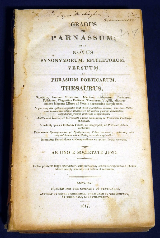 This is for a Antique Book in the Classic Latin language: Gradus ad Parnassum sive Novus Synonymorum, Epithetorum, Versuum, ac Phrasium Poeticarum Thesaurus - Ab Uno e Societate Jesu. Leather bound Hardcover Book, printed for the Company of Stationers, dated 1817 on title page. Approximately 8 in. by 4-7/8 in., 596 pages. Book has wear, some stains, writing on loose blank page in front and some on title page, binding is weakened, covers are loose, blank page (with writing) in front is loose, spine has damage, etc., see also pictures. Not too bad for an over 200 year old book. Buyer to pay $5.00 for shipping and handling for U.S. address. We ship worldwide. International costs to be determined. Please click on 'See Details' for quote. We combine shipping if possible. Please take the time to read the following: Payment should be received within 3 days of purchase. We only ship to the address shown on the paypal payment. Because we are selling fresh items from estates, barns, etc., expect signs of wear and usage appropriate with the age of such items. We usually take multiple photographs of an item. Please check for a second row of photos, they often are there but can be overlooked. Photographs are part of the description and show all that is included. We photograph and accurately describe every item as to its condition and authenticity to the best of our ability. If you have any questions, please let us know. We often have similar items available, so please see our Other Items , or go to our 'ewkauctions' ebay store .