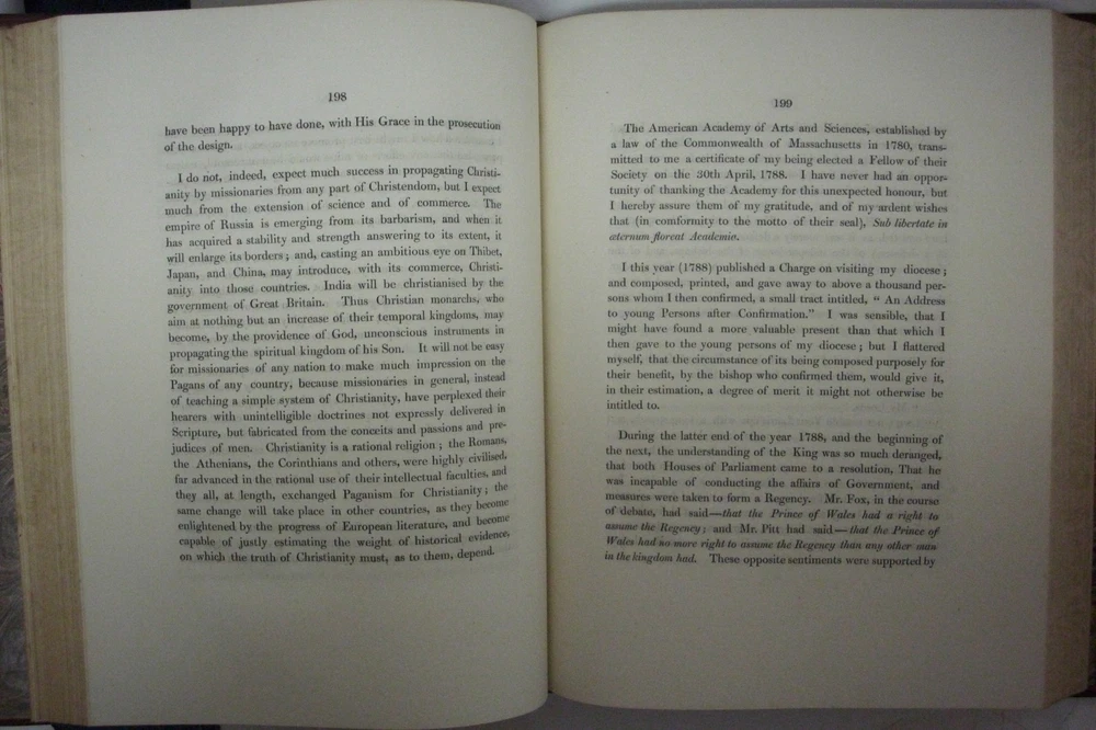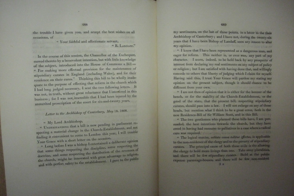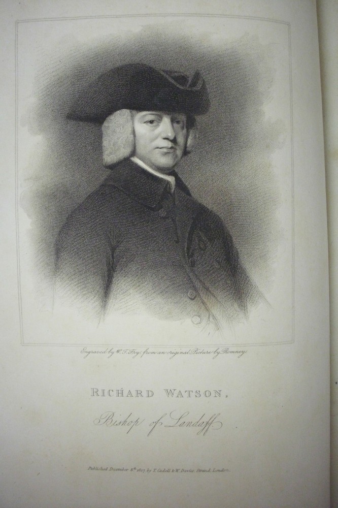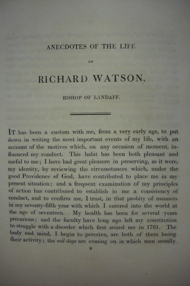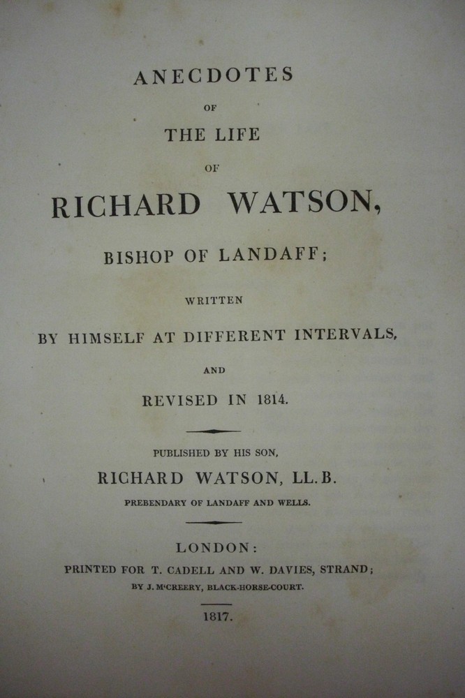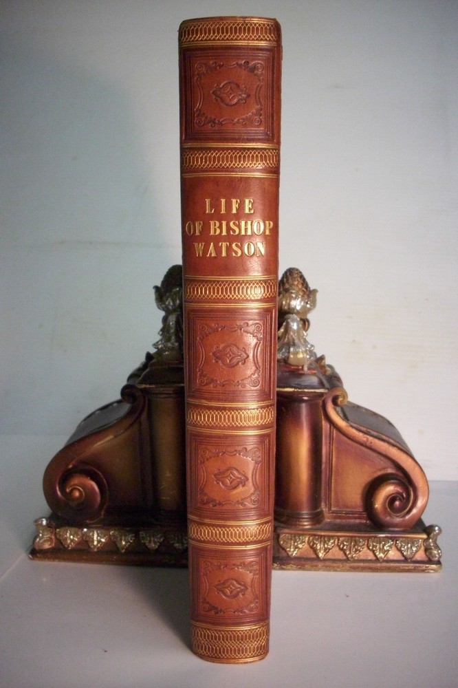 You are bidding on an antique hardcover book titled Anecdotes of the Life of Richard Watson, Bishop of Landaff; written by himself at different intervals and revised in 1814. Published by his son, Richard Watson, LL. B., Prebendary of Landaff and Wells. Book was printed in London for T. Cadell and W. Davies, 1817. This is the First Edition. The Right Reverand Richard Watson (1737-1816) was Bishop of Landaff from 1782 to 1816. He was the great-great-great-grandfather to Reverand David Watson (1933-1984), a renowned British evangelical clergyman. This is a large size book measuring approximately 11" tall and 9" wide. Book is quarter-bound in brown leather with leather tips. The spine is beautiful! It has gold lettering with gold ornamentation with blind-stamped designs. All covers are firmly attached with no cracking of or splitting of hinges, either inside or outside. The covers have some sun-fading. All pages are very clean and tightly bound with very little foxing. The outside edges of pages have attractive swirling design on all three edges. The book a tasteful bookplate of previous owner, George Pim. This book is in very good-plus condition. The book is almost 200 years old and quite rare and collectible. Would make a super addition to a collection. Great gift idea! (Inventory: 502) Track Page Views With Auctiva's FREE Counter