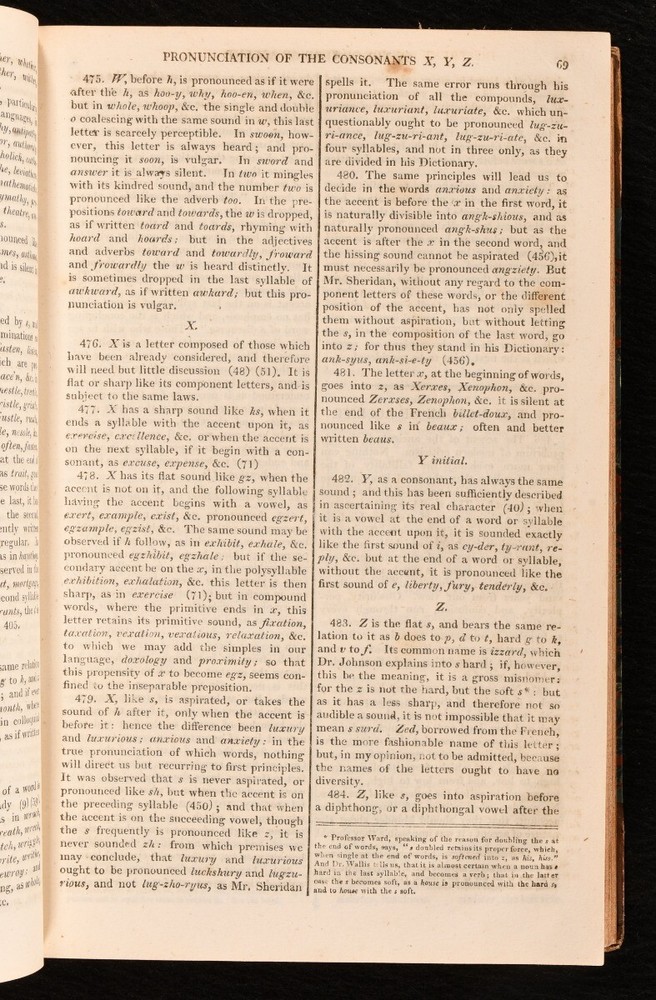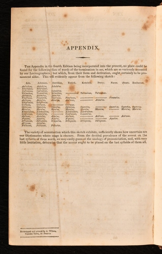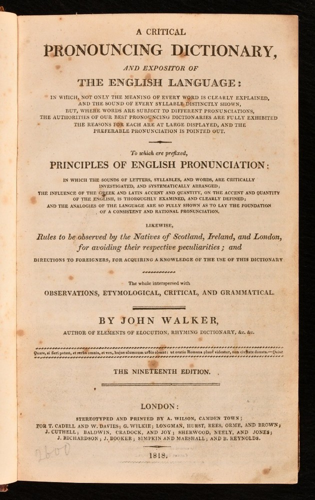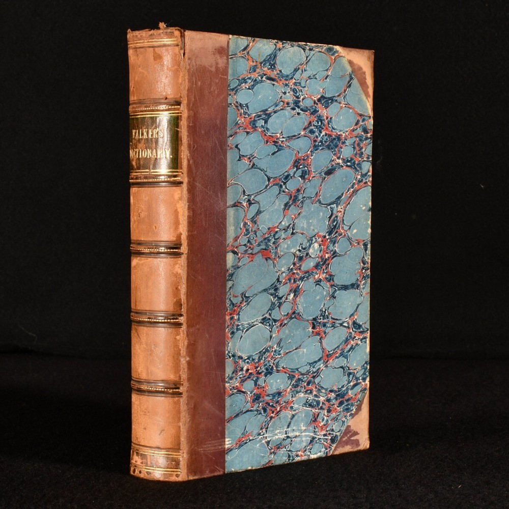 Click here to see our other books! A Critical Pronouncing Dictionary and Expositor of the English Language: In which, not only the Meaning of every Word is clearly explained, and the Sound of every Syllable distinctly shown, but, where Words are subject to different Pronunciations, the Authorities of our best Pronouncing Dictionaries are fully Exhibited the Reason for each are largely displayed, and the Preferable Pronunciation is pointed out. To which are prefixed, Principles of English Pronunciation: in which the Sound of Letters, Syllables, and Words, are critically investigated, and systematically arranged; the Influence of the Greek and Latin Accent and Quantity, on the Accent and Quantity of thee English, is thoroughly examined, and clearly defined; and the Analogies of the Language are so fully shown as to lay the Foundation of a Consistent and Rational Pronunciation. Likewise, Rules to be observed by the Natives of Scotland, Ireland, and London, for avoiding their respective peculiarities; and Directions to Foreigners, for acquiring a Knowledge of the Use of this Dictionary John Walker 1818 Printed by A. Wilson for T. Cadell and W. Davies; G. Wilkie; et al. : London 8" by 5" 602p. SUMMARY An interesting dictionary to English pronunciation by John Walker, a later edition. Leather Binding,Rebound Overall Condition: Very Good This book weighs 0.75 KG when packed UK Postage: £ 3.99 US Postage: £ 19.99 EU Postage : £ 15.99 European Postage: £ 16.99 Asia Postage: £ 21.99 Worldwide Postage: £ 25.99 DESCRIPTION Nineteenth edition of this work. A dictionary of pronunciation of the English language, with useful tips on letters, syllables, and words and directions for foreigners. CONDITION Rebound in half calf over marbled boards, renewed endpapers. Externally generally smart with some shelf wear, rubbed to spine and extremities, some fading to back strip. W. Bowman's bookplate to front pastedown, most likely bookseller and stationer of Tunbridge Wells. Internally, firmly bound. Light spotting to first few leaves, otherwise pages generally bright and clean. Overall Condition: Very Good GLOSSARY OF TERMS Overall Condition (Dustwrapper condition rating is shown after that for the book itself, where a dustwrapper is present) Fine - Very well preserved copy showing very little wear Very Good Indeed - Only one or two minor faults, really a very attractive copy Very Good - Quite a wide term meaning no major faults but probably several smaller ones often expected given the age of the book, but still a respectable copy Good - Meaning not very good. Some more serious faults as will be described in the condition report under 'condition' Good Only - Meaning one or more faults that could really do with repair Fair - As with good only above but with other faults leaving a compromised copy even after repair Poor - Really bad and possibly seriously incomplete. We only sell books in this condition where their rarity or value makes them attractive none the less. Major defects will be described. GUARANTEE We offer a full money back guarantee on our descriptions. Please ask for details and conditions. We prefer PAYPAL. If you pay via PAYPAL we will post the item off the same or the next working day with the postage you have selected. Please note we cannot accept USD cheques