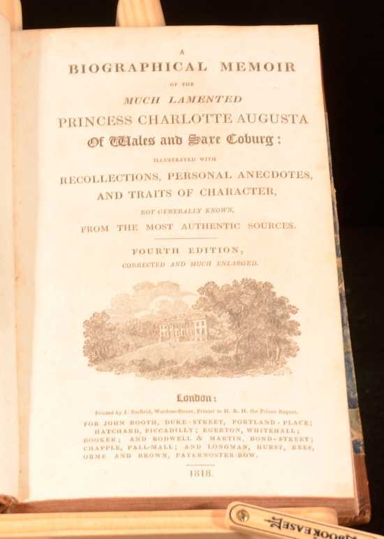Click here to see our other books! A Biographical Memoir of the Much Lamented Princess Charlotte Augusta of Wales and Saxe Coburg Illustrated with Recollections, Personal Anecdotes, and Traits of Character, Not Generally Known, from the Most Authentic Sources Anonymous 1818 John Booth et al : London 8.5" by 5.5" [x], 388, [4]pp. SUMMARY A biography of the daughter of George IV, who died at the age of 21. Illustrated,Leather Binding,Rebound Overall Condition: Very Good This book weighs 1 KG when packed UK Postage: £ 3.99 US Postage: £ 22.99 EU Postage : £ 16.99 European Postage: £ 17.99 Asia Postage: £ 22.99 Worldwide Postage: £ 28.99 DESCRIPTION A biography of the daughter of George IV, who died at the age of 21. Fourth edition. Illustrated with an engraved frontispiece, a vignette title page, one folding scene and a folding facsimile. Bookplate of Thomas Hatman Brenchley to front pastedown. CONDITION In a half-calf binding with marbled boards. Externally, smart, though with some rubbing and slight wear to the extremities. Joints are starting. Internally, firmly bound. Private ex-libris blindstamp to front free-endpaper. Pages are quite bright, though with some light background foxing and some offsetting. Overall Condition: Very Good GLOSSARY OF TERMS Overall Condition (Dustwrapper condition rating is shown after that for the book itself, where a dustwrapper is present) Fine - Very well preserved copy showing very little wear Very Good Indeed - Only one or two minor faults, really a very attractive copy Very Good - Quite a wide term meaning no major faults but probably several smaller ones often expected given the age of the book, but still a respectable copy Good - Meaning not very good. Some more serious faults as will be described in the condition report under 'condition' Good Only - Meaning one or more faults that could really do with repair Fair - As with good only above but with other faults leaving a compromised copy even after repair Poor - Really bad and possibly seriously incomplete. We only sell books in this condition where their rarity or value makes them attractive none the less. Major defects will be described. GUARANTEE We offer a full money back guarantee on our descriptions. Please ask for details and conditions. We prefer PAYPAL. If you pay via PAYPAL we will post the item off the same or the next working day with the postage you have selected. Please note we cannot accept USD cheques