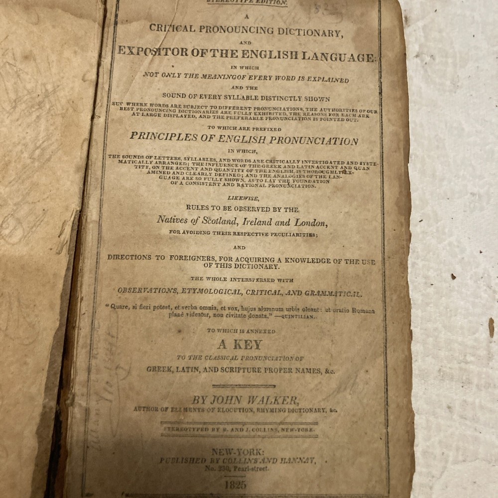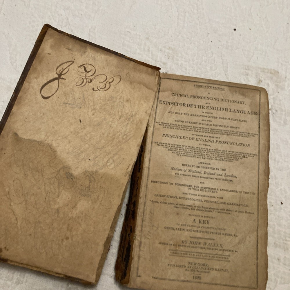 The product is an original 1818 English language book titled "A CRITICAL PRONOUNCING DICTIONARY" by John Walker. It is a reference book published by Benjamin Warner in Philadelphia, United States. The book is leather-bound and personalized, with a focus on school books.POOR CONDITION