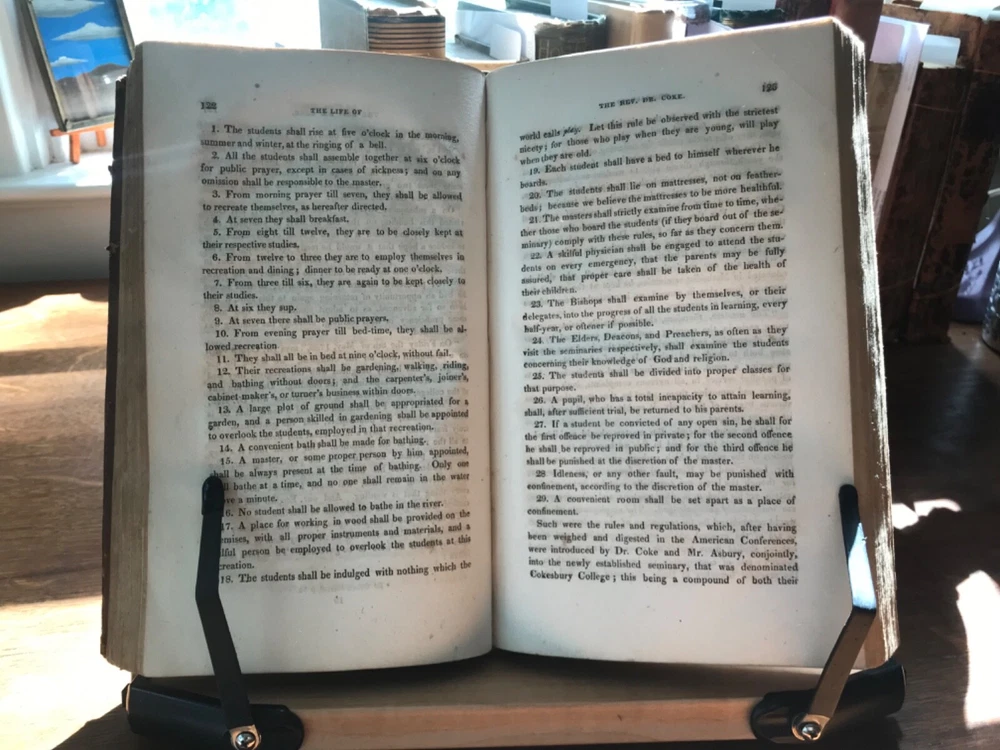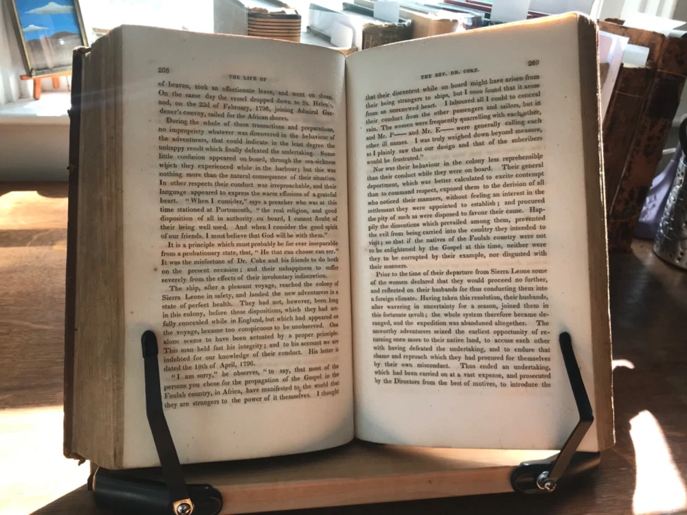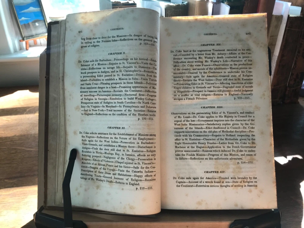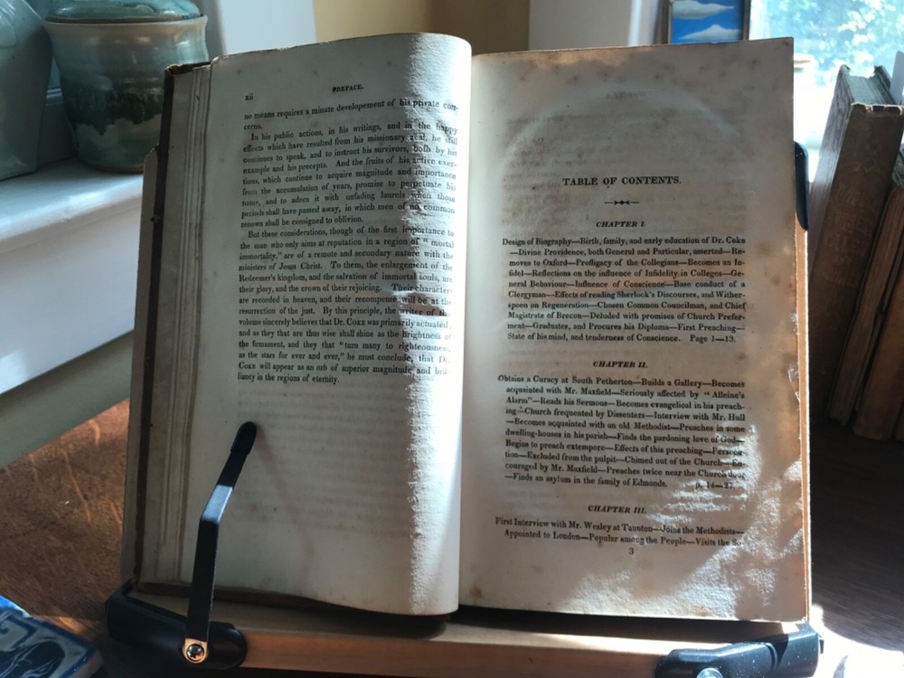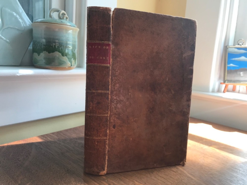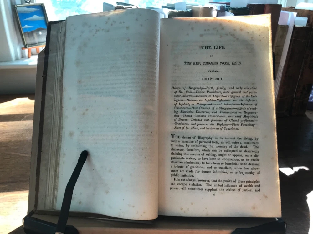 The Life of The Rev. Thomas Coke, LL.D. Including in Detail His Various Travels and Extraordinary Missionary Exertions, in England, Ireland, America and the West-Indies: With An Account of his Death, on the 3rd of Mary, 1814, While on a Missionary Voyage to the Island of Ceylon, in the East-Indies. Interspersed with Numerous Reflections; and Concluding with An Abstract of His Writings and Character, by Samuel Drew, Published by J. Soule and T. Mason, New York, A. Paul, Printer, 1818, frontis portrait of Coke, 391 pp, full leather, 9 x 5.5”, 8vo. In good condition. Light wear to extremities with minor scuffing to surface. Light peeling along edges with light abrasions to surface of leather. Corners bumped with small loss at bottom right corner of front board. Joints lightly cracked with scuffing. Spine abraded with light creasing. Original spine label intact and bright. Slight loss at head of spine. Inner hinge tender, but intact. Foxing to inner hinges and end papers. Offsetting from frontis to title. Old hand ownership dated 1829 on second fly leaf. Text is lightly age-toned with scattered foxing, heavy at times. Free of known markings or ownership. Binding remains intact. Please see photos. Thomas Coke (1747-1814) was associate of John Wesley, and participated in the founding of the Methodist Episcopal Church in America. Chapters of the book include events in America, attitudes on slavery etc. COLR1818CFGN
