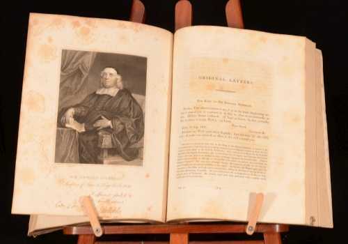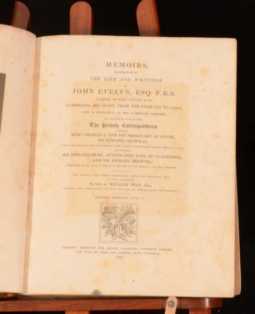 Click here to see our other books! Memoirs of John Evelyn John Evelyn, William Bray (Ed) 1819 Henry Colburn : London 11.5" by 9.5" [6], xxviii, 671; [4], v, [4], 336pp. SUMMARY A detailed edition of the life and memoirs of diarist John Evelyn. Early Edition,Leather Binding Overall Condition: Fair This book weighs 2 KG when packed UK Postage: £ 3.99 US Postage: £ 29.99 EU Postage : £ 21.99 European Postage: £ 23.99 Asia Postage: £ 37.99 Worldwide Postage: £ 38.99 DESCRIPTION Second edition. 'Comprising his diary, from the year 1641 to 1705-6, and a selection of his familiar letters. To which is subjoined, the private correspondence between King Charles I and his secretary of state, Sir Edward Nicholas, whilst His Majesty was in Scotland, 1641, and at other times during the Civil War; also between Sir Edward Hyde, afterwards Earl of Clarendon, and Sir Richard Browne, ambassador to the court of France, in the time of King Charles I and the usurpation'. With a frontispiece to both volumes, one portrait of John Evelyn and one of his wife Mary, and ten further plates collated complete. Including a double page spread pedigree chart of the Evelyn family, two engravings showing interior and exterior of 'Wotton Church, Surry', engraving depicting a view of the burial place of the Evelyn family, double page spread engraving of Wotton in Surry, the seat of John Evelyn, an engraved portrait of Meliora Retinete, double page spread map of Deptford, 1623 from an original pen and ink sketch by John Evelyn, a sketch of John Evelyn's house, portrait of Sir Edward Nicholas, secretary of King Charles I and II, and a portrait of Sir Richard Browne, ambassador for King Charles I and II to the court of France. John Evelyn was an English writer, gardener and diarist. Evelyn's diaries or Memoirs are largely contemporaneous with those of the other noted diarist of the time, Samuel Pepys, and cast considerable light on the art, culture and politics of the time (he witnessed the deaths of Charles I and Oliver Cromwell, the last Great Plague of London, and the Great Fire of London in 1666). Complete in two volumes. CONDITION In half calf binding with marbled boards. Externally, a trifle rubbed and wear to extremities and the spines. Three boards are detached and the other is held by the cords only. Internally, both volumes are firmly bound and bright, with instances of light foxing. Some ink marks and off-setting to the title pages. Overall Condition: Fair GLOSSARY OF TERMS Overall Condition (Dustwrapper condition rating is shown after that for the book itself, where a dustwrapper is present) Fine - Very well preserved copy showing very little wear Very Good Indeed - Only one or two minor faults, really a very attractive copy Very Good - Quite a wide term meaning no major faults but probably several smaller ones often expected given the age of the book, but still a respectable copy Good - Meaning not very good. Some more serious faults as will be described in the condition report under 'condition' Good Only - Meaning one or more faults that could really do with repair Fair - As with good only above but with other faults leaving a compromised copy even after repair Poor - Really bad and possibly seriously incomplete. We only sell books in this condition where their rarity or value makes them attractive none the less. Major defects will be described. GUARANTEE We offer a full money back guarantee on our descriptions. Please ask for details and conditions. We prefer PAYPAL. If you pay via PAYPAL we will post the item off the same or the next working day with the postage you have selected. Please note we cannot accept USD cheques