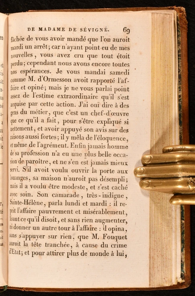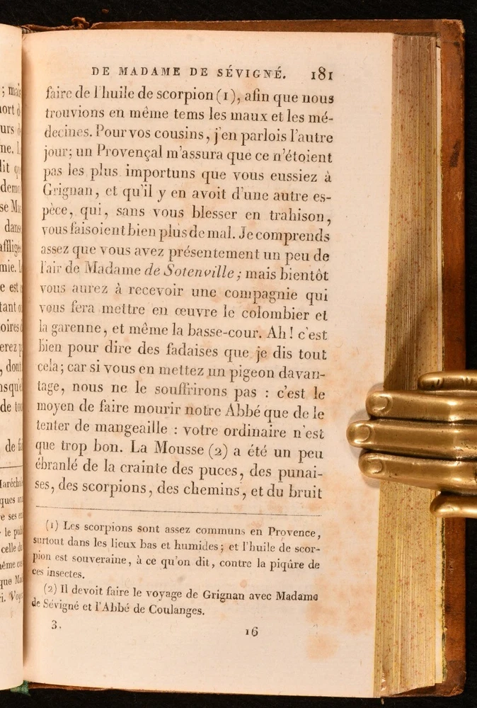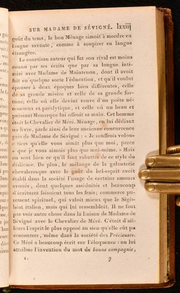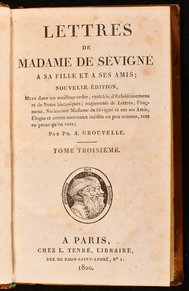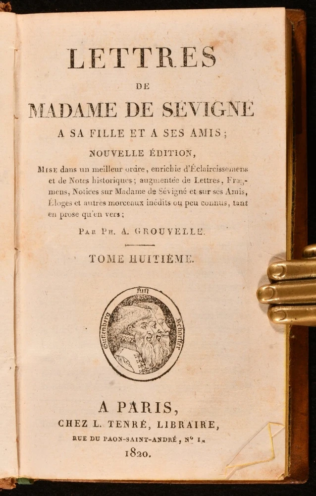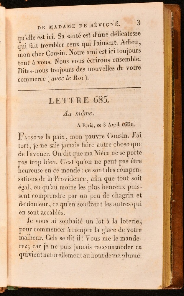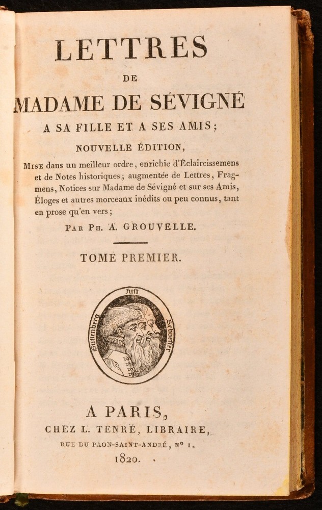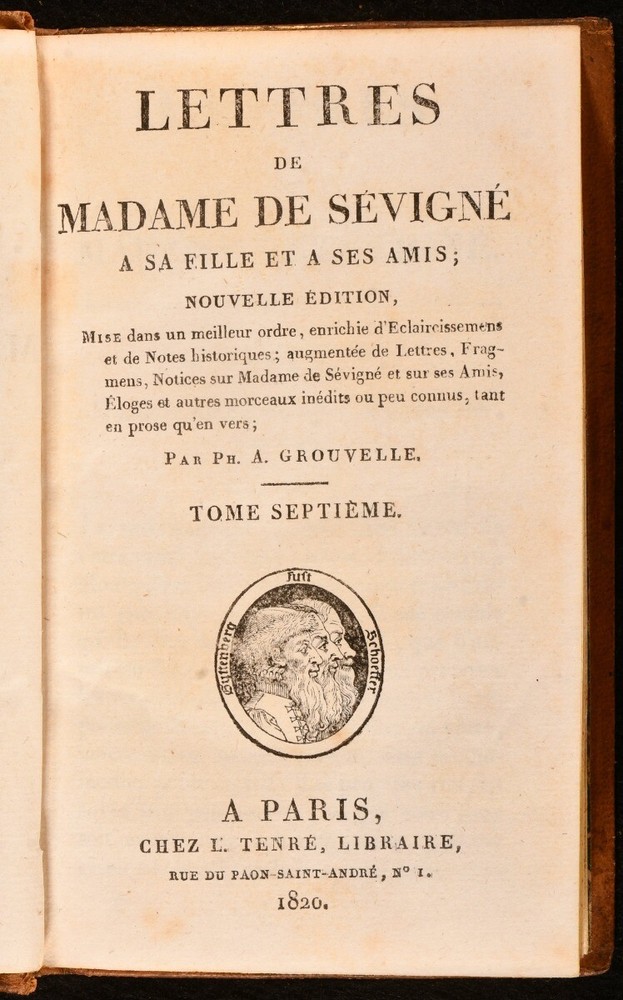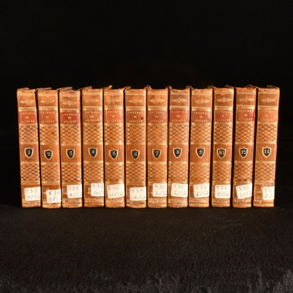 Click here to see our other books! Lettres de Madame de Sevigne a Sa Fille et A Ses Amis Madame de Sevigne [Marie de Rabutin-Chantal]; A. Grouvelle [ed.] 1820 L. Tenre : Paris 6" by 4" ccxx [1], 2-216; 432; 433; 438; 436; 437; 439; 438; 437; 434; 427; 316pp SUMMARY A delightful twelve volume set of the letters of the seventeenth century literary figure Marie de Rabutin-Chantal, Madame de Sevigne. Leather Binding Overall Condition: Very Good This book weighs 3 KG when packed UK Postage: £ 3.99 US Postage: £ 36.99 EU Postage : £ 25.99 European Postage: £ 27.99 Asia Postage: £ 47.99 Worldwide Postage: £ 69.99 DESCRIPTION In the original French. A twelve volume set of the letters of Madame de Sevigne, a French aristocrat whose prolific letter writing has provided a valuable insight into seventeenth century France. Madame de Sevigne's letters are heralded for their wit, vividness and her musings on key events in France during her lifetime. Addressed to her daughter, the letters often commented on scandalous events in the French court. This twelve volume set is lacking the two portraits that should appear in volume I, and the title page to volume XII. With half titles to each volume. Volume XII contains 'Reflexions sur les lettres de Madame de Sevigne' and the letters ofMadame de Simiane, by Simon Jerome Bourlet de Vauxcelles. Madame de Simiane was the daughter of Madame de Sevigne, and her chief correspondent. With the bookplate of the Guille-Alles library to the front board of each volume, and handwritten labels taped to the tail of each spine. Further bookplates to each front pastedown. CONDITION In full tree calf bindings, with gilt detailing to spines. Light rubbing to back strip heads and tails. Library labels to the tail of each spine, and to each front boards. Light rubbing to joints. Bookplates to front pastedowns. Internally, firmly bound. Pages lightly age toned, with instances of spotting and some foxing. Overall Condition: Very Good GLOSSARY OF TERMS Overall Condition (Dustwrapper condition rating is shown after that for the book itself, where a dustwrapper is present) Fine - Very well preserved copy showing very little wear Very Good Indeed - Only one or two minor faults, really a very attractive copy Very Good - Quite a wide term meaning no major faults but probably several smaller ones often expected given the age of the book, but still a respectable copy Good - Meaning not very good. Some more serious faults as will be described in the condition report under 'condition' Good Only - Meaning one or more faults that could really do with repair Fair - As with good only above but with other faults leaving a compromised copy even after repair Poor - Really bad and possibly seriously incomplete. We only sell books in this condition where their rarity or value makes them attractive none the less. Major defects will be described. GUARANTEE We offer a full money back guarantee on our descriptions. Please ask for details and conditions. We prefer PAYPAL. If you pay via PAYPAL we will post the item off the same or the next working day with the postage you have selected. Please note we cannot accept USD cheques