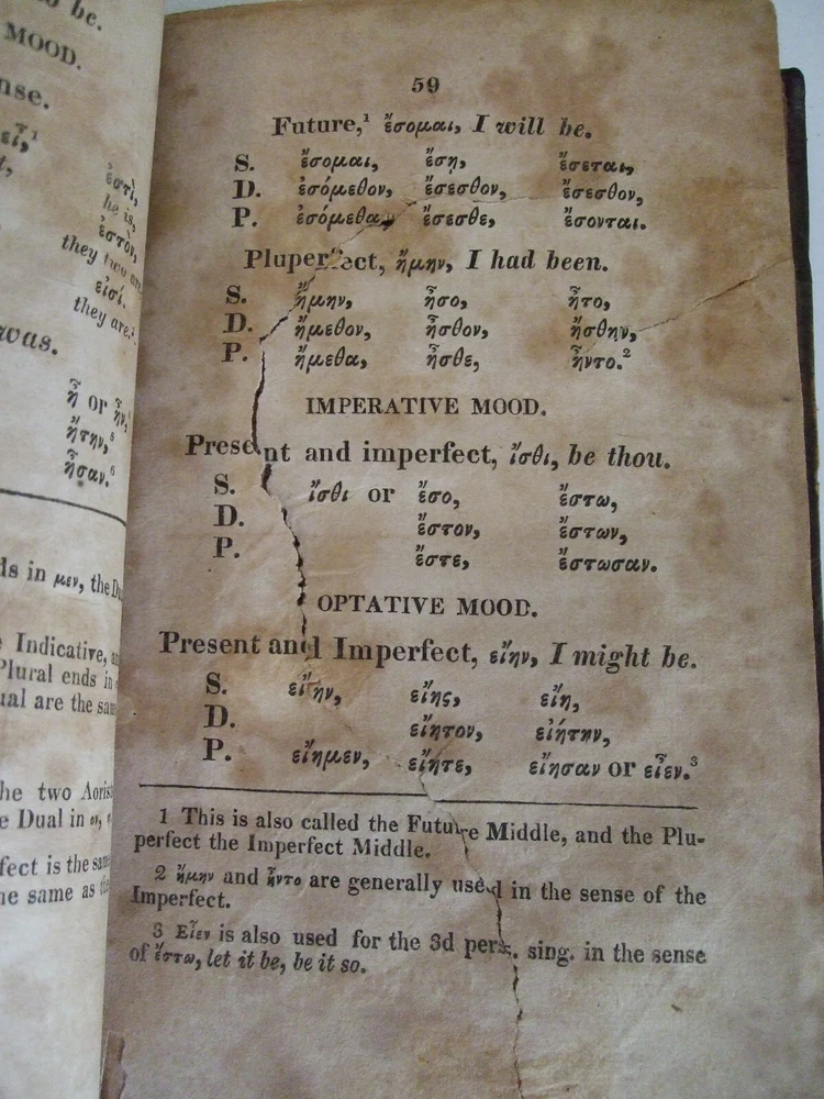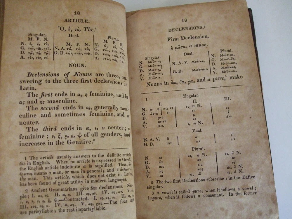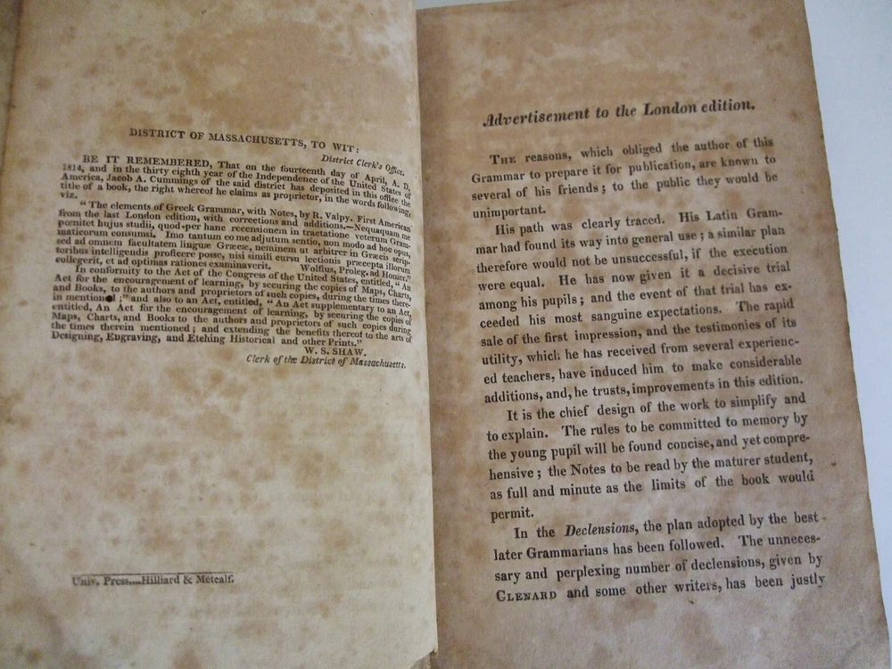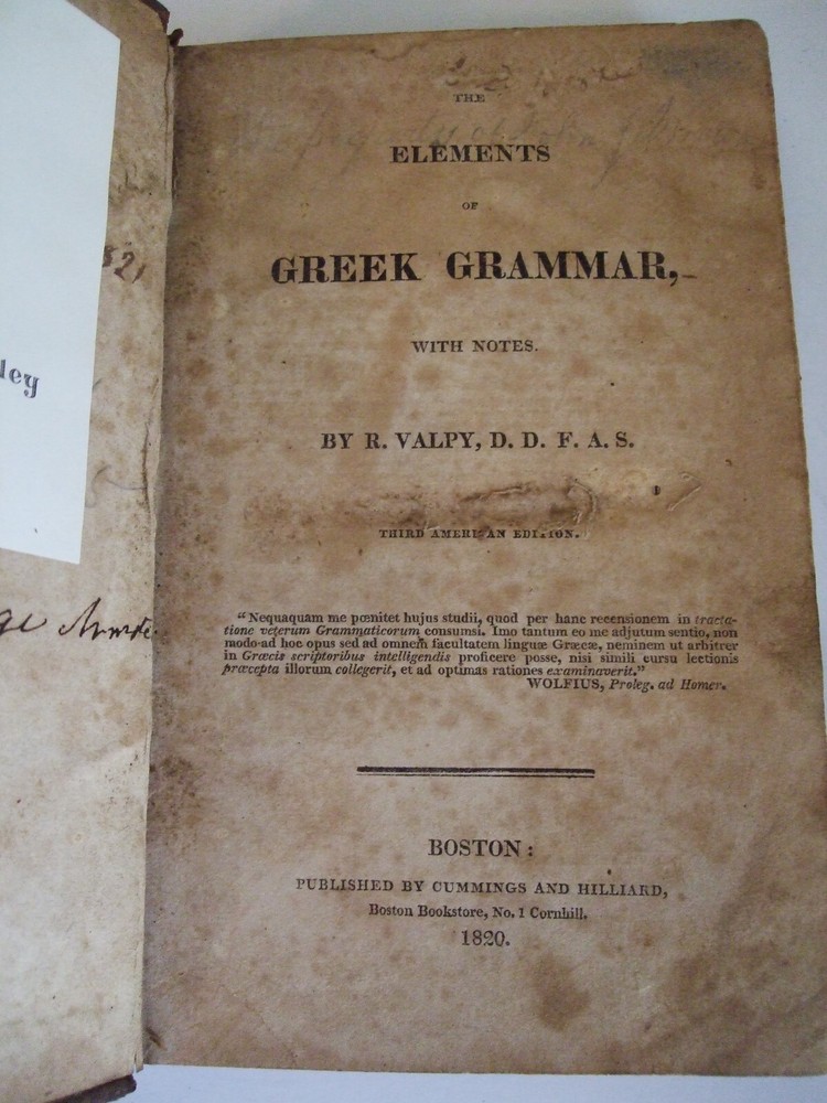 The Elements of Greek Grammar, with Notes Valpy, R. Boston, MA: Cummings and Hilliard, 1820. Leather, no dust jacket, 271 pages. 12mo: 7'' x 4 1/2'' Good condition: Leather boards with some tooling on spine and surface of boards (embellishments). No visible title on spine. Previous owner's ex-libris plate on front paste down endpaper. Missing front free endpaper. Surface scraping on a portion of the title page. Some doodling on rear endpapers. Pages have age toning. Pg 60 torn and taped with some antique paper tape, page 88 has a tear without tape. Text is still readable on these pages. Page 77 has a tear on the bottom part of the text of the footnotes text is still legible. Scarce. Inventory number 10359 POSTAGE and PAYMENT OPTIONS If you want to insure parcel against damage, please request this option and I will adjust your invoice. If you want to upgrade shipping for expedited delivery, just ask. Payment is due within 72 hours of winning the auction/Buy It Now Books are shipped within 3 business days. I have no control over delivery time once the package leaves my hands.