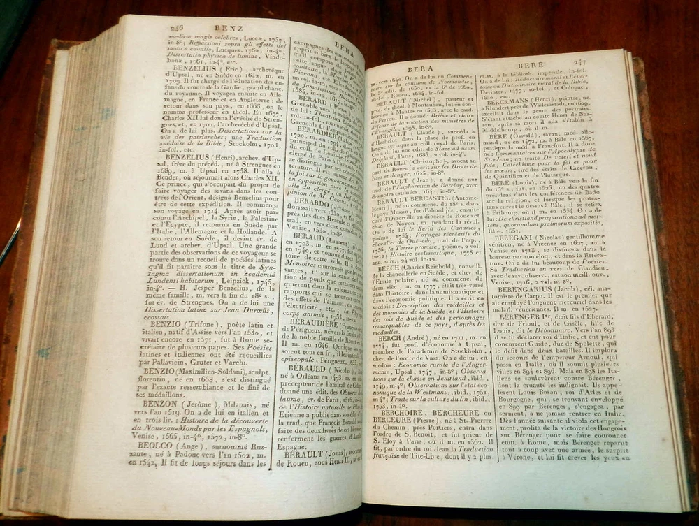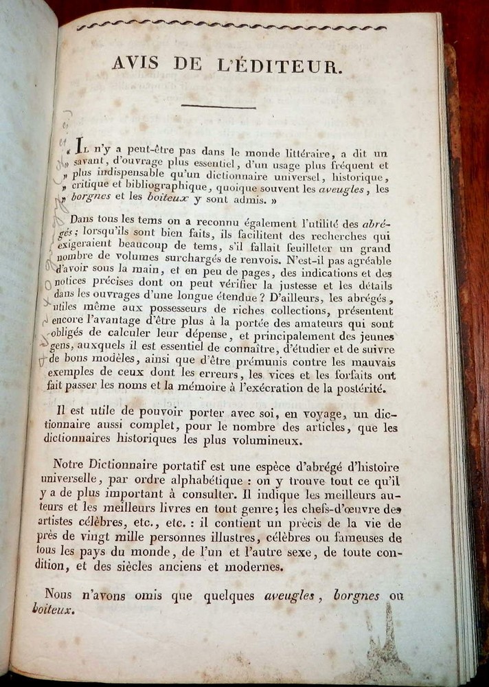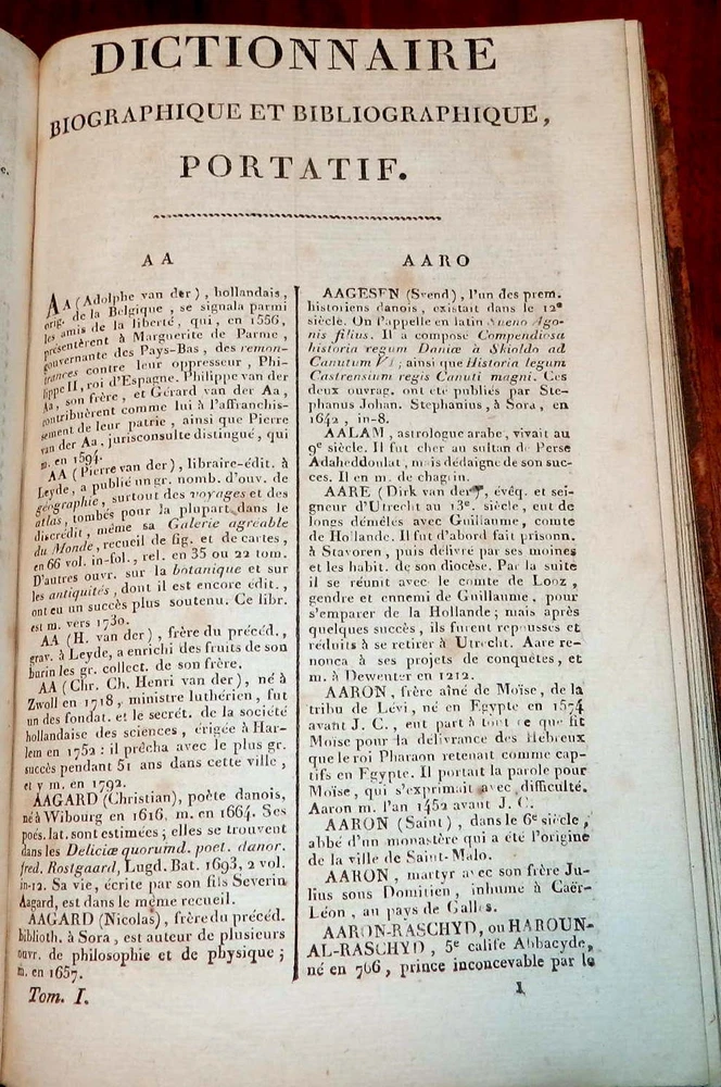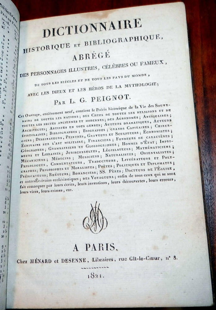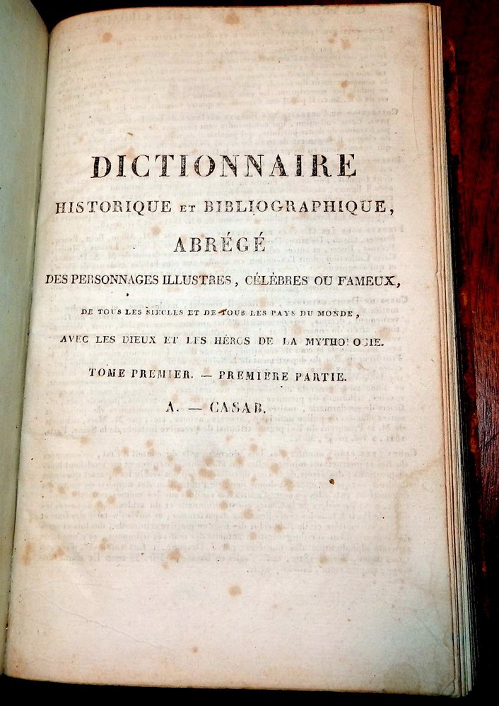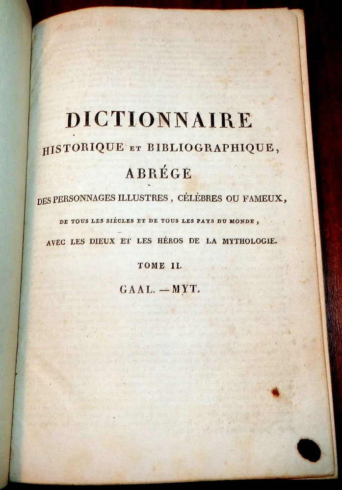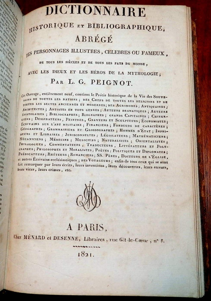 1821 Historic & Bibliographic Dictionary by Peignot 1stEd. In French 3V Leather 1821 Historic & Bibliographic Dictionary by Peignot 1stEd. In French 3V Leather 1 DICTIONNAIRE HISTORIQUE ET BIBLIOGRAPHIQUE ABRÉGÉ DES PERSONNES ILLUSTRES, CÉLÈBRES OU FAMEUX DE TOUS LES SIÈCLES ET DE TOUS LES PAYS DU MONDE, AVEC LES DIEUX ET LES HÉROS DE LA MYTHOLOGIE PAR L.G. PEIGNOT TOME I. - PREMIER PARTIE A – CASAB TOME I - DEUXIEME PARTIE: CANAL- FYT TOME II: GAAL -MYT PARIS, Haut-coeur & Gayet, 1821. First editions. Hardcovers. Contemporary full leather with gilt spine decorations and spine tabels (Tome 1 spine is repaired), octavos. Three volumes of a four volume set. Volume 1 (Tome 1 1ére partie): pages 1 to 529; includes: - avis de l’éditeur - table des abréviations - table des renvois du Tome 1er Volume 2 (Tome 1er 2 ème partie): pages 530 to 984. Volume 3 (Tome 2ème): pages 1 to 572; includes: - table des renvois des tomes 2 et 3 We do not have the 4th volume (i.e., Tome 3, NAAM - ZYPOE) of the Dictionnire. An abridged dictionary of universal history, in alphabetical order, showing the best authors and the best books, the masterpieces of famous artists. It contains a summary of the lives of many thousands illustrious and famous people from all countries of the world, and from ancient and modern times. Étienne-Gabriel Peignot (15 May 1767 – 14 August 1849) was a 19th-century French bibliographer. Biography First a lawyer in Besançon, Gabriel Peignot was a librarian and inspector of several institutions. He was a member of the Académie celtique of Paris, and of several literary societies. Peignot was one of the most famous bibliographers of his time. Pierre Larousse in his edition of the 19th century encyclopedia states: Peignot was the most learned bibliographer of this century. His learning was immense. To in-depth science books, he joined informed criticism. [...] His bibliographic taste had become a passion of which old books were mainly the object. This spiritual, gay, hard-working, selfless scholar composed innumerable small writings, most printed in small numbers, and much sought by curious; they dealt with spiky or little known features. CONDITION: Good. Covers have edge and corners wear, the spine leather is rubbed and has some abrasions or small nicks. Volume 1 has a repaired spine. Spine labels are lacking in Volume 2 and the gilt decorations are rubbed off. Several spine joints are cracked but all boards are firmly attached. The Contents are complete and intact excepts for a few small spots or foxing on the preliminary pages.) Check our other auctions and store listings for additional unusual items Check our other auctions and store listings for additional unusual items Listing and template services provided by inkFrog
