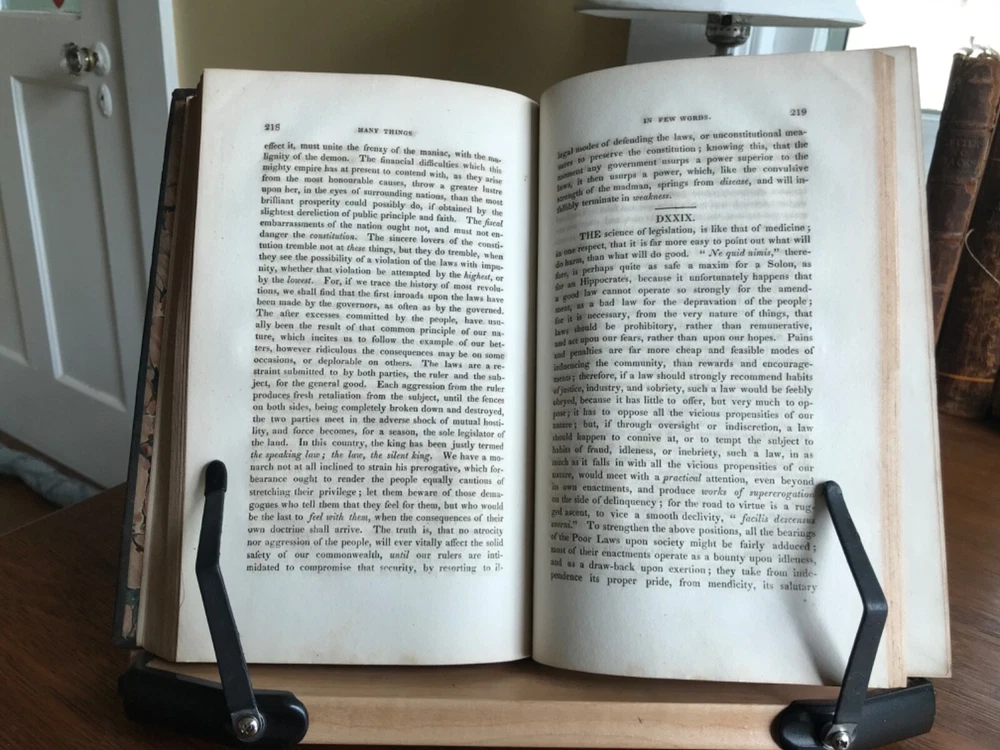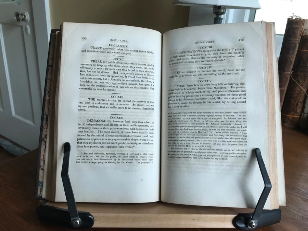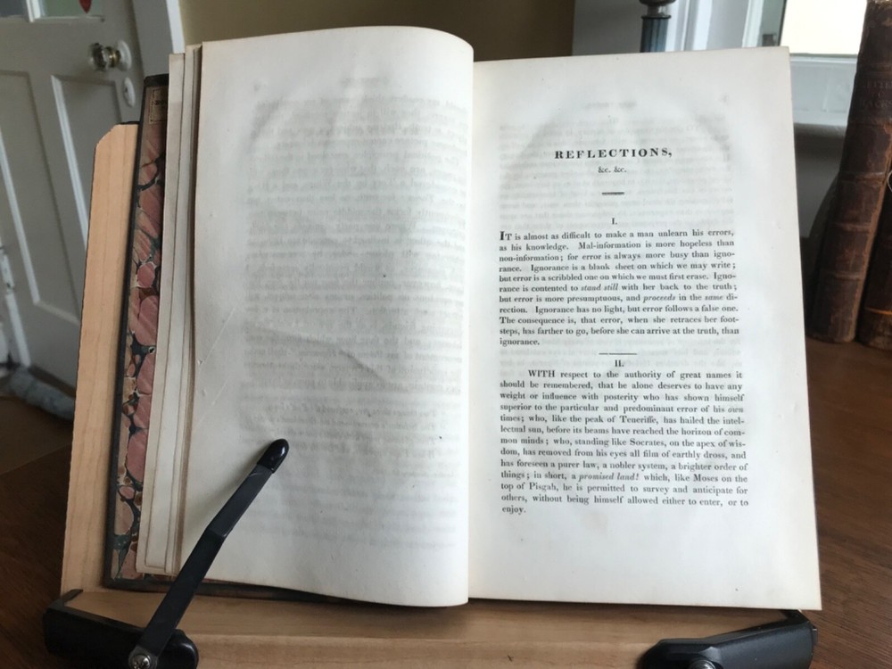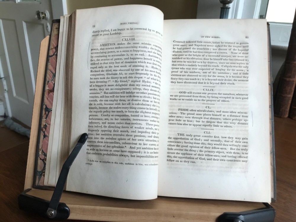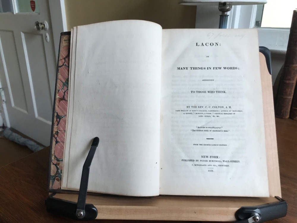 Lacon: Or Many Things in Few Words; Addressed to Those Who Think. By the Rev. C.C. Colton, A.M. From the Eighth London Edition, Published by Peter Burtsell, New York, 1821, 267 pp, full leather, 9 x 5.5”, 8vo. In fair condition. Moderate wear to extremists with dryness and rubbing to corners and edges. Front board fragile and nearly detached. Spine abraded and worn. Nicely bound overall with beautiful gilt tooling. J.D. Spalding’s Book Bindery sticker on front pastedown. Marbled end papers are lightly toned with fading at the edges. Light toning throughout with minor instances of foxing. Free of marginalia. Binding intact. Please see photos. Charles Caleb Colton (1777-1832) was an English cleric, writer and eccentric. Many editions of this popular work were reprinted. COLR1821ABER-FORN-TUB0004 02/24HK