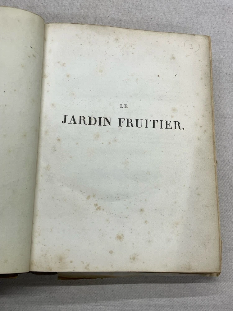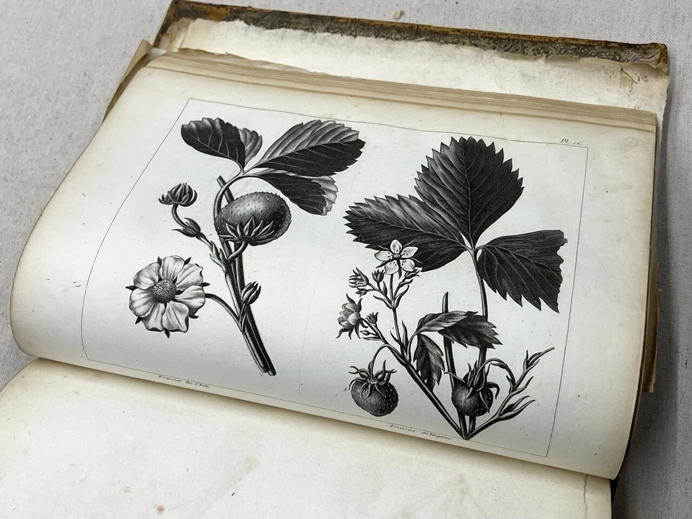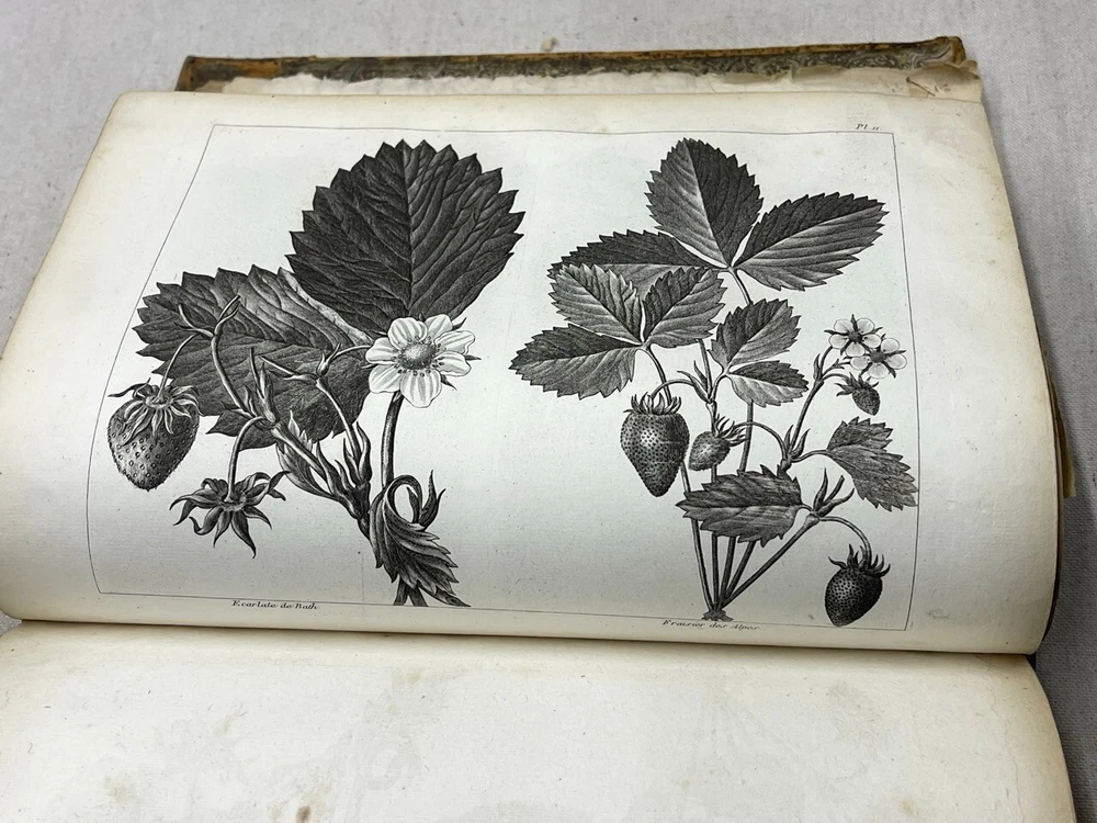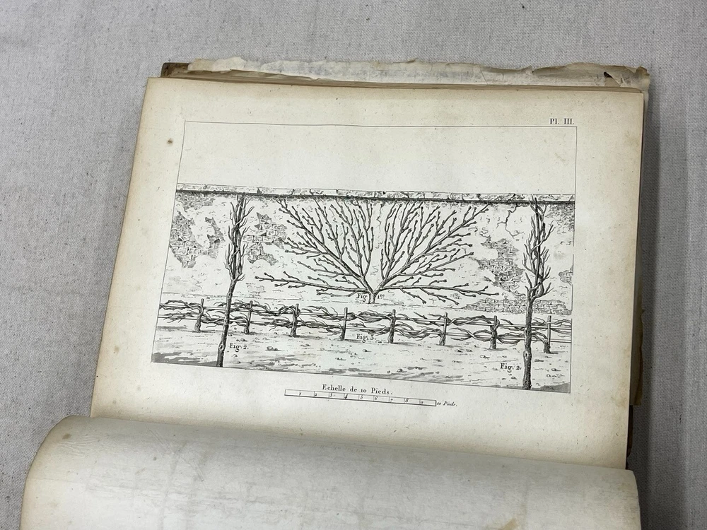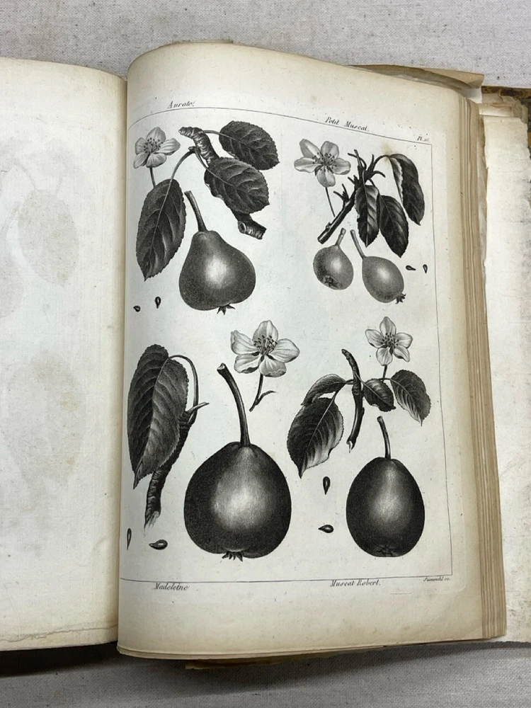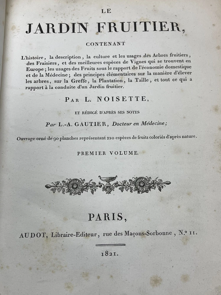 Antique 1821 Le Jardin Fruiter Leather-Bound Book - Botanical Engravings - Noisette This is a rare 1821 edition of Le Jardin Fruiter , authored by L. Noisette and edited by L.A. Gautier, a doctor of medicine. Published in Paris by Audot, this book is a comprehensive study on fruit trees, strawberries, and grapevines, detailing their cultivation, uses in domestic economy and medicine, grafting techniques, planting, and pruning methods. It includes 90 engraved plates illustrating 220 fruit species , making it a remarkable reference for historical horticultural practices. Condition Notes: Binding & Cover : Original leather binding with gold detailing. Shows significant wear, including scuffing, chipping, and fading along the spine and edges. The spine label is partially worn, with some loss of text. Interior Pages : Moderate foxing and age-related discoloration throughout. Some pages have edge wear, minor creases, and small tears, but the text and engravings remain legible. Engravings : Beautifully preserved botanical engravings depicting various fruits. Some pages have protective tissue paper still intact, particularly towards the back of the book. Marbled Endpapers : Retain their original decorative design but exhibit some staining and paper loss along the edges. A previous owner’s bookplate, marked Randall Davidson , is affixed inside the front cover. Page Edges : Uneven and rough-cut, with signs of age and handling wear. Additional Notes : This book was originally published in 1821 , making it over 200 years old and a valuable piece for collectors of antique botanical literature. This is a rare and stunning early 19th-century botanical reference book, perfect for collectors of antique horticultural books and botanical engravings. Measurements: Approx. 11.5" x 9" x 2" Good luck from Laurence & Sally of Baggage Battles and Storage Wars; currently roundthebend.tv