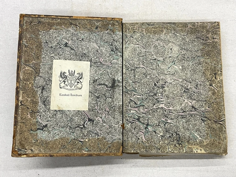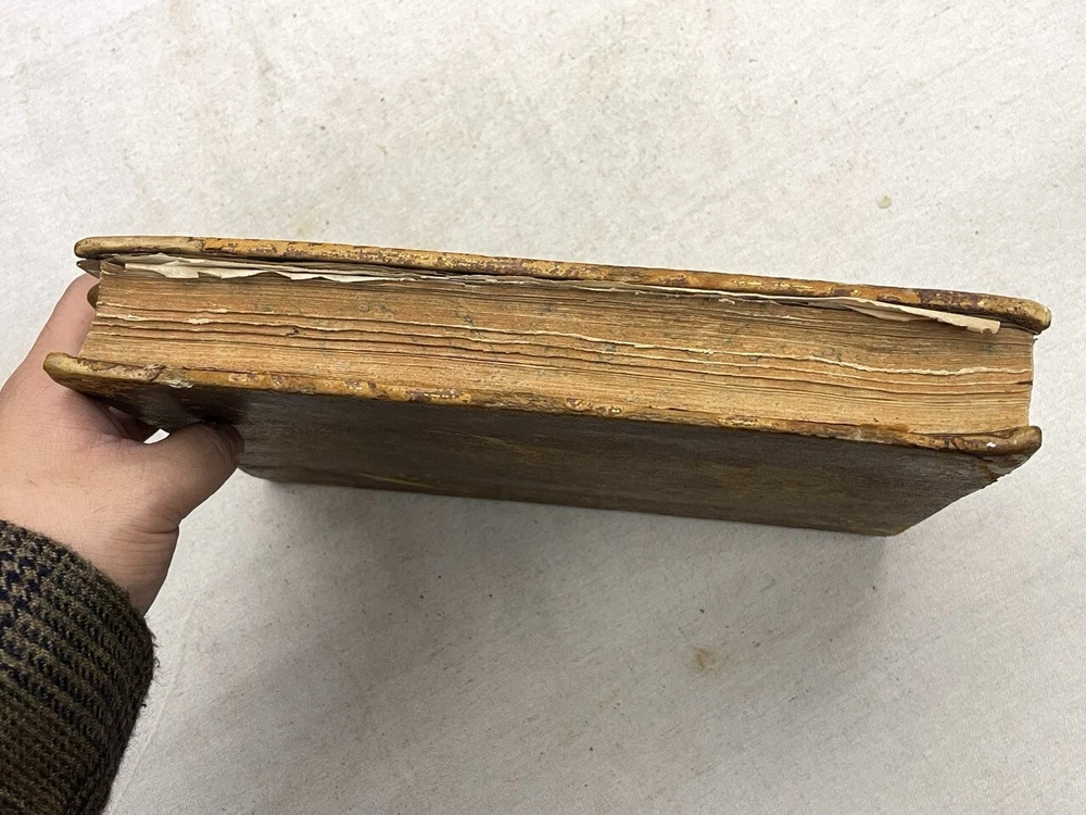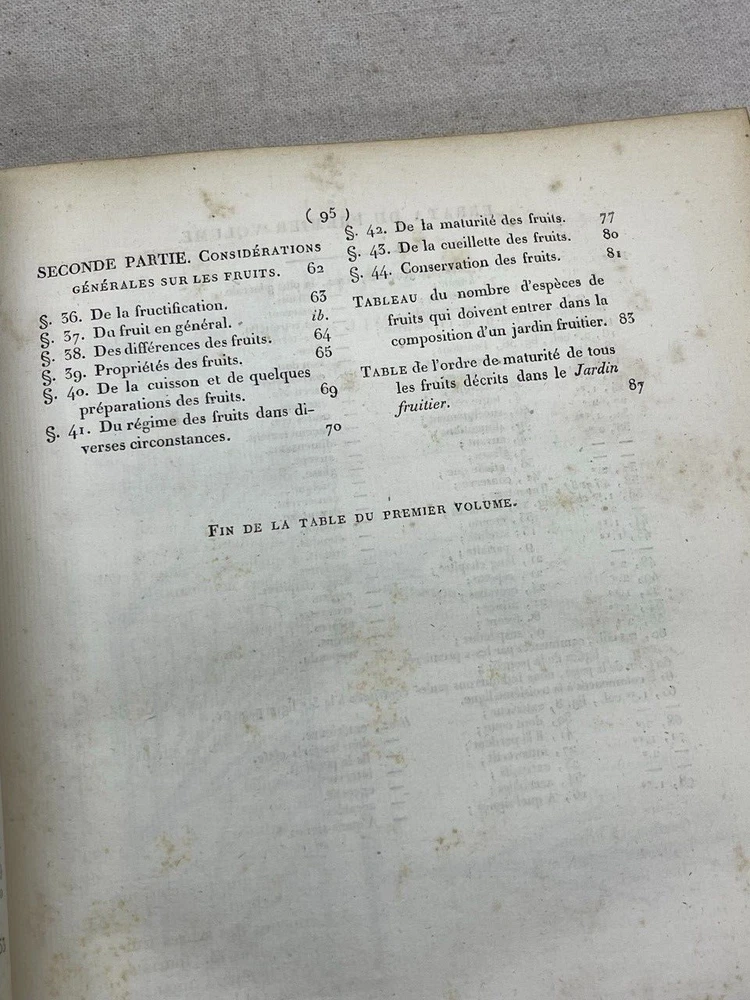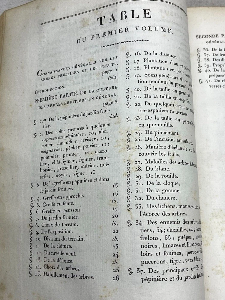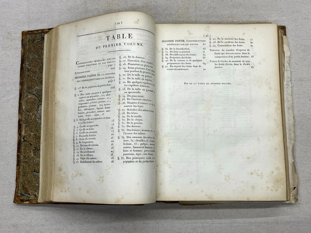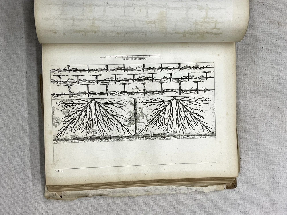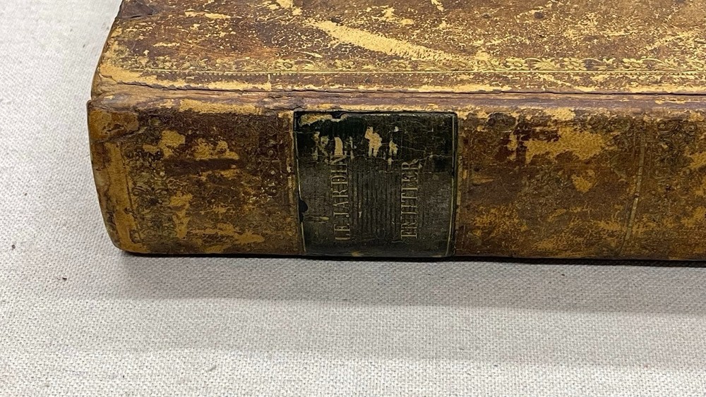 Antique 1821 Le Jardin Fruiter Leather-Bound Book - Botanical Engravings - Noisette This is a rare 1821 edition of Le Jardin Fruiter , authored by L. Noisette and edited by L.A. Gautier, a doctor of medicine. Published in Paris by Audot, this book is a comprehensive study on fruit trees, strawberries, and grapevines, detailing their cultivation, uses in domestic economy and medicine, grafting techniques, planting, and pruning methods. It includes 90 engraved plates illustrating 220 fruit species , making it a remarkable reference for historical horticultural practices. Condition Notes: Binding & Cover : Original leather binding with gold detailing. Shows significant wear, including scuffing, chipping, and fading along the spine and edges. The spine label is partially worn, with some loss of text. Interior Pages : Moderate foxing and age-related discoloration throughout. Some pages have edge wear, minor creases, and small tears, but the text and engravings remain legible. Engravings : Beautifully preserved botanical engravings depicting various fruits. Some pages have protective tissue paper still intact, particularly towards the back of the book. Marbled Endpapers : Retain their original decorative design but exhibit some staining and paper loss along the edges. A previous owner’s bookplate, marked Randall Davidson , is affixed inside the front cover. Page Edges : Uneven and rough-cut, with signs of age and handling wear. Additional Notes : This book was originally published in 1821 , making it over 200 years old and a valuable piece for collectors of antique botanical literature. This is a rare and stunning early 19th-century botanical reference book, perfect for collectors of antique horticultural books and botanical engravings. Measurements: Approx. 11.5" x 9" x 2" Good luck from Laurence & Sally of Baggage Battles and Storage Wars; currently roundthebend.tv