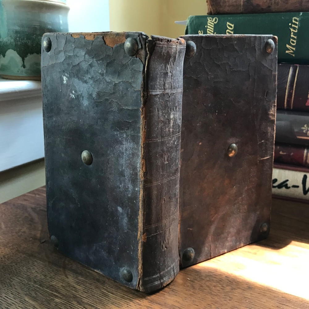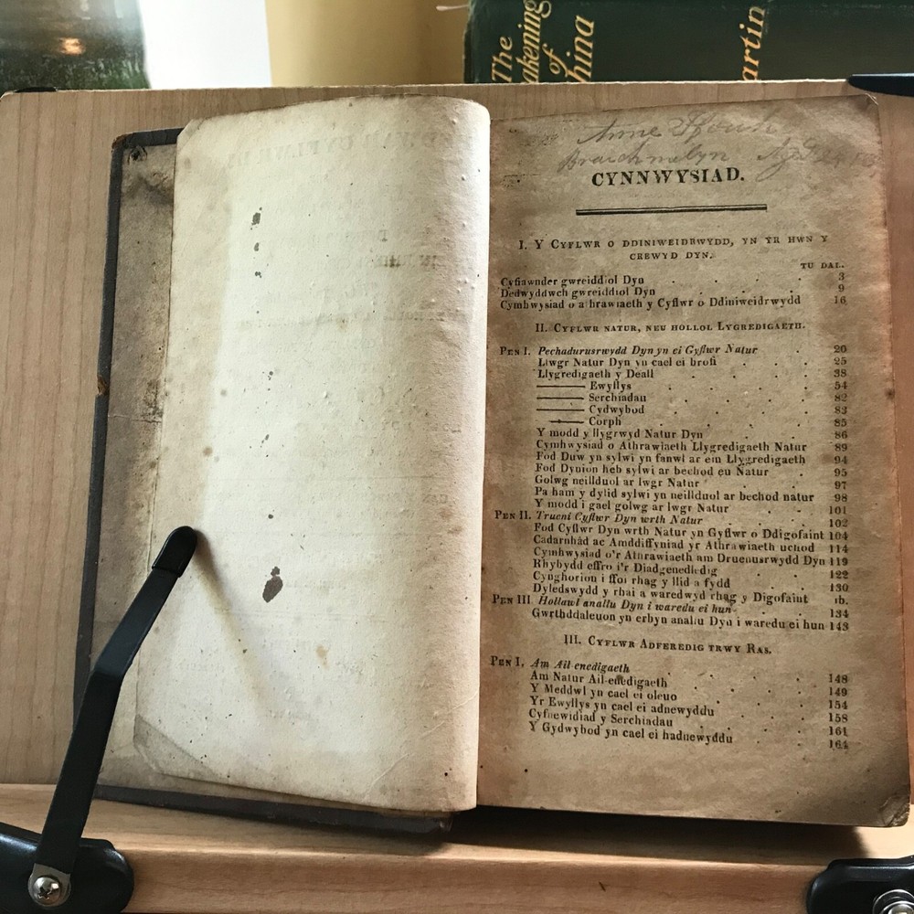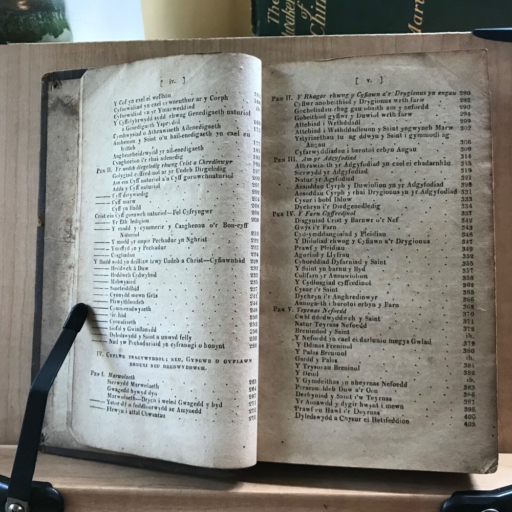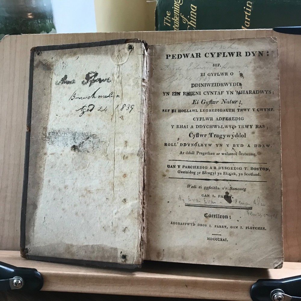 Pedwar cyflwr dyn : sef ei gyflwr o ddiniweidrwydd, ei gyflwr natur, ei gyflwr adferedig, a'i gyflwr tragywyddol, T. Boston, Caerlleon, Agraffwyd Dros I. Parray, 1821, 438 pp, Fford anffaeledig i foddlonrwydd dan flinderau gwladol a phersonol, Abenego Seller, Peter Williams, Published by John Jones, Llanrswt, 1830, 96 pp, Third title page is missing, incomplete, 107 pp, original leather binding, 7 x 4.25”, 12mo. In fair condition. Extremities worn with scuffing to tips and joints. Front board nearly detached, adhere to one cord. Desiccated and crackling to surface of leather overall with a small area of worming to front board top right corner. Tail is desiccated as well with loss. Head cracking with small tear at middle. Spine abraded overall. Leather darkened with old blooms. Old hand ownership dated 1839 on front pastedown. Interior toned with somewhat brittle edges. Old newspaper clipping throughout. Repairs to first leaf of third book.. missing title. Front board detached. Ink stain to repair. Leaf 107 of last text is repaired poorly with old hand notations. Overall quite worn and well-loved. Binding remains intact. Please see photos. Three scarce Welsh theological titles bound in one interesting tooled leather binding. Very rare. Found in Welsh settlements of Upstate New York. COLR1831DLMZ