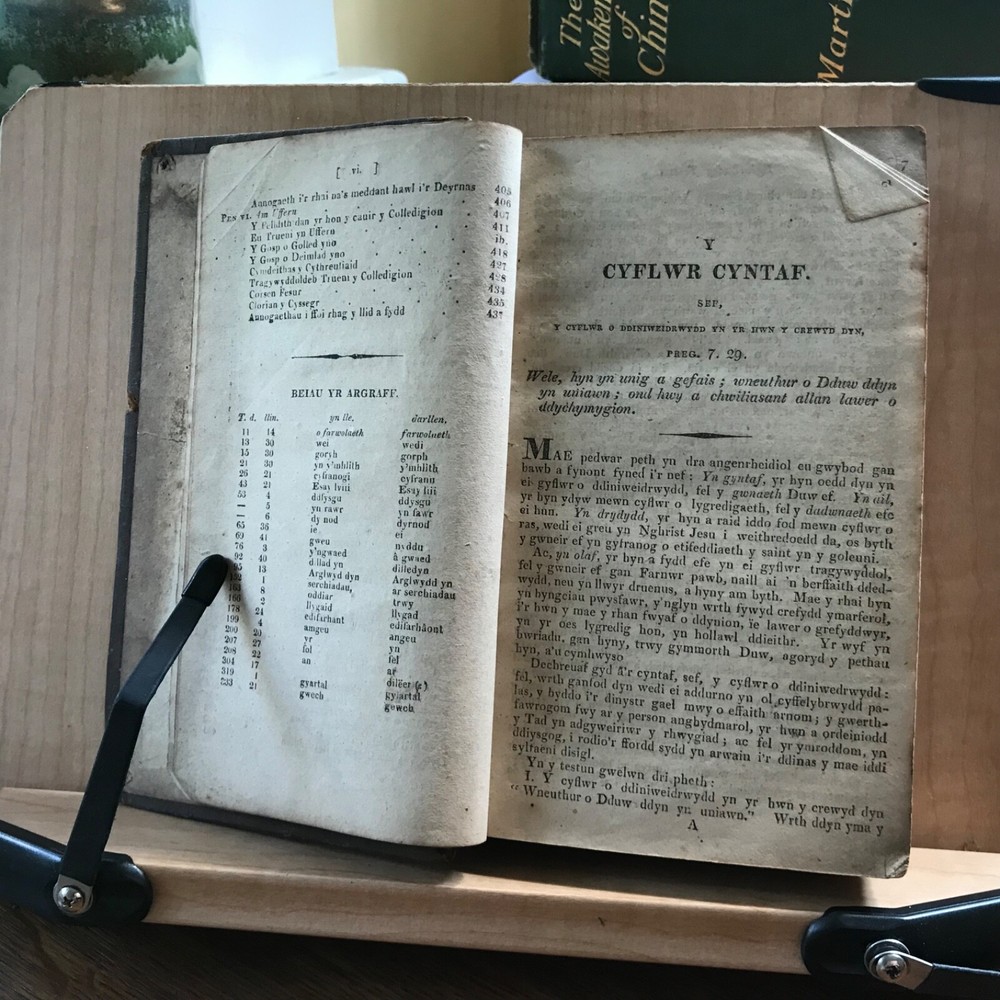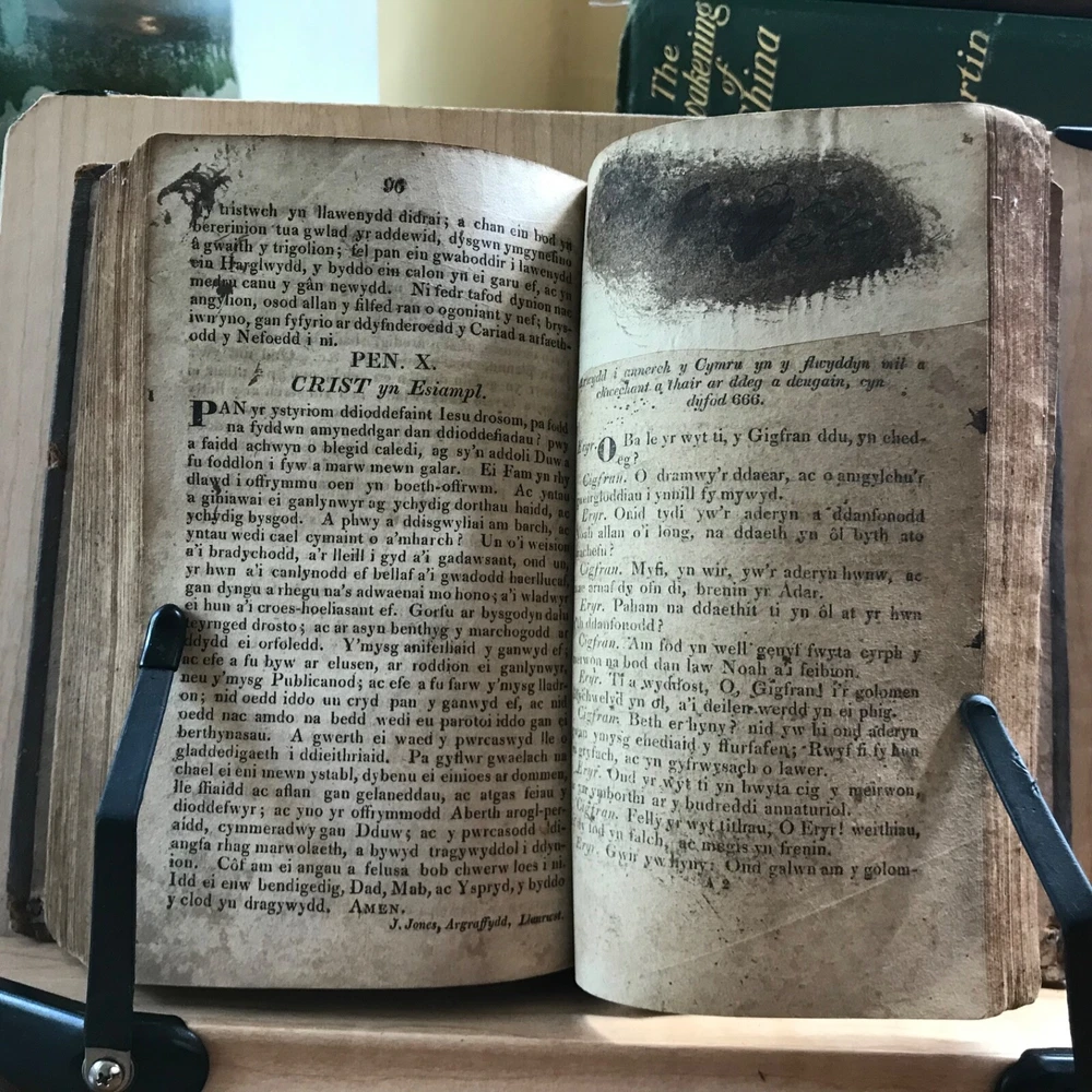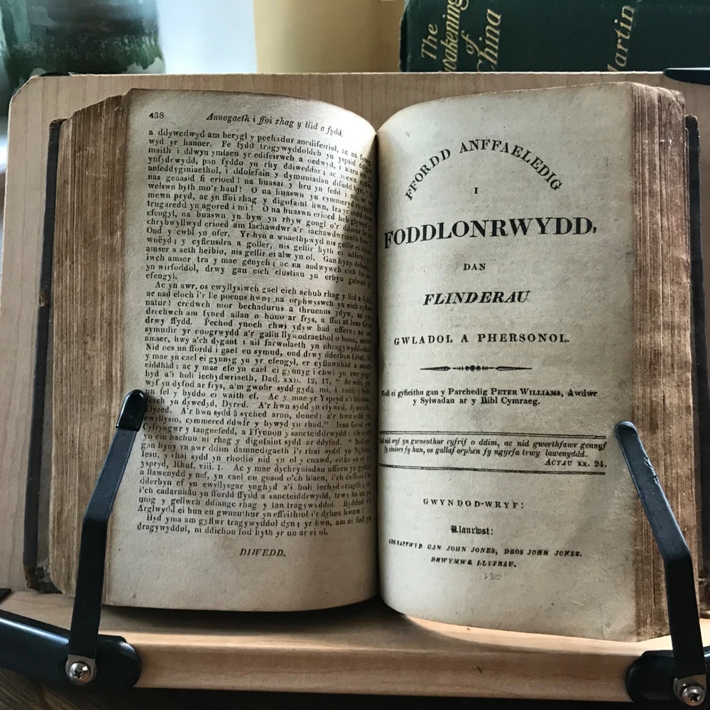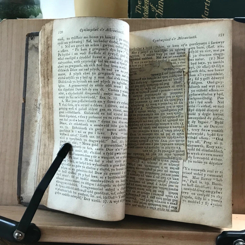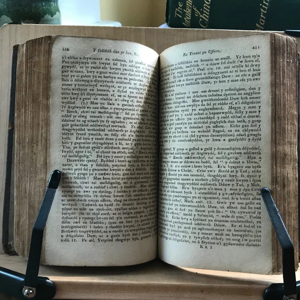 Pedwar cyflwr dyn : sef ei gyflwr o ddiniweidrwydd, ei gyflwr natur, ei gyflwr adferedig, a'i gyflwr tragywyddol, T. Boston, Caerlleon, Agraffwyd Dros I. Parray, 1821, 438 pp, Fford anffaeledig i foddlonrwydd dan flinderau gwladol a phersonol, Abenego Seller, Peter Williams, Published by John Jones, Llanrswt, 1830, 96 pp, Third title page is missing, incomplete, 107 pp, original leather binding, 7 x 4.25”, 12mo. In fair condition. Extremities worn with scuffing to tips and joints. Front board nearly detached, adhere to one cord. Desiccated and crackling to surface of leather overall with a small area of worming to front board top right corner. Tail is desiccated as well with loss. Head cracking with small tear at middle. Spine abraded overall. Leather darkened with old blooms. Old hand ownership dated 1839 on front pastedown. Interior toned with somewhat brittle edges. Old newspaper clipping throughout. Repairs to first leaf of third book.. missing title. Front board detached. Ink stain to repair. Leaf 107 of last text is repaired poorly with old hand notations. Overall quite worn and well-loved. Binding remains intact. Please see photos. Three scarce Welsh theological titles bound in one interesting tooled leather binding. Very rare. Found in Welsh settlements of Upstate New York. COLR1831DLMZ