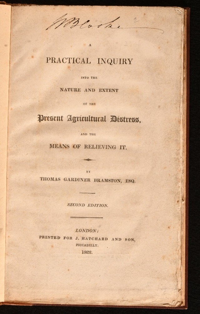 Click here to see our other books! A Practical Inquiry into the Nature and Extent of the Present Agricultural Distress, and the Means of Relieving it Thomas Gardiner Bramston 1822 J. Hatchard and Son : London 9" by 5.5" [4], 53, [3pp] SUMMARY A very scarce agricultural treatise by Thomas Gardiner Bramston, looking into the contemporary agricultural distress and how to solve it. Early Edition,Leather Binding,Very Scarce Overall Condition: Very Good Indeed This book weighs 0.5 KG when packed UK Postage: £ 3.99 US Postage: £ 15.99 EU Postage : £ 13.99 European Postage: £ 14.99 Asia Postage: £ 18.99 Worldwide Postage: £ 19.99 DESCRIPTION The second edition of this very scarce work. An enquiry by Thomas Gardiner Bramston in which he explores the agricultural distress of the first two decades of the nineteenth century. The first half of the nineteenth century saw a lot of agricultural distress, in part due to the Enclosure Acts and the Corn Laws. Enclosure in rural Britain led to riots and much social unrest. The Corn Laws were high tariffs and trade restrictions brought in on imported food and corn, between the years 1815 and 1846. Bramston was a politician who later defended the Corn Laws. Two pages of publisher's adverts to the rear. CONDITION In a quarter calf binding with cloth to the boards. Externally, smart. Light rubbing to the leather. Fading to the joints. Stamp to the front paste down. Internally, firmly bound. Pages are very lightly age-toned and generally clean with only a few spots and handling marks. Pages unopened to the top edge. Prior owner's ink inscription to the head of the title page. Overall Condition: Very Good Indeed GLOSSARY OF TERMS Overall Condition (Dustwrapper condition rating is shown after that for the book itself, where a dustwrapper is present) Fine - Very well preserved copy showing very little wear Very Good Indeed - Only one or two minor faults, really a very attractive copy Very Good - Quite a wide term meaning no major faults but probably several smaller ones often expected given the age of the book, but still a respectable copy Good - Meaning not very good. Some more serious faults as will be described in the condition report under 'condition' Good Only - Meaning one or more faults that could really do with repair Fair - As with good only above but with other faults leaving a compromised copy even after repair Poor - Really bad and possibly seriously incomplete. We only sell books in this condition where their rarity or value makes them attractive none the less. Major defects will be described. GUARANTEE We offer a full money back guarantee on our descriptions. Please ask for details and conditions. We prefer PAYPAL. If you pay via PAYPAL we will post the item off the same or the next working day with the postage you have selected. Please note we cannot accept USD cheques