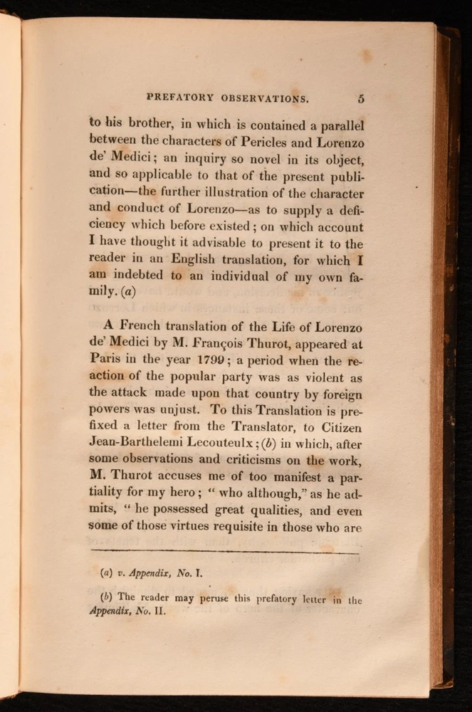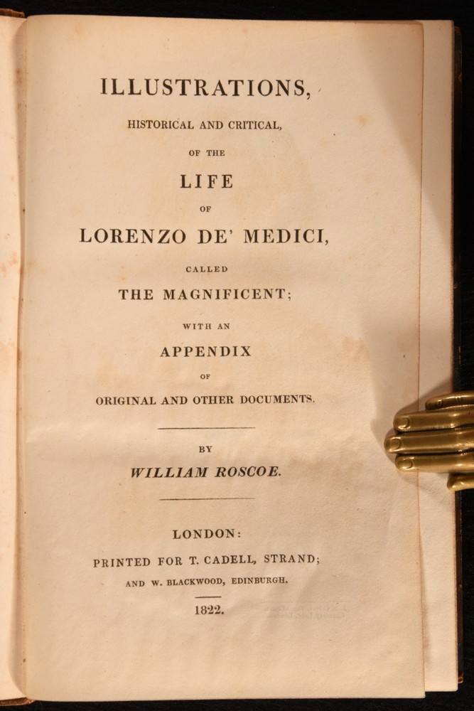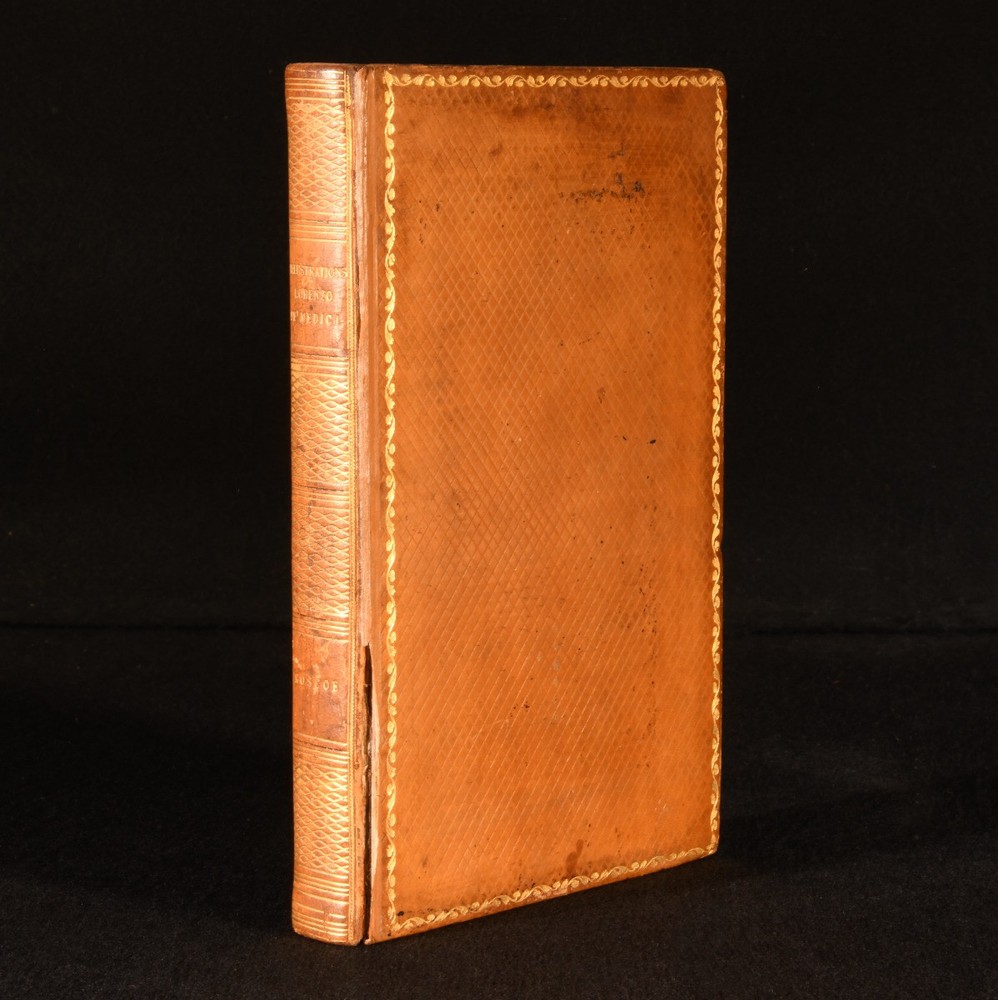 Click here to see our other books! Illustrations, Historical and Critical, of The Life of Lorenzo de' Medici William Roscoe 1822 T. Cadell : London 9" by 6" 4-168pp SUMMARY An illustrated biography on the life and work of Lorenzo de' Medici, one of the most important figures of the Italian Renaissance. Illustrated,Leather Binding Overall Condition: Good This book weighs 1 KG when packed UK Postage: £ 3.99 US Postage: £ 22.99 EU Postage : £ 16.99 European Postage: £ 17.99 Asia Postage: £ 22.99 Worldwide Postage: £ 28.99 DESCRIPTION Illustrated with a portrait frontispiece, one folding plate, and two further plates. Collated, complete. A detailed biography of Lorenzo de' Medici from historian, art collector, botanist, and MP William Roscoe, one of England's first abolitionists. A fascinating account of the life of the Italian statesman the de facto ruler of the Florentine Republic. Lorenzo is regarded as one of the most powerful and influential patrons of the Renaissance movement within Italy, and was known as Lorenzo the Magnificent. Retaining the original half title. Former owner's inscription to verso of front free endpaper. Written by William Roscoe, best known for this important work and the poem 'The Butterfly's Ball'. Roscoe was also one of England's first abolitionists. CONDITION In a full calf binding, with gilt detailing. Light rubbing to back strip. Front joint starting, with neat tape repair running the length of the front joint, with tape lifting to the tail. Board firmly held. Inscription to verso of front free endpaper. Internally, firmly bound. Pages bright, with significant spotting throughout. Significant tide marks to plates. Overall Condition: Good GLOSSARY OF TERMS Overall Condition (Dustwrapper condition rating is shown after that for the book itself, where a dustwrapper is present) Fine - Very well preserved copy showing very little wear Very Good Indeed - Only one or two minor faults, really a very attractive copy Very Good - Quite a wide term meaning no major faults but probably several smaller ones often expected given the age of the book, but still a respectable copy Good - Meaning not very good. Some more serious faults as will be described in the condition report under 'condition' Good Only - Meaning one or more faults that could really do with repair Fair - As with good only above but with other faults leaving a compromised copy even after repair Poor - Really bad and possibly seriously incomplete. We only sell books in this condition where their rarity or value makes them attractive none the less. Major defects will be described. GUARANTEE We offer a full money back guarantee on our descriptions. Please ask for details and conditions. We prefer PAYPAL. If you pay via PAYPAL we will post the item off the same or the next working day with the postage you have selected. Please note we cannot accept USD cheques