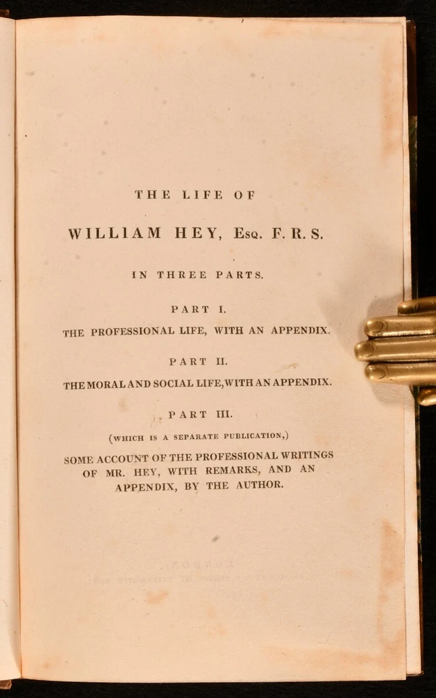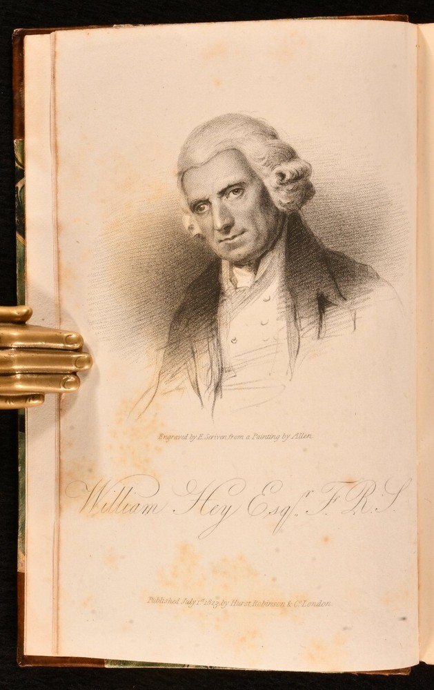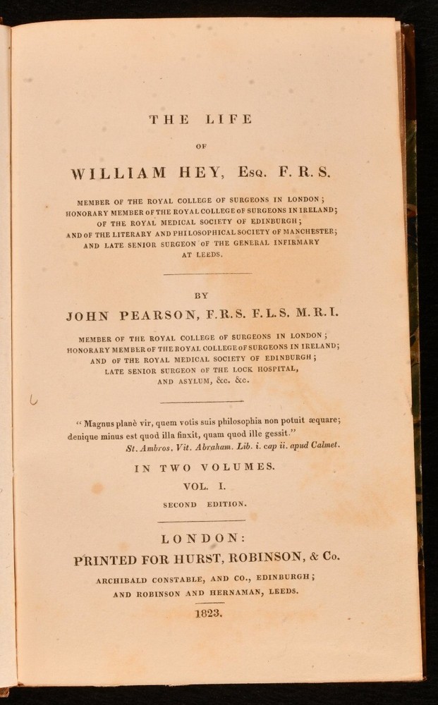 Click here to see our other books! The Life of William Hey, Esq. F. R. S. Member of the Royal College of Surgeons in London; Honorary Member of the Royal College of Surgeons in Ireland; Of the Royal Medical Society of Edinburgh; And of the Literary and Philosophical Society of Manchester; and Late Senior Surgeon of the General Infirmary of Leeds. John Pearson 1823 Hurst, Robson, & Co. : London 7.5" by 4.5" lxxxviii, 200; 296pp. SUMMARY The second edition of this scarce biography on the life of renown surgeon William Hey, written by John Pearson in two parts and bound in half calf. Early Edition,Illustrated,Leather Binding,Scarce Overall Condition: Very Good This book weighs 0.75 KG when packed UK Postage: £ 3.99 US Postage: £ 19.99 EU Postage : £ 15.99 European Postage: £ 16.99 Asia Postage: £ 21.99 Worldwide Postage: £ 25.99 DESCRIPTION The second edition. Scarce. Two volumes. Complete in two. An additional but separate third volume was also published including the professional writings of Hey but was not included in this first two part publication. Bound in half calf with marbled paper to the boards. Illustrated with a frontispiece portrait to 'Volume I'. This biographical work was written by British surgeon John Pearson. Pearson studied under William Hey and wrote this biography detailing the life of his tutor, including details of his professional and social life. CONDITION Bound in half calf with marbled paper to the boards. Externally generally smart with rubbing to the boards slight bumping to the extremities of the boards, fading to the spine and the odd minor mark. Light offsetting to the extremities and light spotting to the endpapers. Internally firmly bound with generally bright and lightly age toned pages with the odd spot, heavier to the front to 'Volume I', with offsetting to extremities to the front and rear to both volumes. Overall Condition: Very Good GLOSSARY OF TERMS Overall Condition (Dustwrapper condition rating is shown after that for the book itself, where a dustwrapper is present) Fine - Very well preserved copy showing very little wear Very Good Indeed - Only one or two minor faults, really a very attractive copy Very Good - Quite a wide term meaning no major faults but probably several smaller ones often expected given the age of the book, but still a respectable copy Good - Meaning not very good. Some more serious faults as will be described in the condition report under 'condition' Good Only - Meaning one or more faults that could really do with repair Fair - As with good only above but with other faults leaving a compromised copy even after repair Poor - Really bad and possibly seriously incomplete. We only sell books in this condition where their rarity or value makes them attractive none the less. Major defects will be described. GUARANTEE We offer a full money back guarantee on our descriptions. Please ask for details and conditions. We prefer PAYPAL. If you pay via PAYPAL we will post the item off the same or the next working day with the postage you have selected. Please note we cannot accept USD cheques